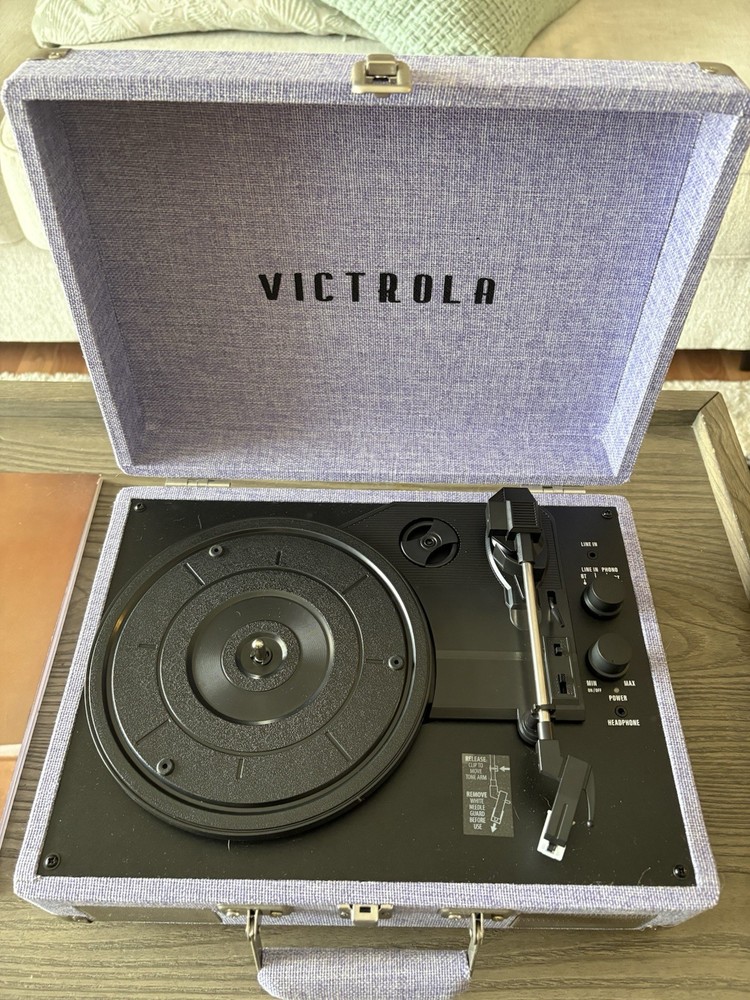 Selling a Victrola Record Player, it has been used one time and works perfectly, comes with everything in photo including Billie Ellish Album. Willing to negotiate! (Missing power cable)