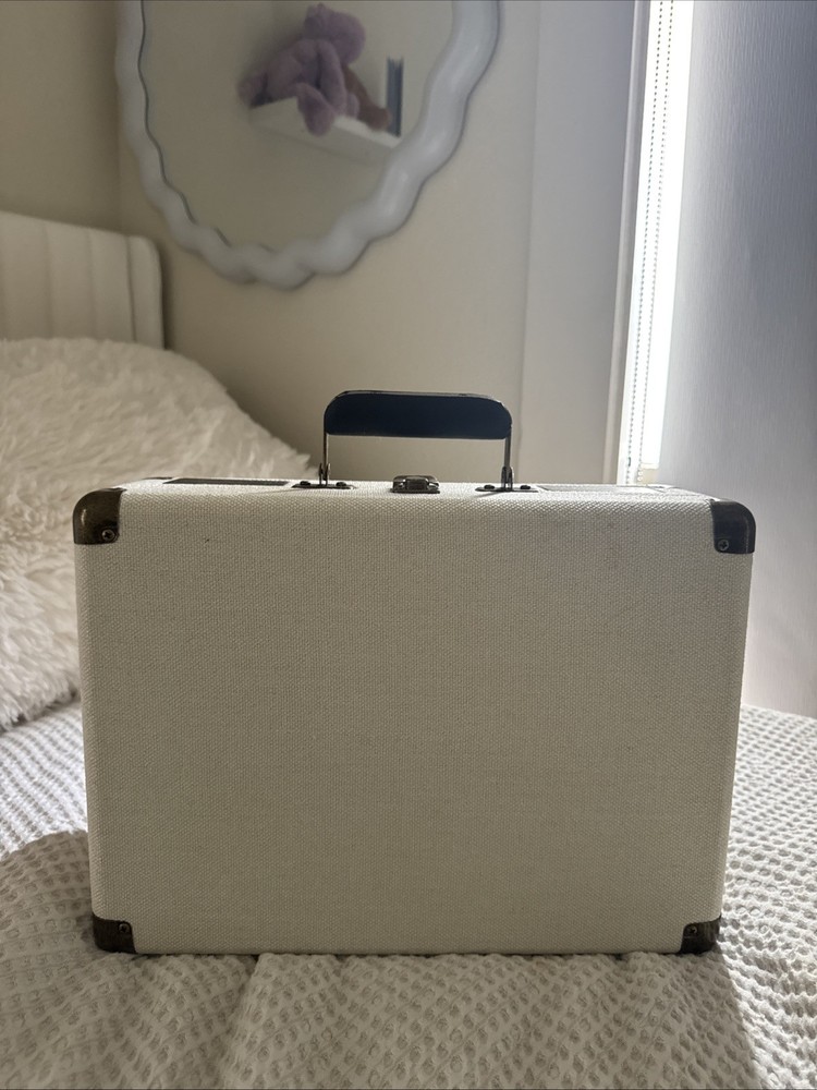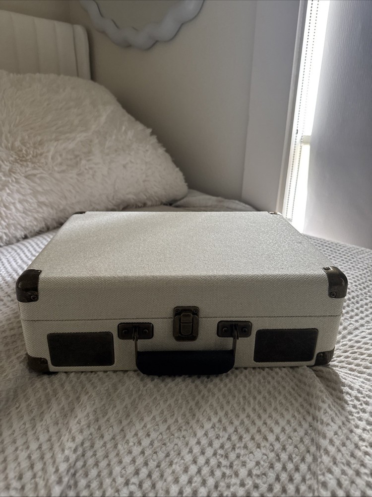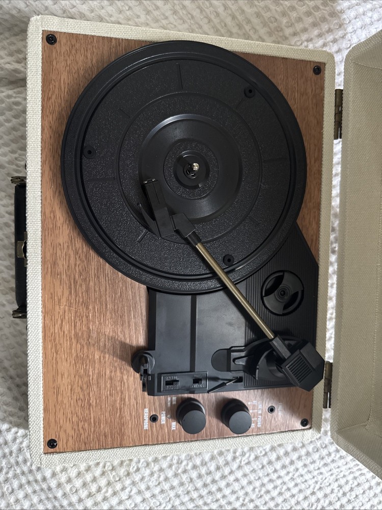 The Victrola Journey Bluetooth Portable Suitcase Record Player is a stylish and versatile music device featuring built-in speakers for high-quality audio. With a beige color and compact dimensions of 14 inches in length and 10 inches in width, it is perfect for on-the-go music enthusiasts. This portable record player also offers Bluetooth connectivity for modern convenience and includes speed settings of 45RPM, 78RPM, and 33.3RPM for precise playback. The Victrola brand ensures quality, backed by a 1-year manufacturer warranty, making this a reliable choice for music lovers. This turn table has been used a handful of times and is in brand new condition.