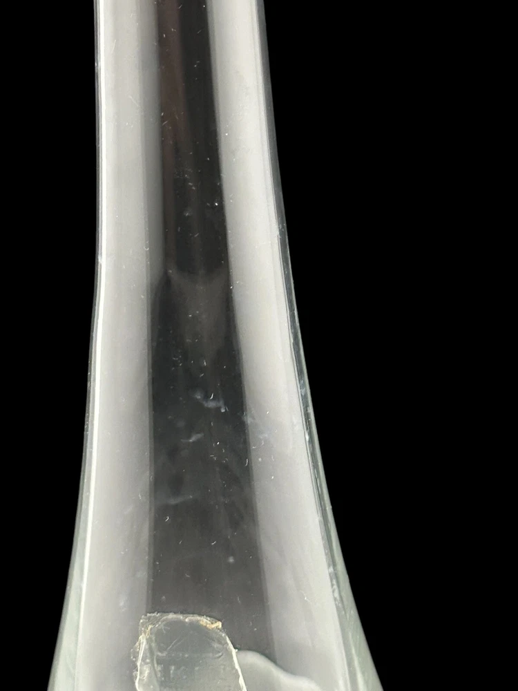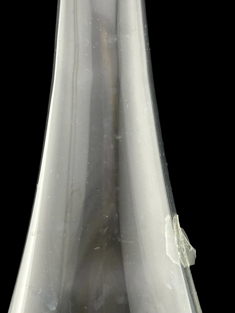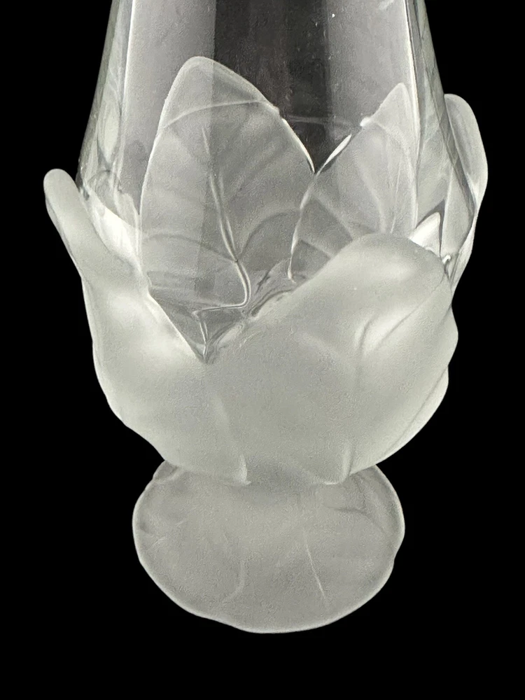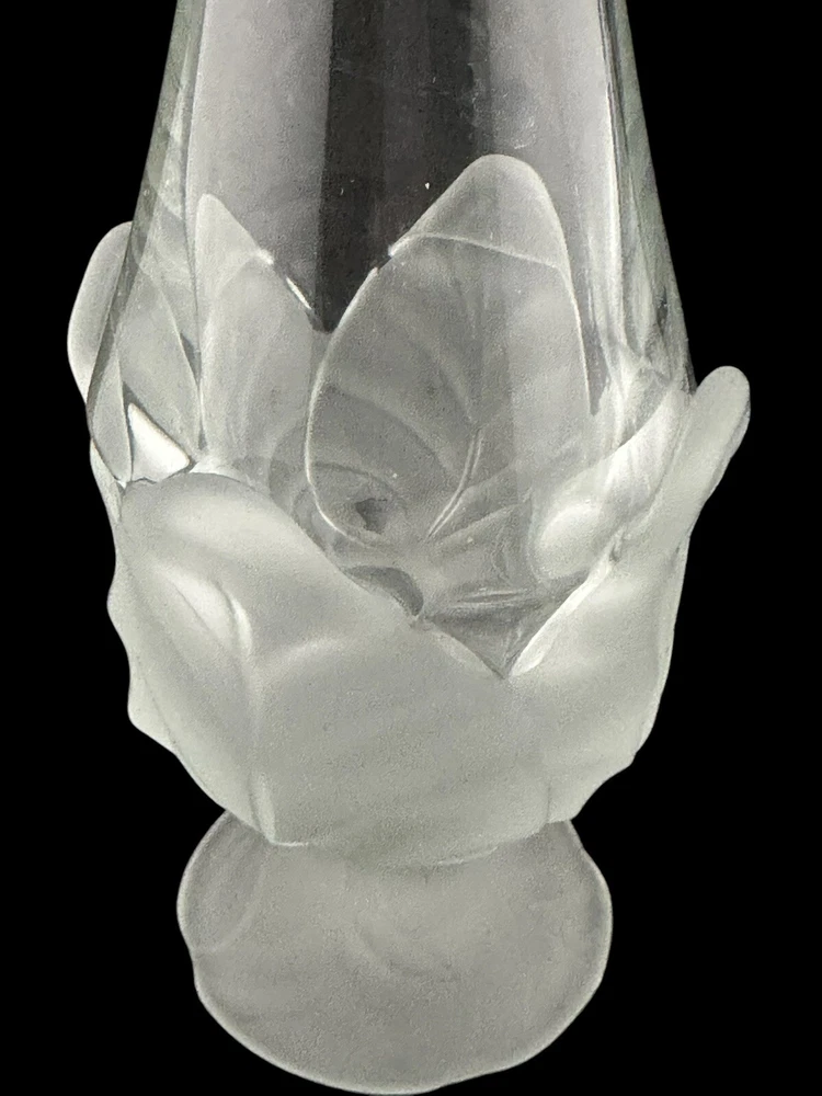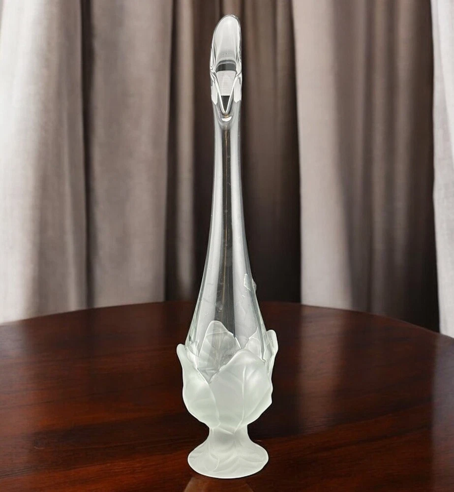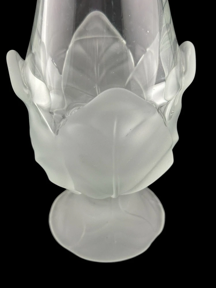 Viking Epic Leaf Cabbage Swung Vase Clear Satin Glass Stretch 15 3/4” Tall Vtg The original sticker has rolled edges. There are water spots on the inside. If you have the right cleaning products and equipment that lets you get inside the vase, you should be able to get them cleared out. Approximate Dimensions: 15 3/4” tall