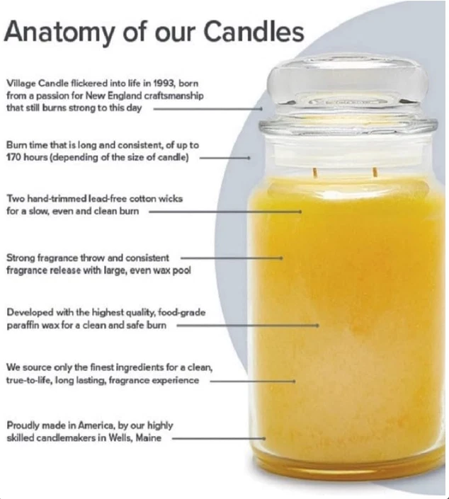About this item Fragrance Notes of Warm and Crusty Buttered Bread This golden brown candle is made with the highest quality food-grade paraffin wax for a clean and even burn. We source only the finest ingredients for a true-to-life, long lasting fragrance experience. Pioneered by Village Candle, our dual wick technology is a unique design that ensures a cleaner, more efficient burn, as well as a superior fragrance experience. Before reaching your home our lead-free cotton wicks are hand-trimmed by our team. Our candles have a long and consistent burn time of up to 170 hours (depending on the size of candle). Burn your candle for a minimum of 2 hours and no more than 4 hours, or until you reach a full wax pool. Dimensions are 3.8''L 3.8''W 6.75''H. Born from a passion for New England craftsmanship that still burns strong to this day. Our candles are proudly made in America by our highly skilled candlemakers in Wells, Maine. From our Village to your village remains our inspiration all these years.
