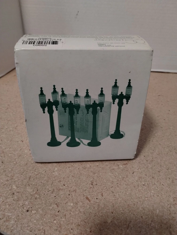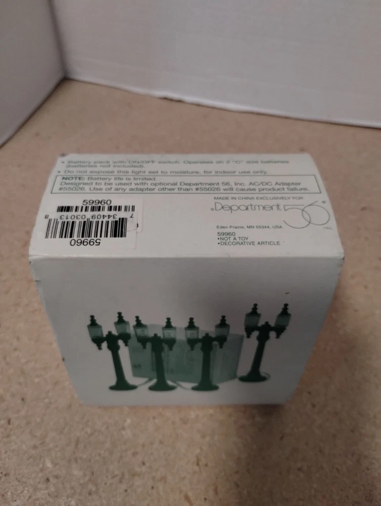 Enhance your holiday village display with these elegant double street lamps. Battery-operated and AC/DC compatible, they add a realistic touch to your decor. • Includes 4 double street lamps • Requires batteries or AC/DC adapter (not included) • Decorative and functional design • Compatible with Department 56 village collections Box shows minor wear, contents appear unused. Box dimensions: 5 x 5 x 3 inches.