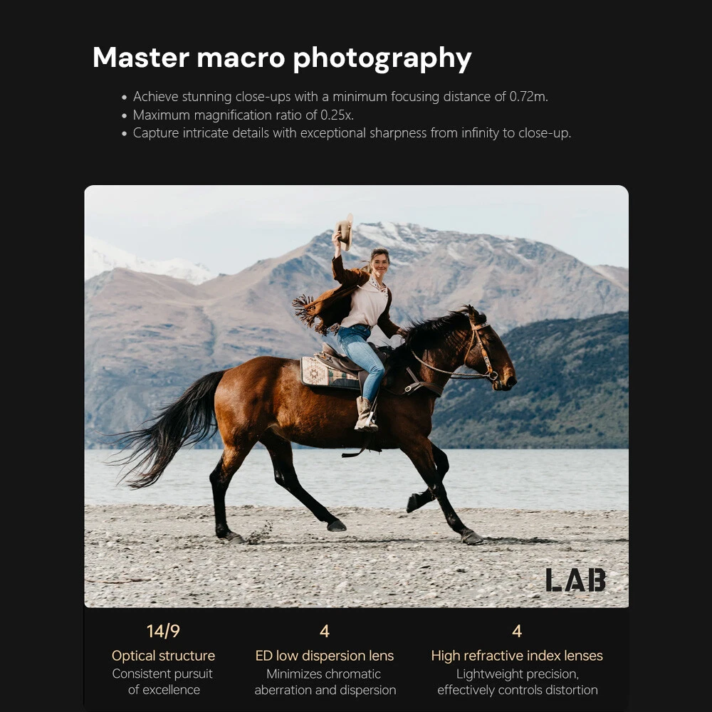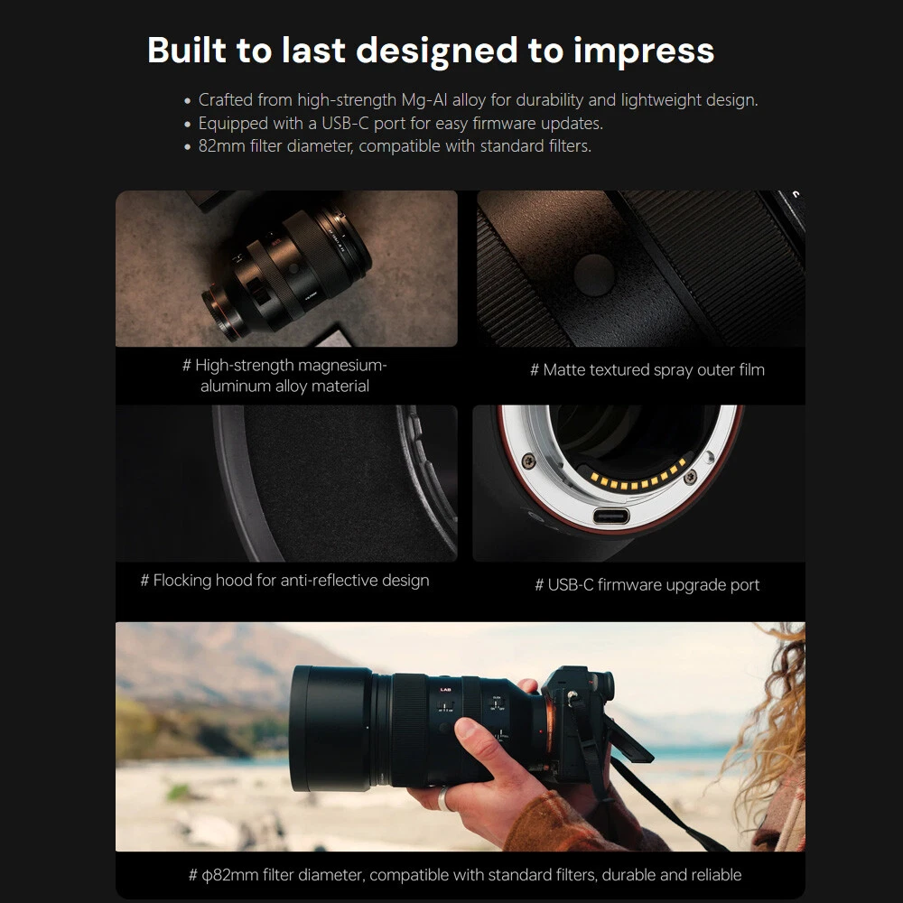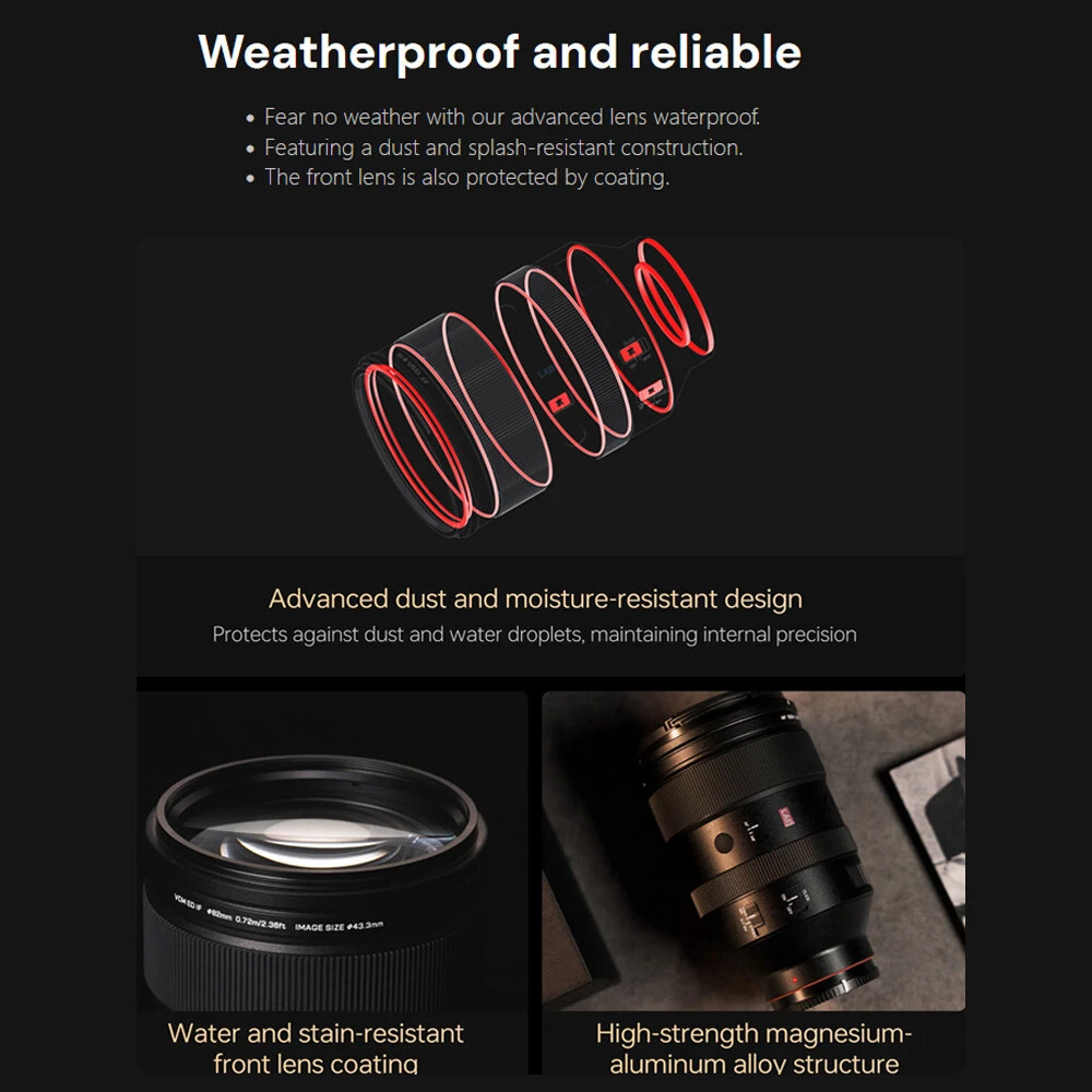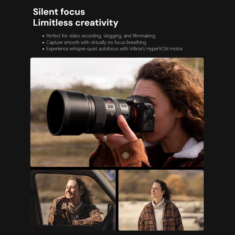 Viltrox AF 135mm F1.8 LAB Full Frame Lens For Sony E-Mount New IN STOCK Outstanding Resolution Maintains sharpness from center to edges across the focal range, capturing fine textures even at maximum aperture. Efficient Autofocus Equipped with patented HyperVCM motor for fast, precise, and quiet autofocus—perfect for capturing fleeting moments. F1.8 Aperture & Dreamy Bokeh The 11-blade aperture creates soft, beautiful background bokeh, with excellent low-light clarity. Professional Control Features Lens Mount: E-mount Lens Elements : 9/4 Focal Length: 135mm Viewing Angle: 19.04° Aperture: F1.8-F16 Number of Aperture Blades: 11 Shooting Distance: 0.72m-∞ Focus Mechanism: Internal focus Focus Motor: VCM Focus Mode : MF,AF Max.magnification : 0.25x Lens Size: Φ93x145.7mm Weight : ≈1235g(bare lens) Filter Size: Φ82mm