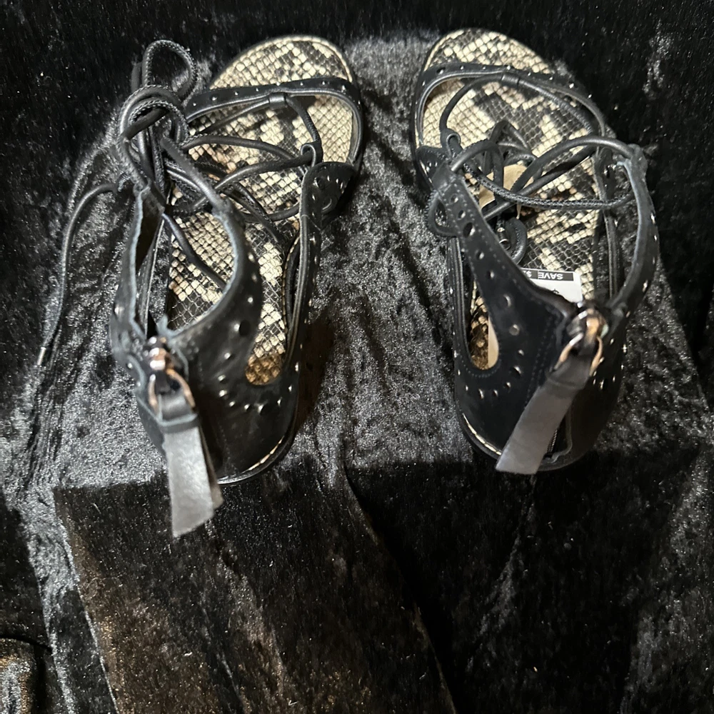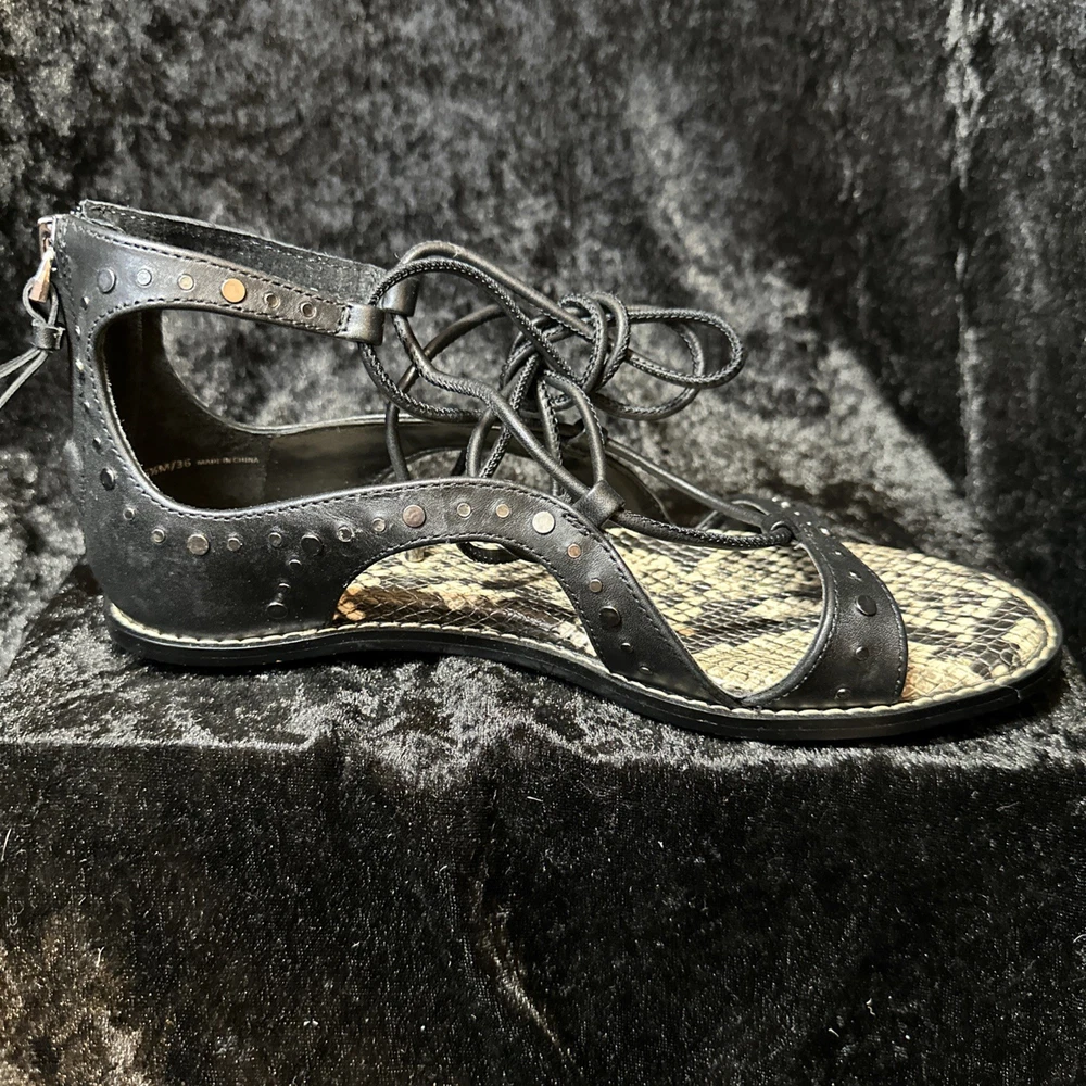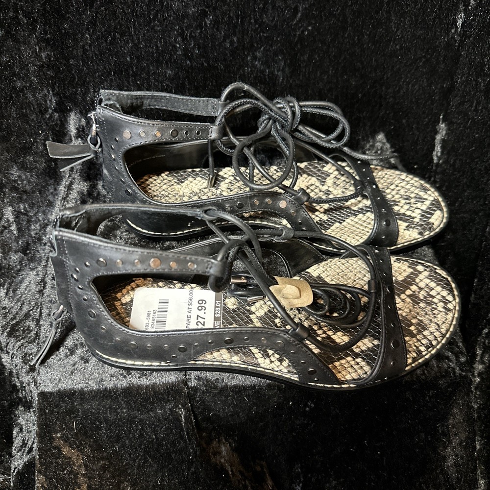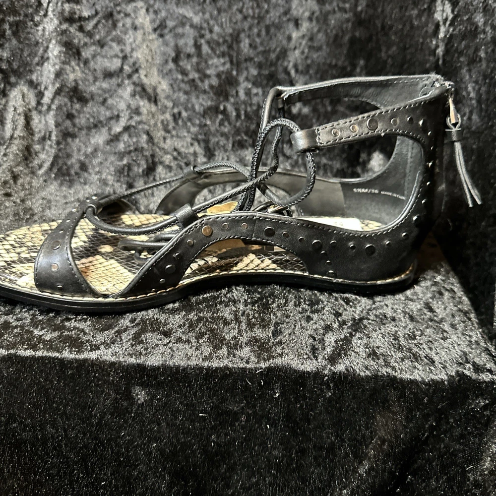 Elevate your shoe game with these black flats from Vince Camuto. The open toe design and tie closure provide a sleek and comfortable fit, perfect for any occasion. The leather lining and rubber outsole ensure durability and long-lasting wear. Studded accents and a zipper add a touch of edginess to these classic flats, making them perfect for both casual and formal events. These lightweight and comfortable flats are perfect for any season, with a solid pattern that matches any outfit. The medium width and leather upper material make these shoes a must-have for any stylish woman's wardrobe. Don't miss out on the opportunity to add these versatile Vince Camuto flats to your shoe collection.