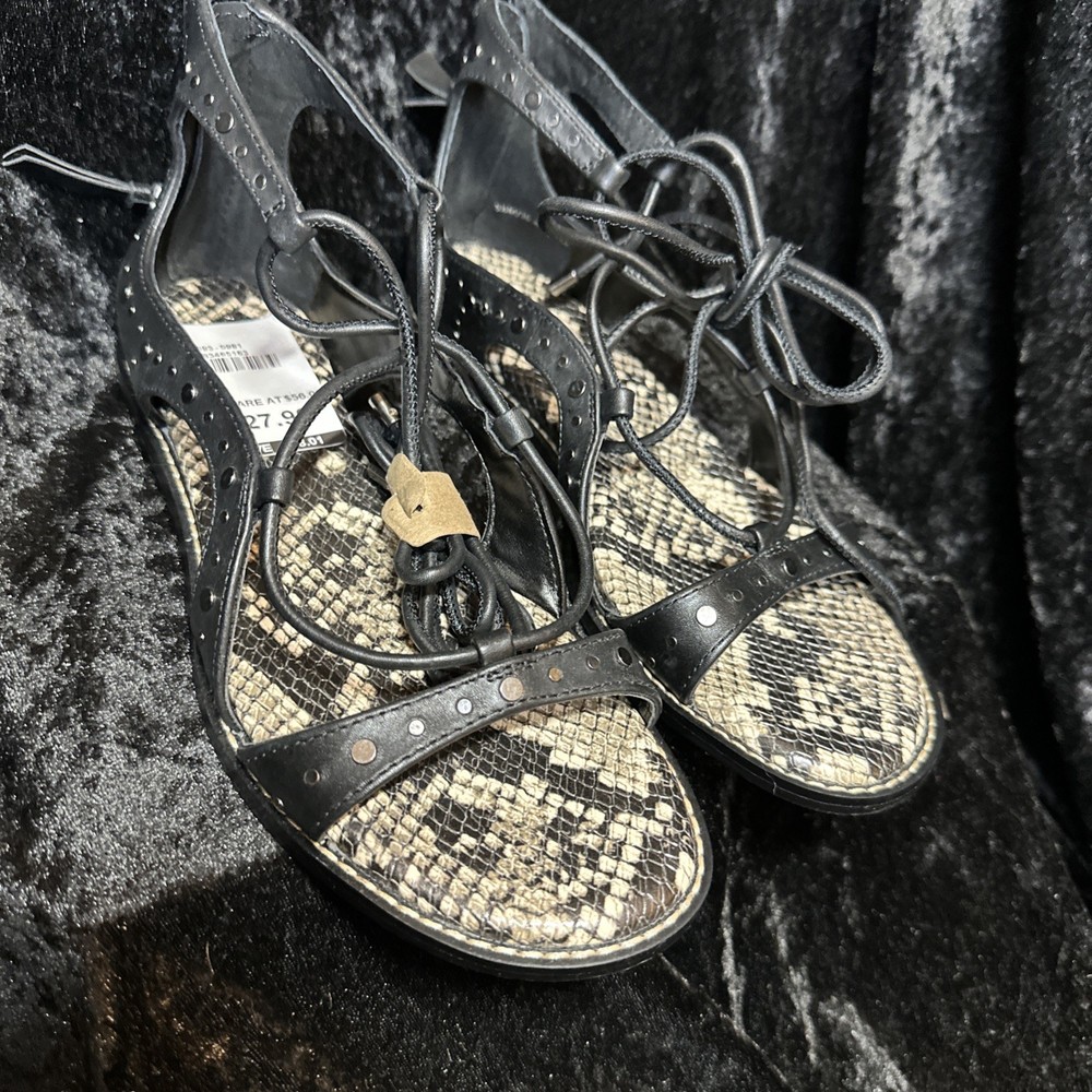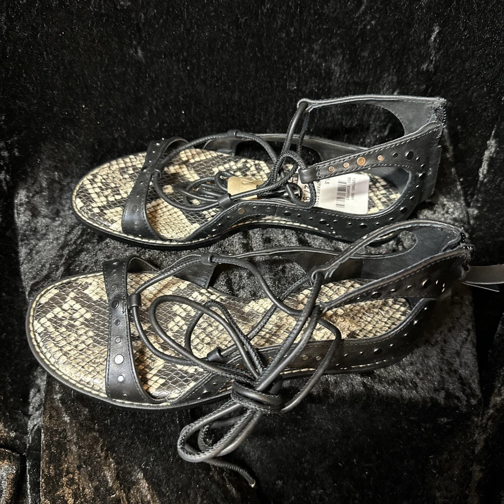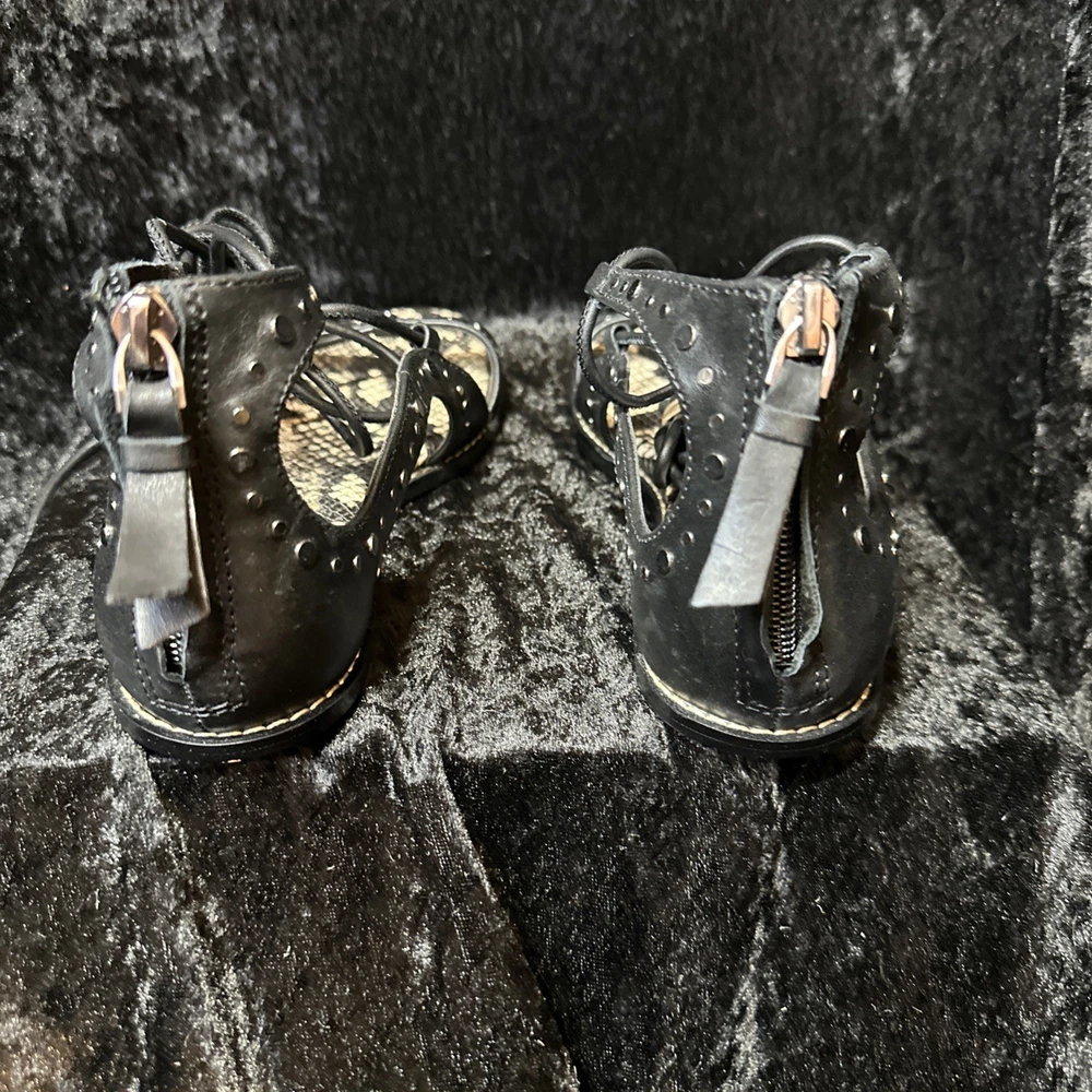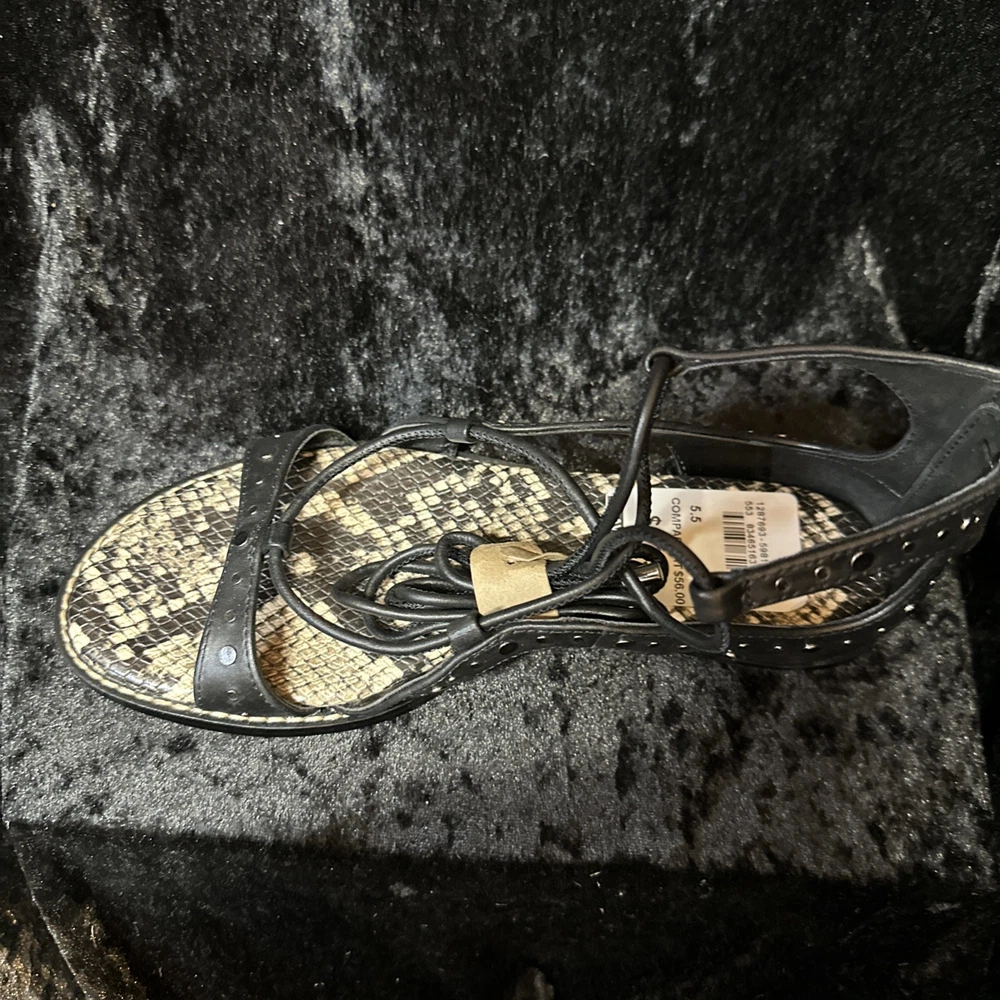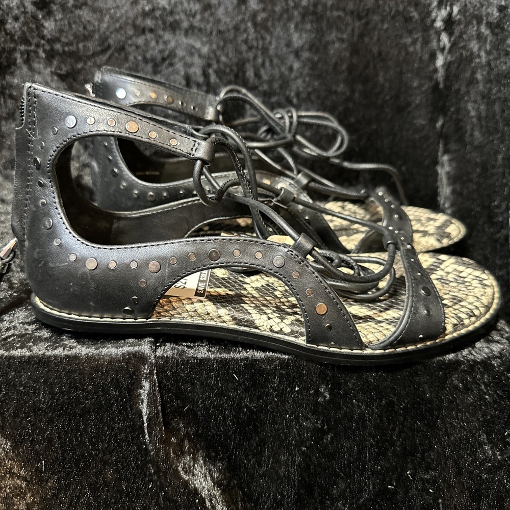 Elevate your shoe game with these black flats from Vince Camuto. The open toe design and tie closure provide a sleek and comfortable fit, perfect for any occasion. The leather lining and rubber outsole ensure durability and long-lasting wear. Studded accents and a zipper add a touch of edginess to these classic flats, making them perfect for both casual and formal events. These lightweight and comfortable flats are perfect for any season, with a solid pattern that matches any outfit. The medium width and leather upper material make these shoes a must-have for any stylish woman's wardrobe. Don't miss out on the opportunity to add these versatile Vince Camuto flats to your shoe collection.
