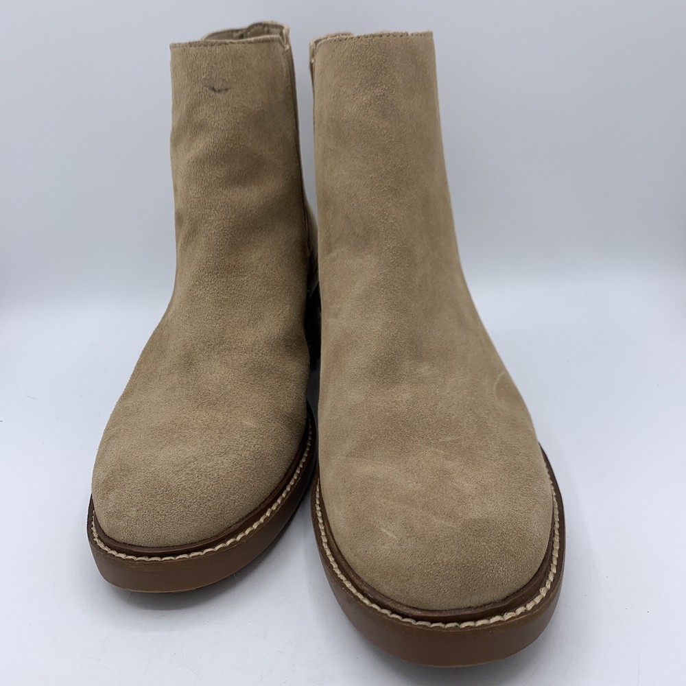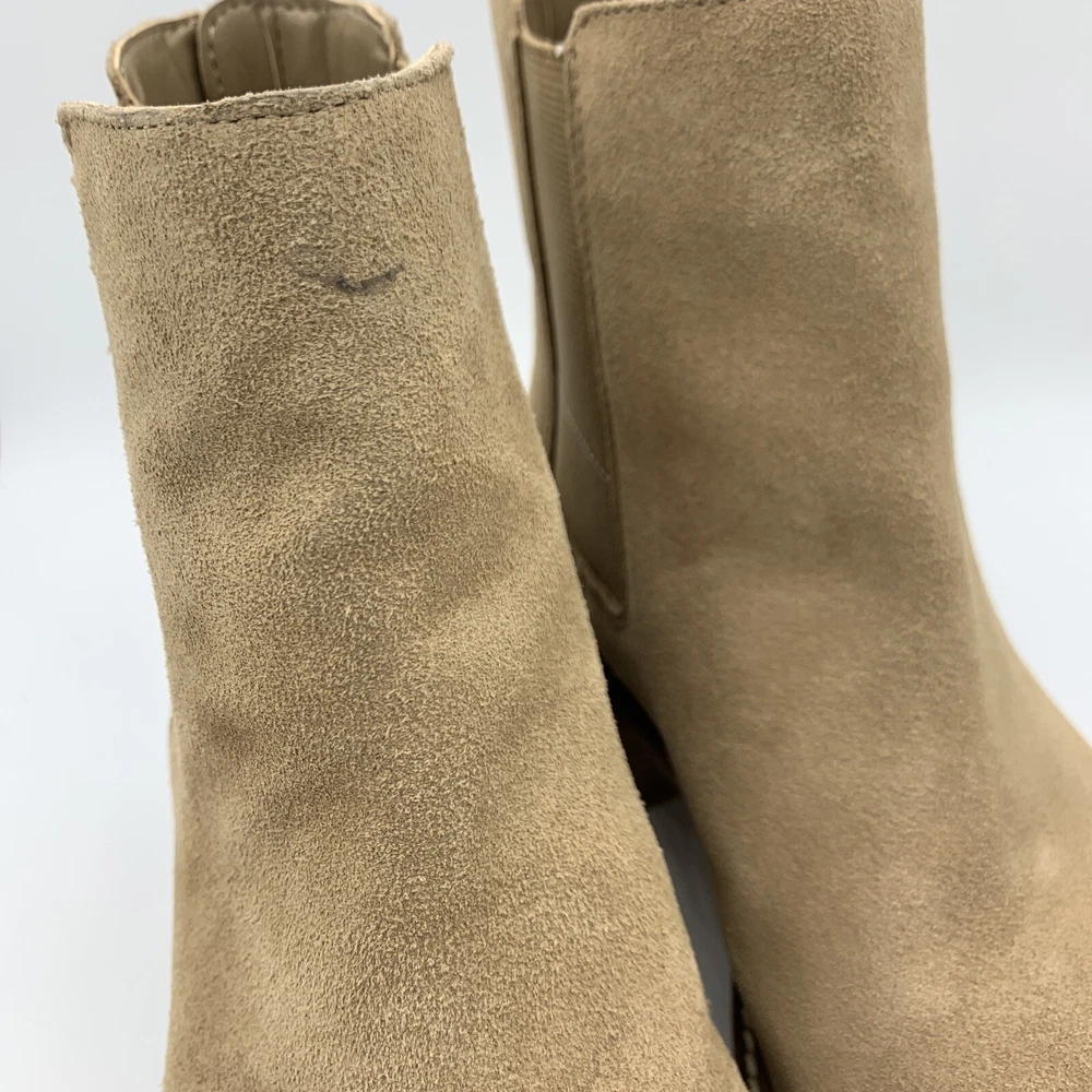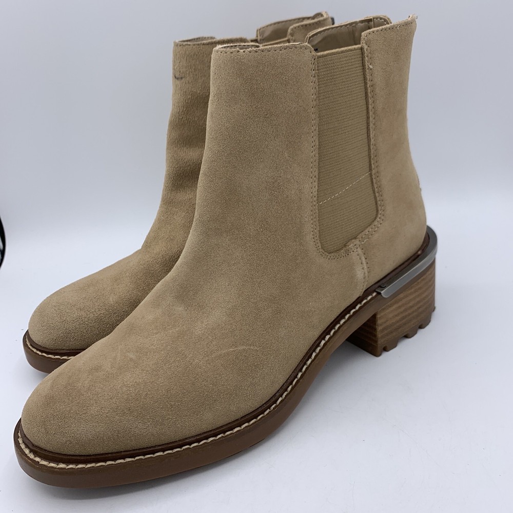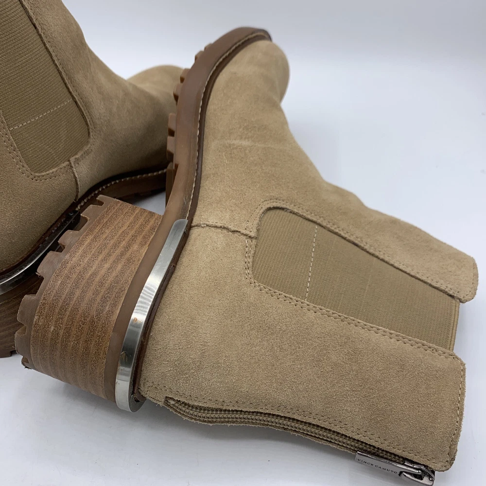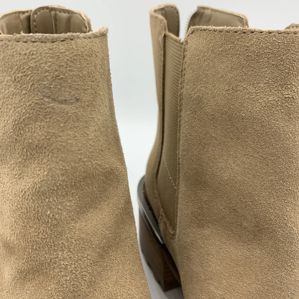 Elevate your shoe game with these stylish Vince Camuto Kelivena Women's Chelsea Boots. These ankle boots feature a round toe and a mid-height block heel for the perfect blend of comfort and style. The boots are made of tan suede leather and have a back zipper, double goring, and a back pull tab for easy on and off. The metal heel detail adds a touch of elegance, making these booties perfect for any occasion, from workwear to party/casual wear. The rubber outsole provides excellent traction, while the faux leather insole ensures a comfortable fit. These booties are perfect for winter, summer, fall, and spring, and are versatile enough to match any outfit. With their solid pattern, these ankle boots are sure to become a staple in your wardrobe. Pre-owned great condition. Small mark on the leather at the top of one boot. See last photo please.