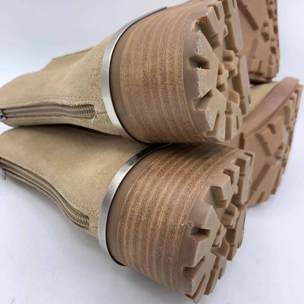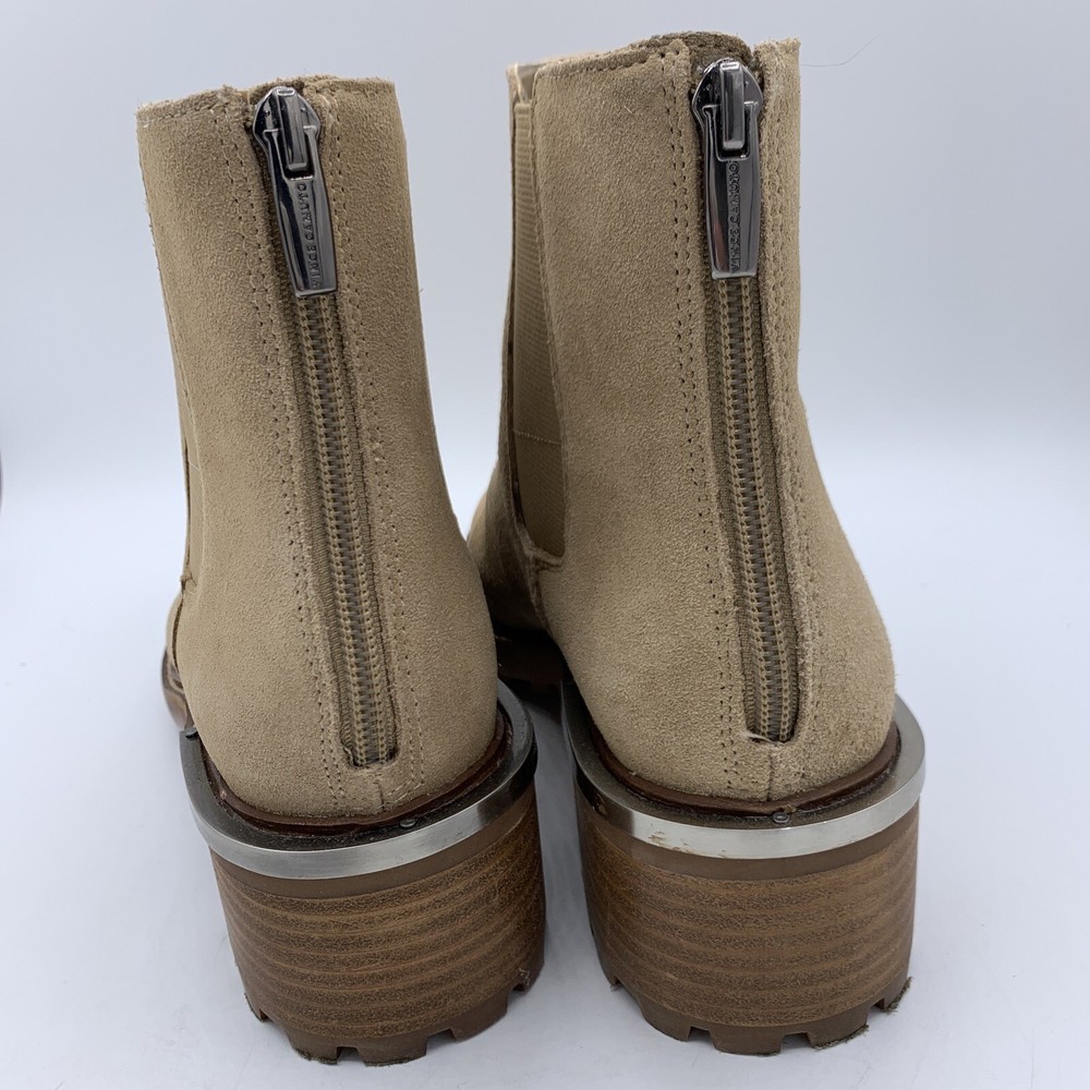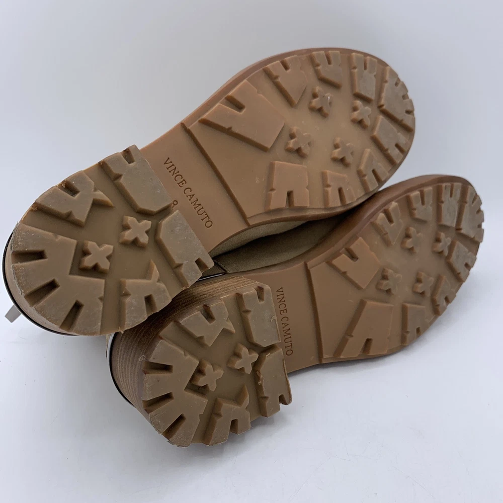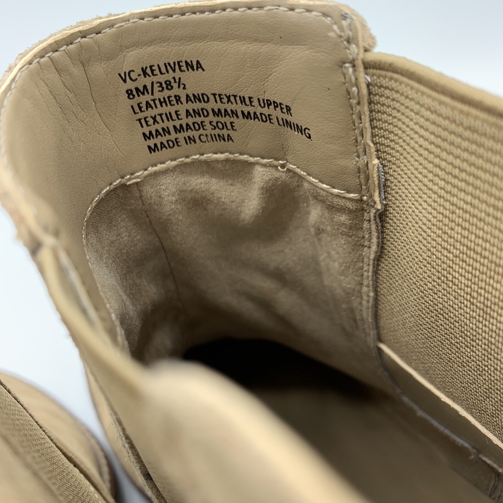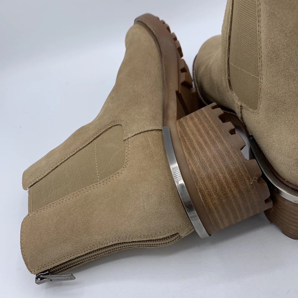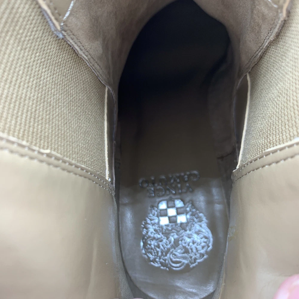 Elevate your shoe game with these stylish Vince Camuto Kelivena Women's Chelsea Boots. These ankle boots feature a round toe and a mid-height block heel for the perfect blend of comfort and style. The boots are made of tan suede leather and have a back zipper, double goring, and a back pull tab for easy on and off. The metal heel detail adds a touch of elegance, making these booties perfect for any occasion, from workwear to party/casual wear. The rubber outsole provides excellent traction, while the faux leather insole ensures a comfortable fit. These booties are perfect for winter, summer, fall, and spring, and are versatile enough to match any outfit. With their solid pattern, these ankle boots are sure to become a staple in your wardrobe. Pre-owned great condition. Small mark on the leather at the top of one boot. See last photo please.