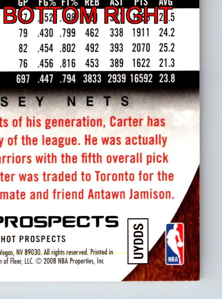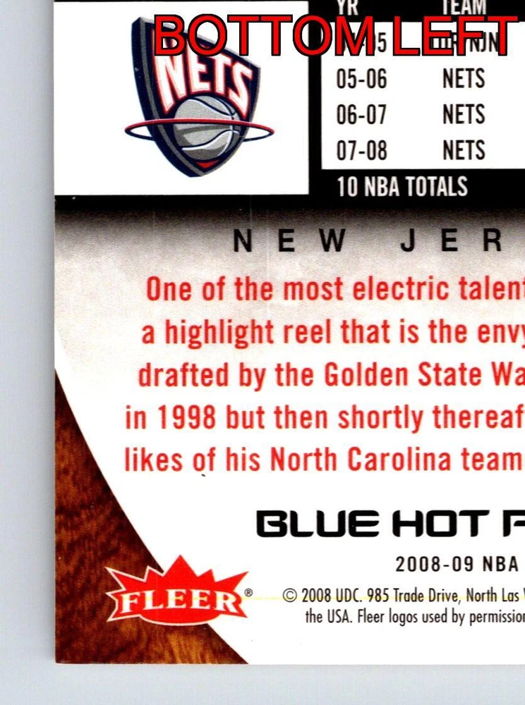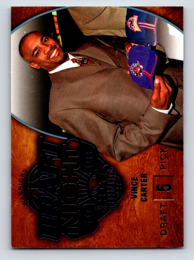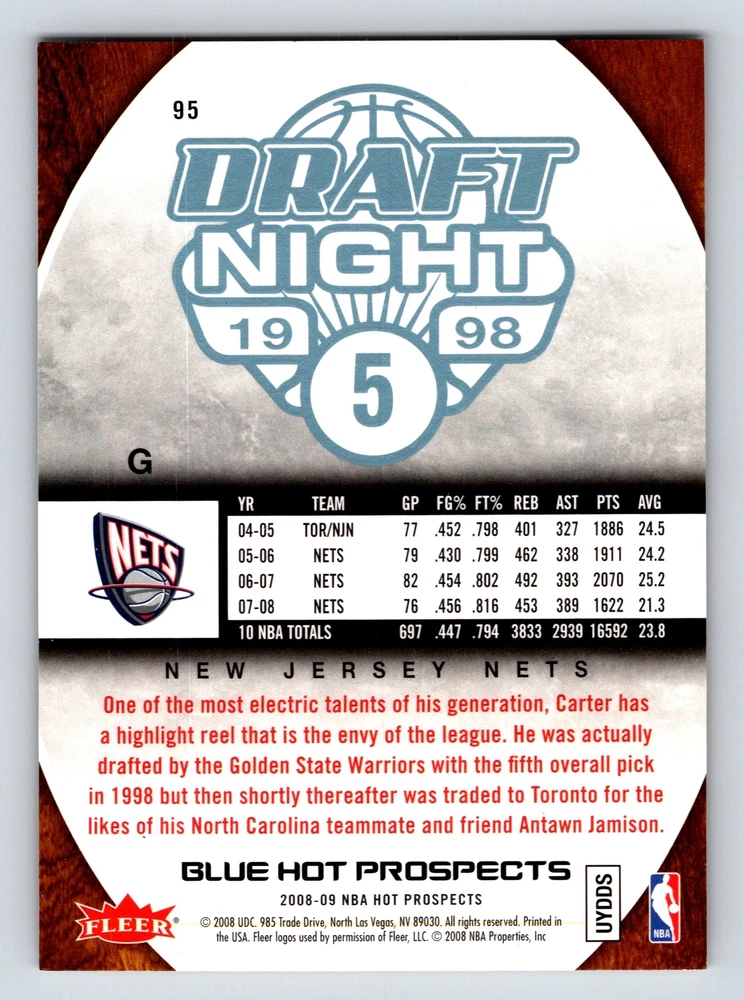 Item Description Title: Vince Carter Draft Night New Jersey Nets Fleer 2008 95 Card Basketball Description: This sports trading card features Vince Carter, prominently captured during the 1998 NBA Draft Night, where he was one of the most electrifying prospects of his generation. The card is part of the 2008-09 Fleer Blue Hot Prospects series. Carter, initially drafted by the Golden State Warriors, was quickly traded to the Toronto Raptors, marking the beginning of an illustrious career. Known for his incredible athleticism and iconic dunks, Carter’s career stats from the seasons captured on this card showcase his exceptional scoring and all-around performance with the New Jersey Nets. This card is a treasured piece for fans and collectors, highlighting Carter's transition from a promising young star to a basketball legend. The high-quality design and detailed statistics make this card an essential addition for any basketball enthusiast. MRSP: $14.99 Sport: Basketball Player/Athlete: Vince Carter Season: 2008 Manufacturer: Fleer Parallel/Variety: Unknown Set: Blue Hot Prospects Team: New Jersey Nets League: National Basketball Association (NBA) Card Number: 95 Counter: 107 Folder: BASKETBALL1224002