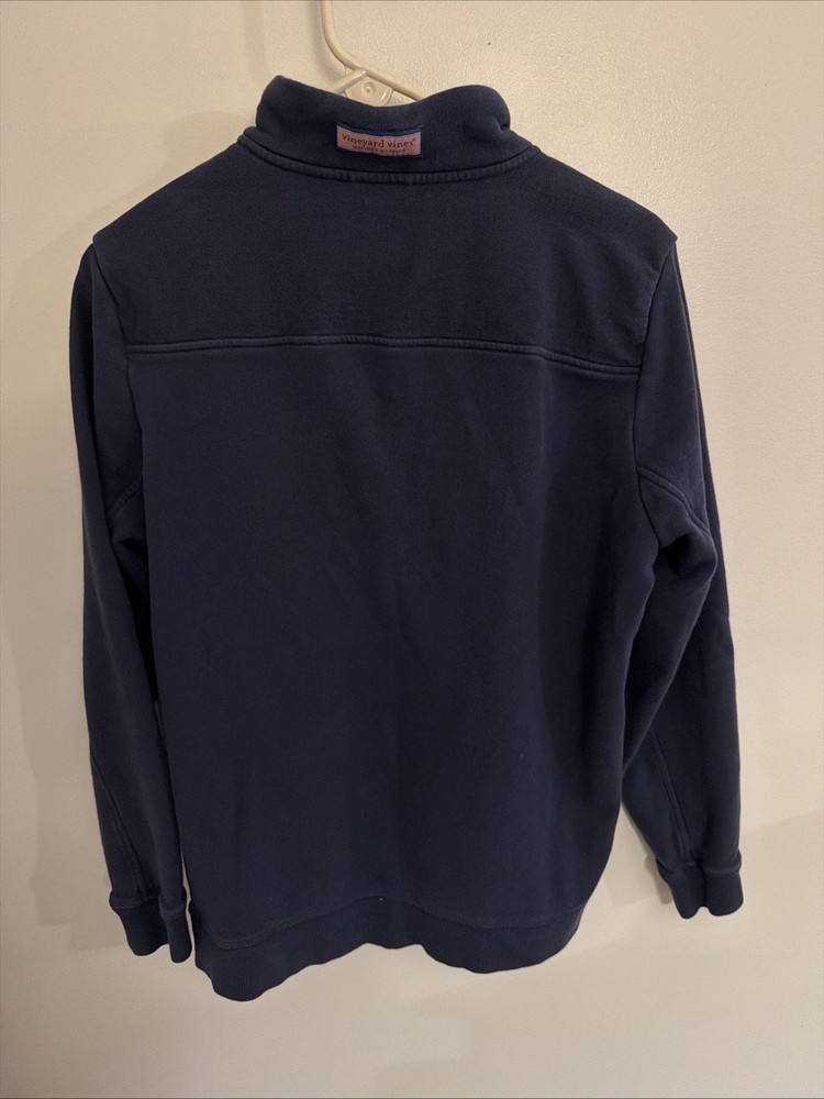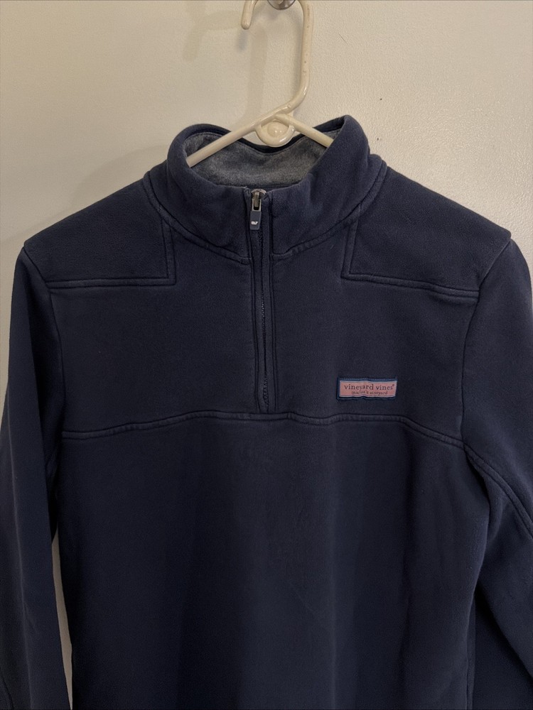 The Vineyard Vines Medium Pullover Women's Navy Blue Cotton 1/4 Zip Sweatshirt is a stylish and comfortable activewear piece perfect for casual occasions. Made of knit cotton material, this sweatshirt features a mock neck neckline with a zipper closure and the brand's iconic whale logo accent. With a classic navy blue solid color and long sleeves, this pullover sweatshirt is machine washable and designed for everyday wear. The regular fit and medium size make it a versatile addition to any woman's wardrobe.