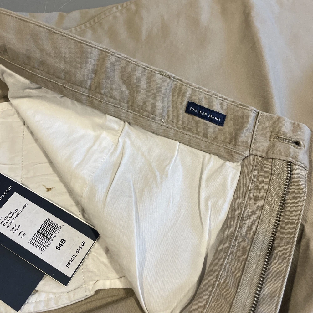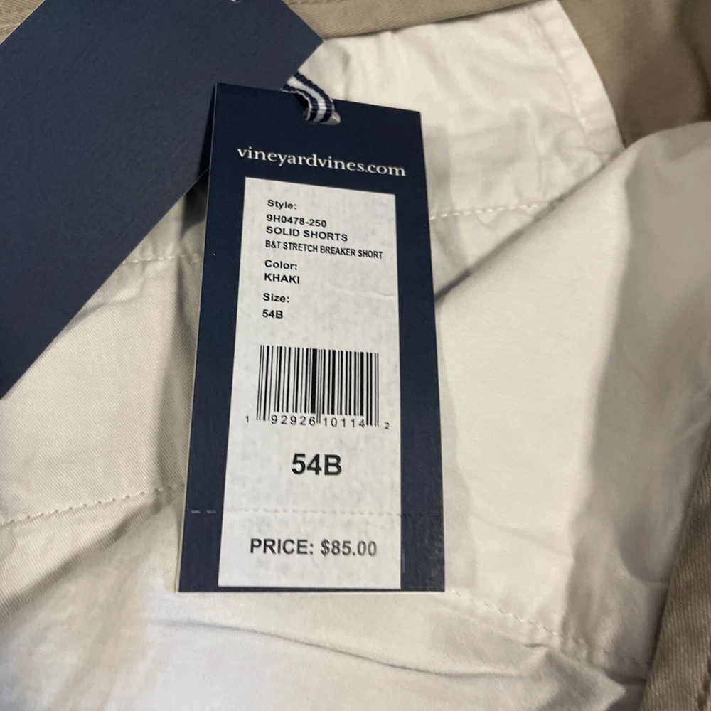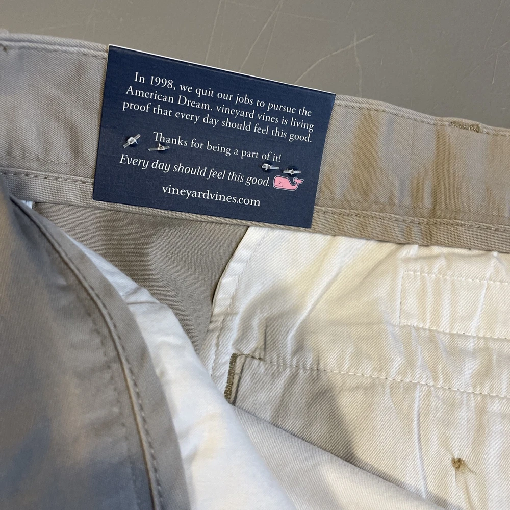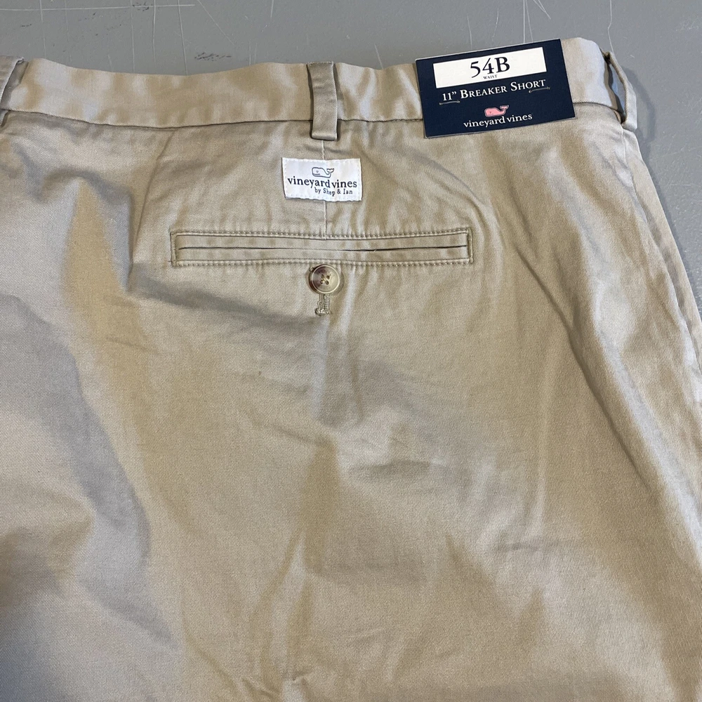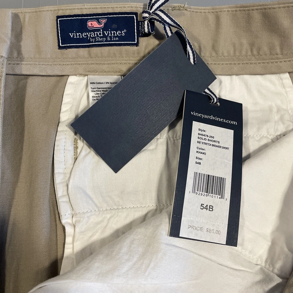 Elevate your summer wardrobe with these stylish and comfortable Vineyard Vines khaki shorts in size 54B. The breathable spandex and cotton blend material, paired with a flat front and stretchy fit, make these shorts perfect for any casual occasion. With a solid pattern and beige color, these chino-style shorts feature pockets and a generous 11 inch inseam. Designed for big and tall men, they are the perfect addition to any warm weather outfit. Don't miss out on these new with tags, high-quality shorts from a top brand.