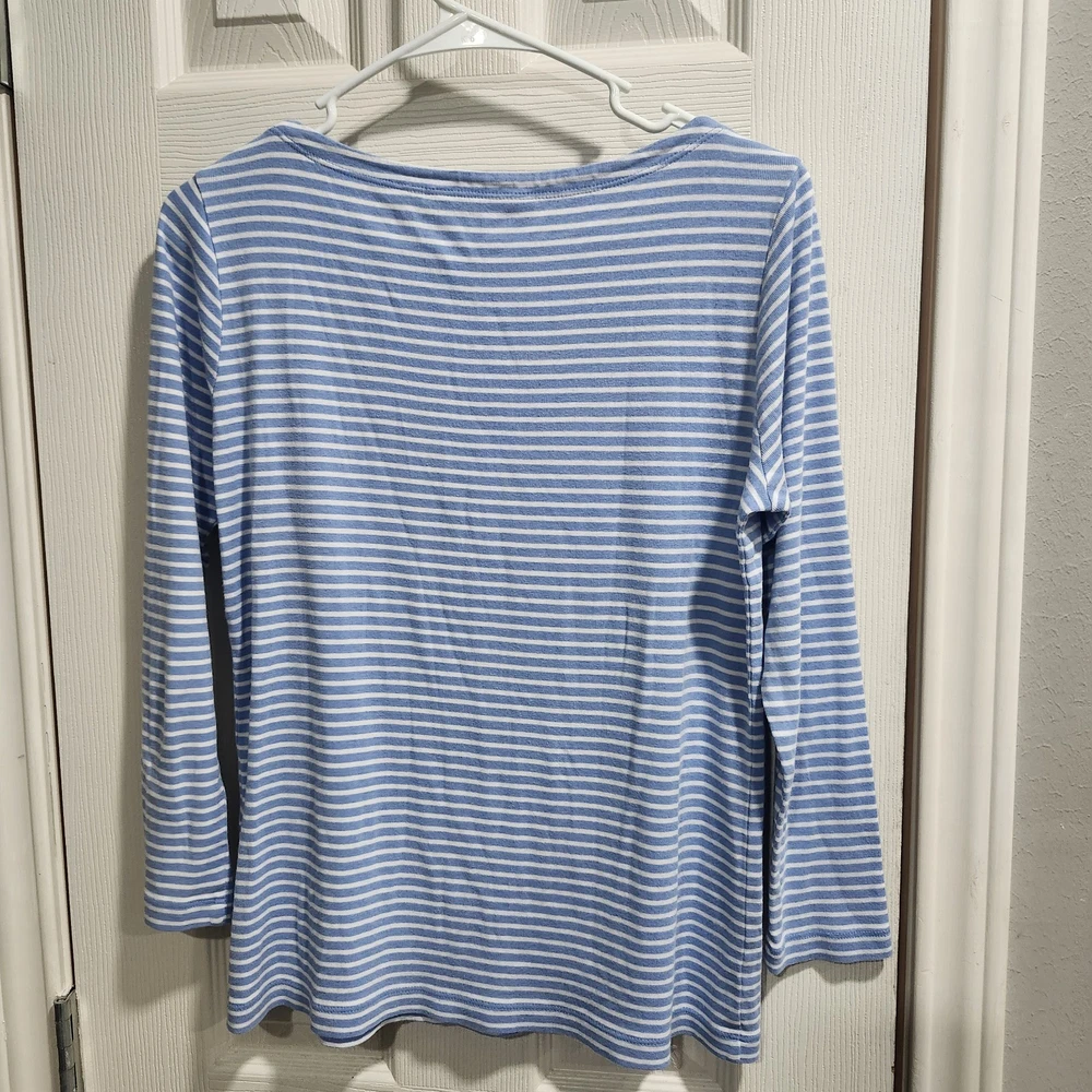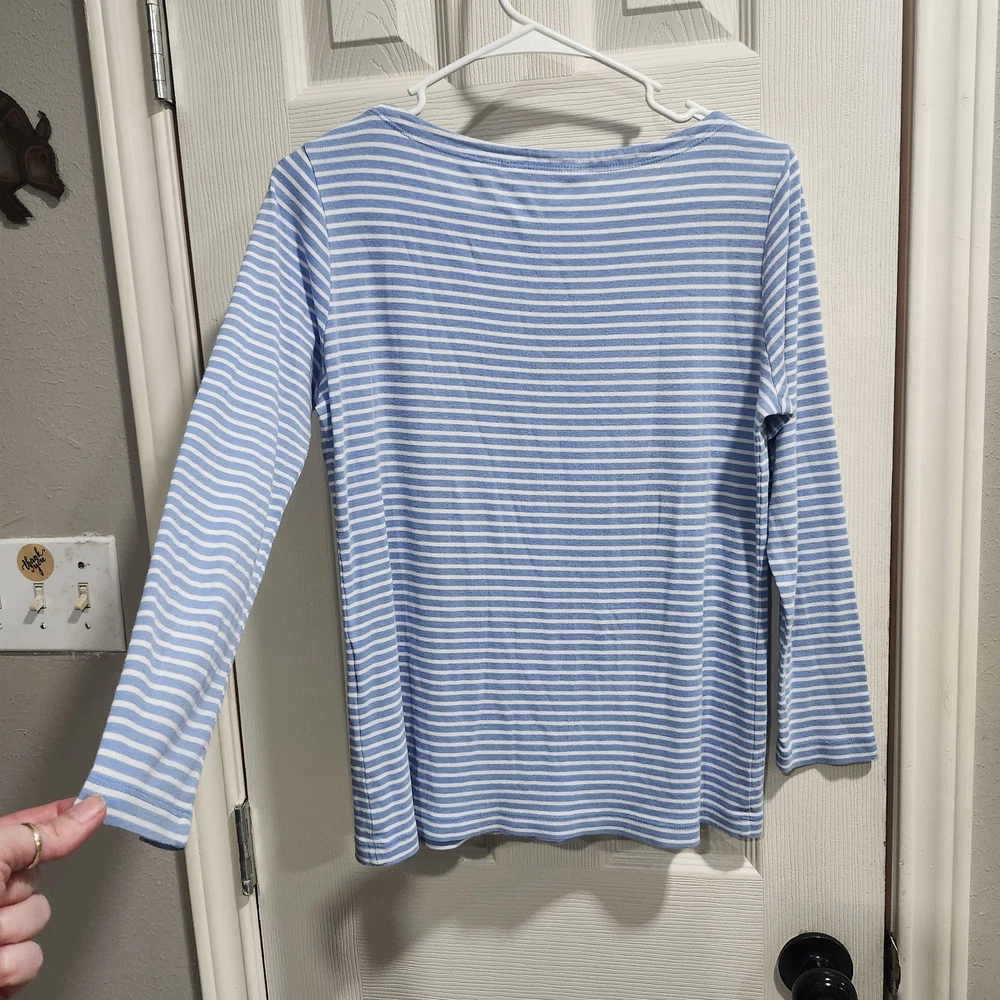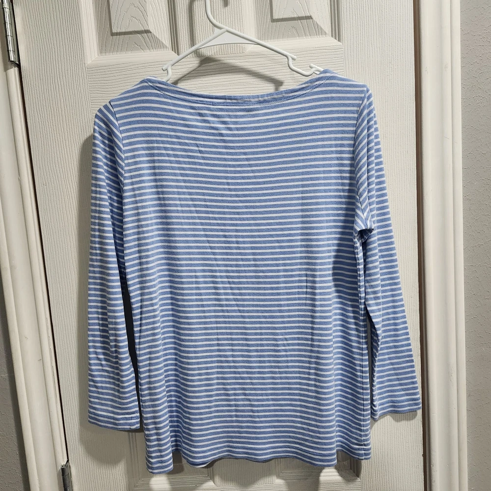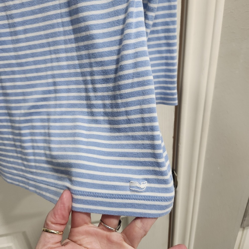 Vineyard Vines women’s long sleeve striped top in a soft blue and white colorway. Features a classic boat neckline, lightweight knit fabric, and a relaxed everyday fit. Finished with the signature Vineyard Vines whale logo embroidered near the hem. A timeless coastal-style piece that’s perfect for layering or casual wear year-round. Brand: Vineyard Vines Size: Women’s Medium Color: Blue & White Stripe Sleeve Length: Long Sleeve Neckline: Boat Neck Fabric: Soft knit (see tag photos) Made in Peru Condition: Pre-owned, gently worn. No holes, stains, or major flaws noted. Approximate Measurements (laid flat): • Length (shoulder to hem): 23 inches • Armpit to armpit (chest): 18.5 inches • Sleeve length (shoulder to cuff): 20 inches • Shoulder to shoulder: 14 inches Please compare measurements to your favorite top for best fit.