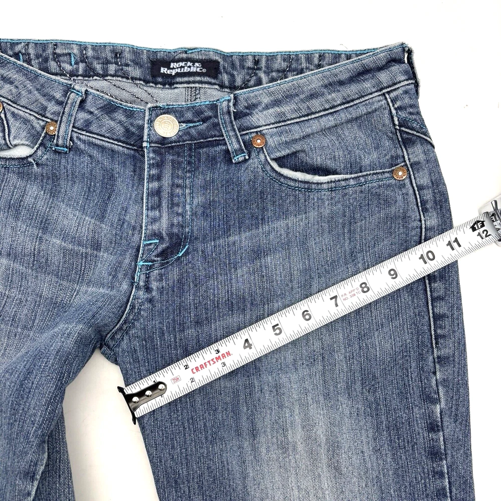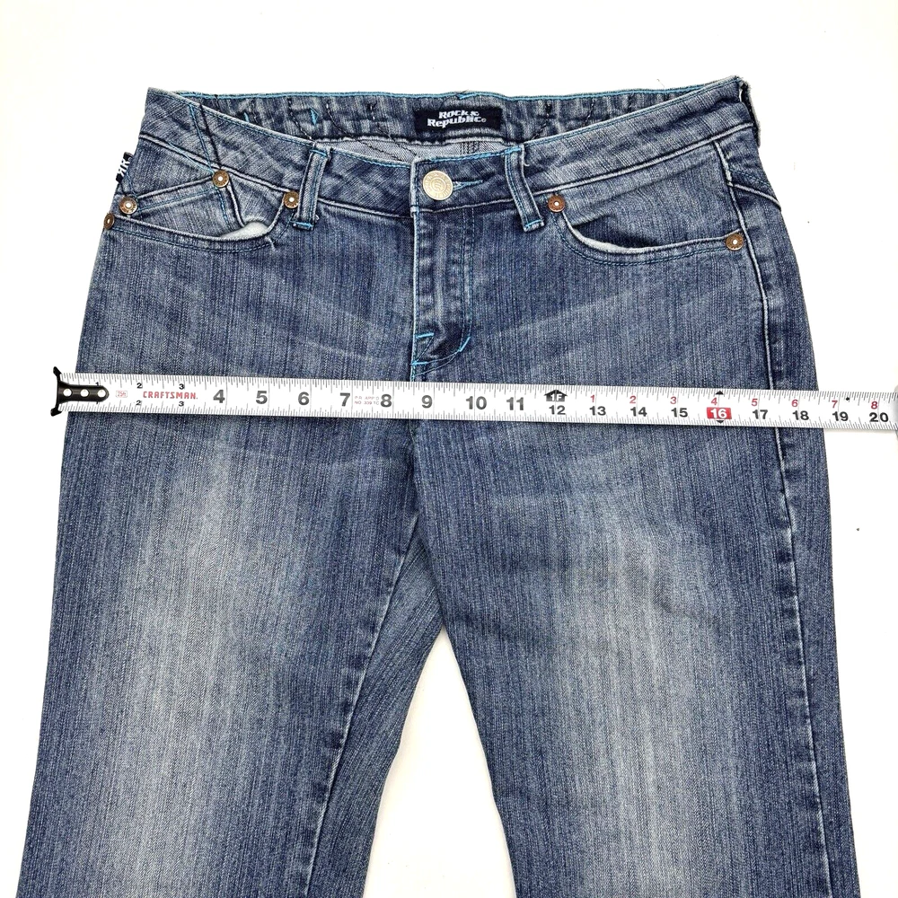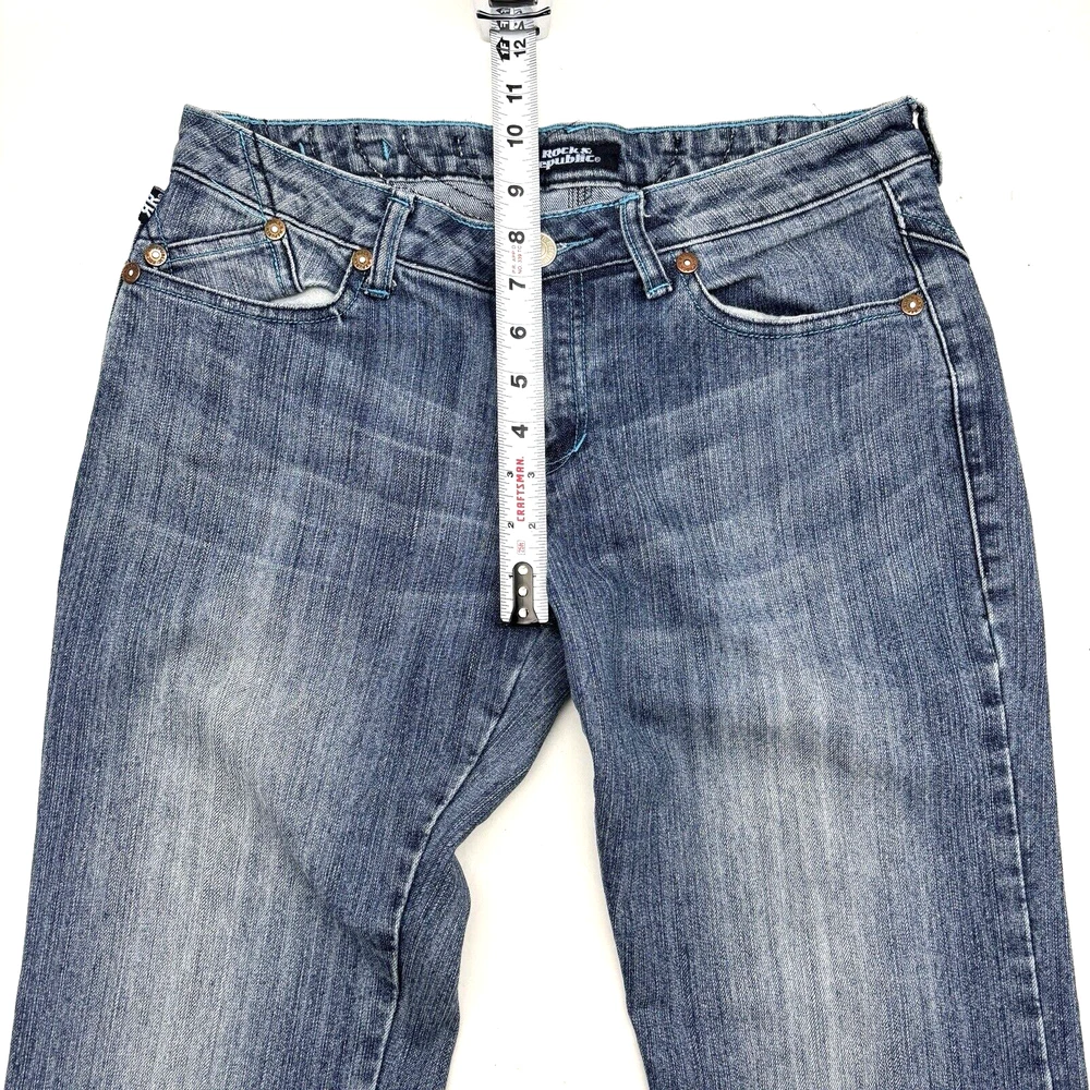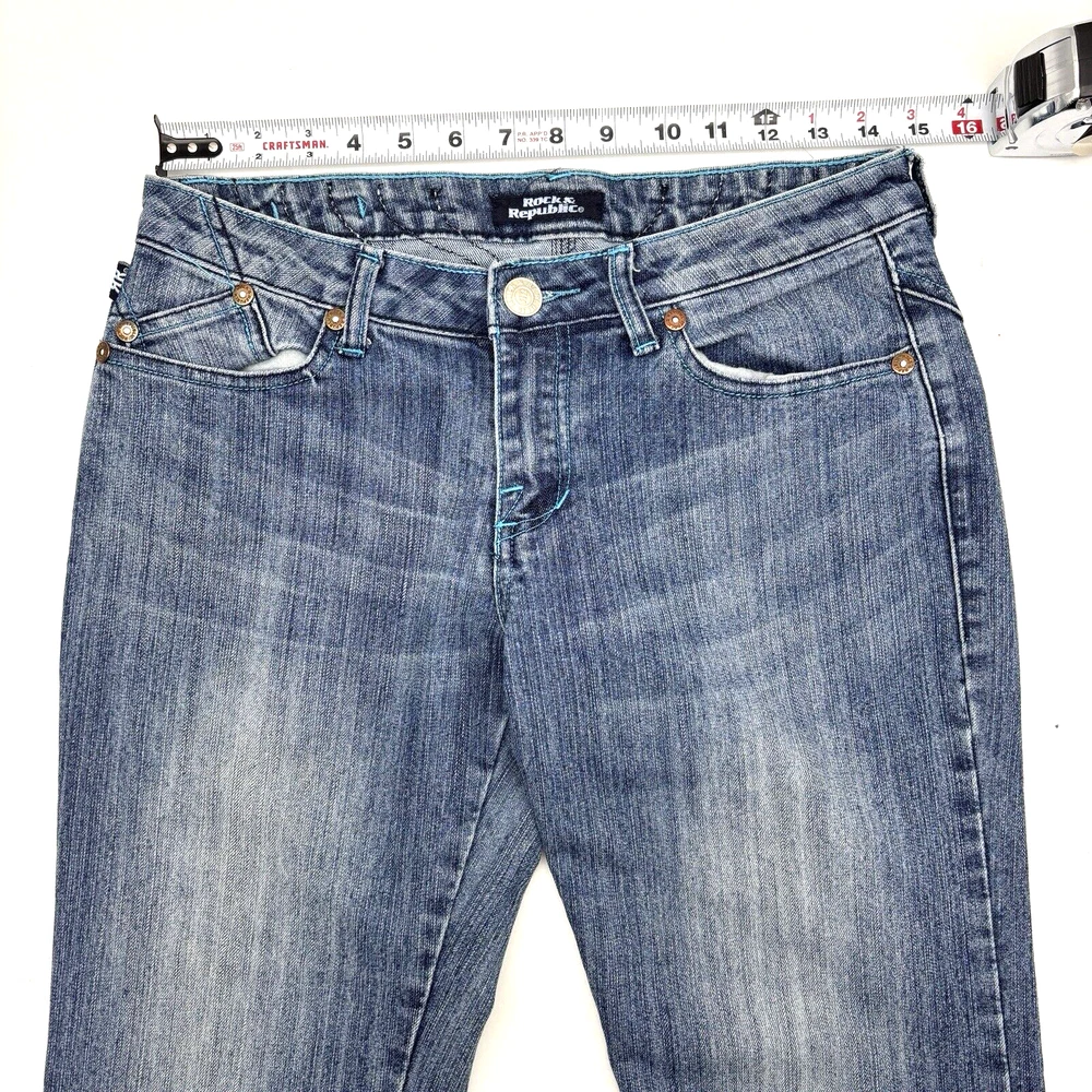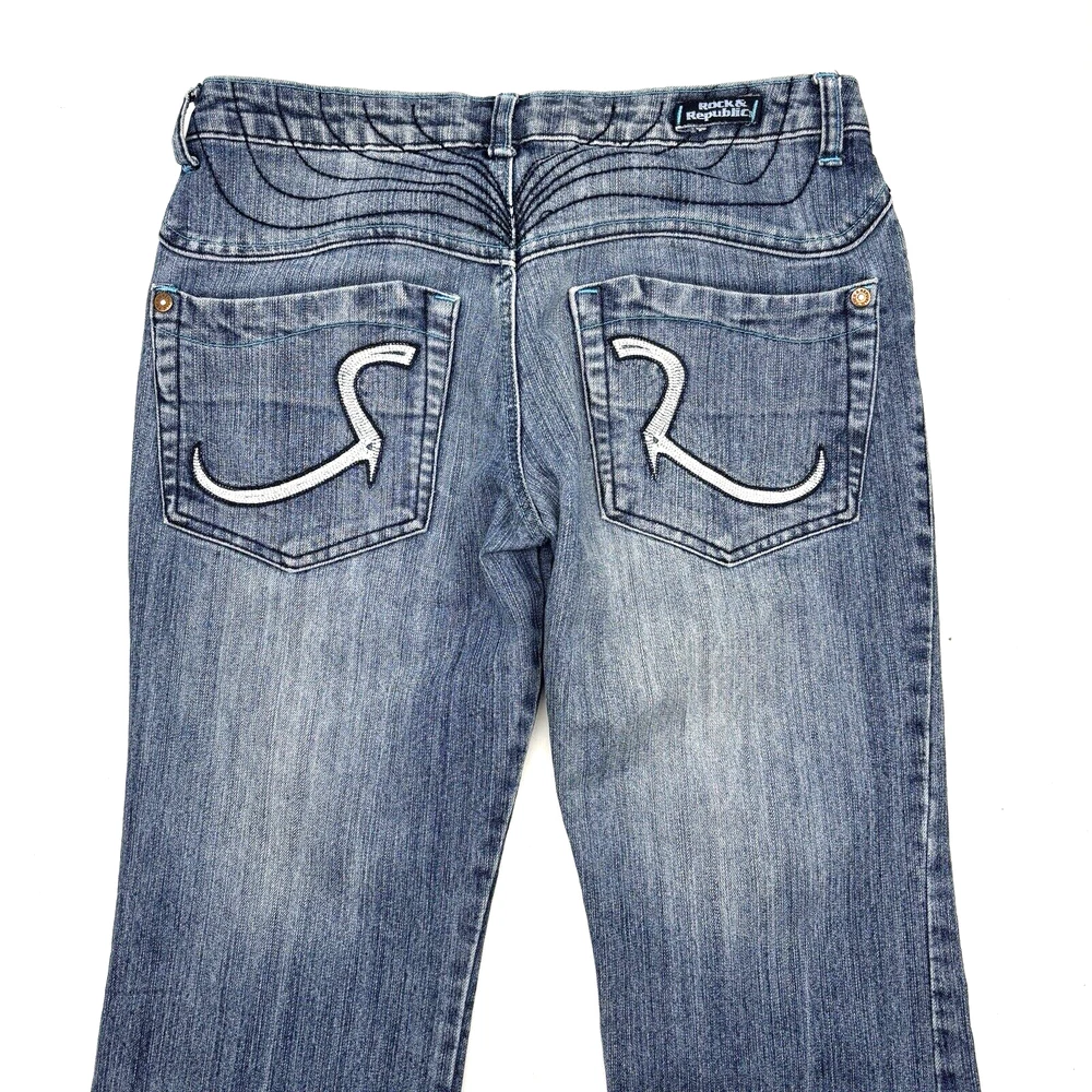 Vintage 00s Y2K Rock & Republic Jeans 98% Cotton, 2% Elastane Made in USA Model: MADRID Medium Wash Denim Flare Leg Low Rise Contrast Stitching Along Back Waist Zip and Button Closure 5-Pocket Design Belt Loops Women's Size 28 Refer to measurements below to ensure accurate fit before purchase! 8" rise 14.5" waist (29" circumference, 1" bigger than tag size) 19" hips 33" inseam 11" thighs 9.5" ankles 40" full length from waist to hems Measurements made with garment laying flat. Great vintage pre owned condition. Gently owned. Worn in and comfy! No rips, tears, stains, holes or other notable flaws. Clean and from a smoke free home.