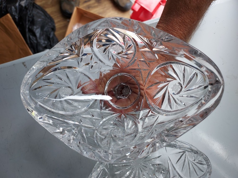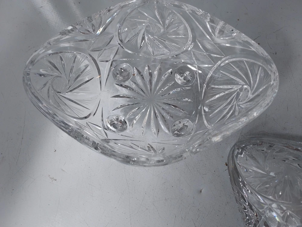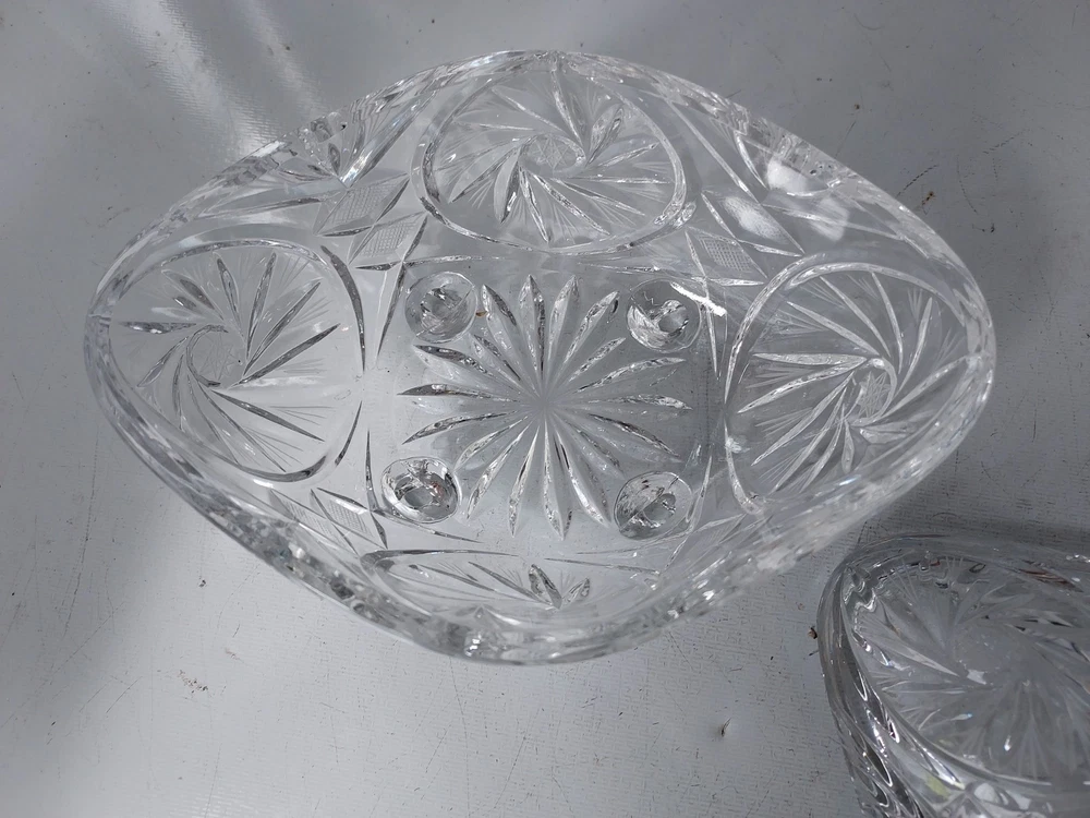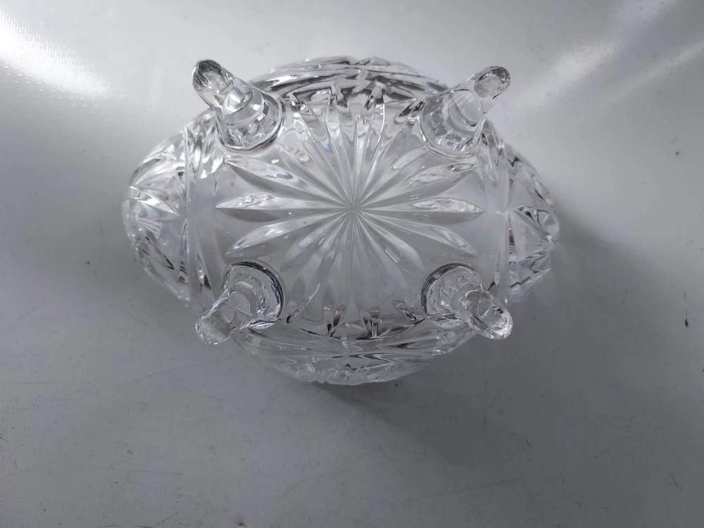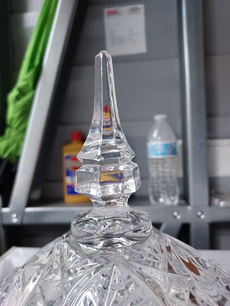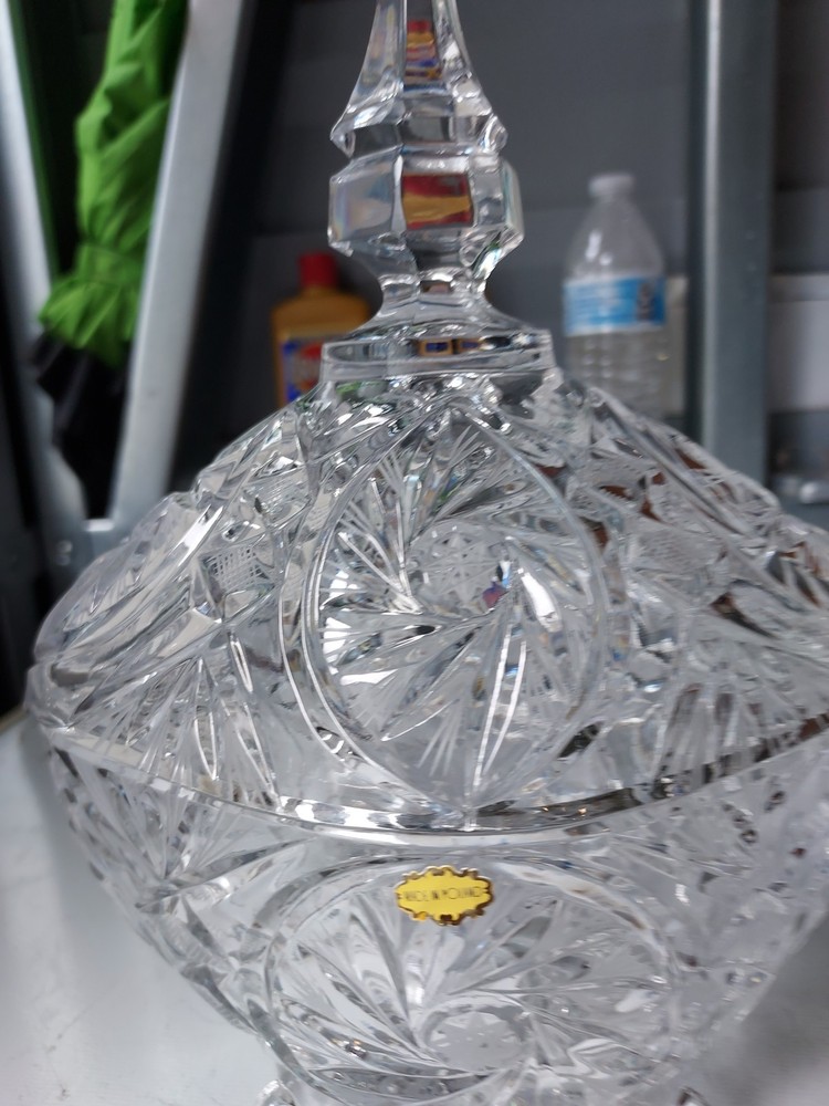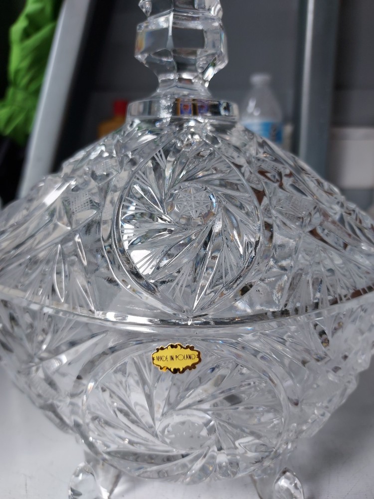 Add a touch of vintage elegance to your home with this beautiful crystal candy dish. The dish features a footed base and measures 10 inches to the top and 7 inches in width. Crafted in Poland, this clear candy dish is made of high-quality crystal and is perfect for storing your favorite candies and treats. The dish is perfect for display and can be used as a decorative piece in any room of your home.
