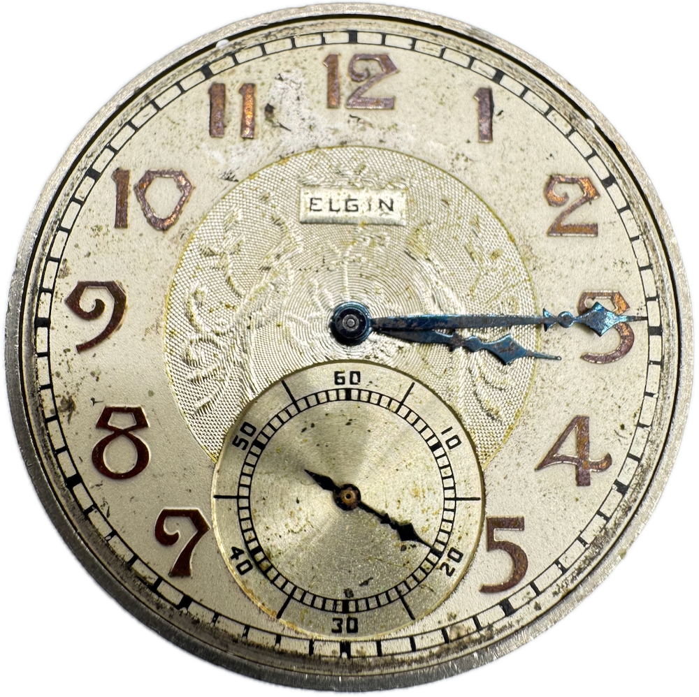 Vintage 12s 1933 Elgin Fancy Dial 7 Jewel Mechanical Pocket Watch Movement 303 Product Description Item: Pocket Watch Movement Brand: Elgin Model: Fancy Dial Movement: Mechanical Production Year: 1933 Country: USA Jewels: 7 Jewel Gender: Men's Grade: 303 Size: 12s Product Measurements Diameter: 39.5mm Product Condition Overall Condition: Fair, overall condition for its age. Functions: Running, but may be in need of service. This means, it can run unreliably, start or stop and timekeeping is not guaranteed. Dial: The dial has scratches and discoloration. Hands: There is discoloration on the hands.