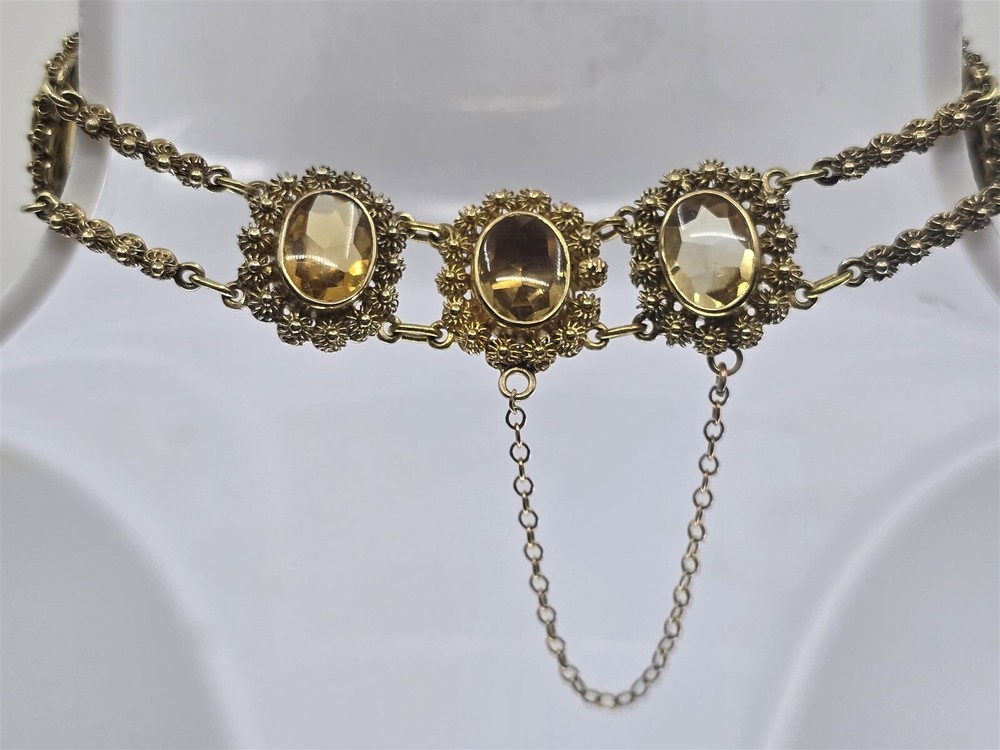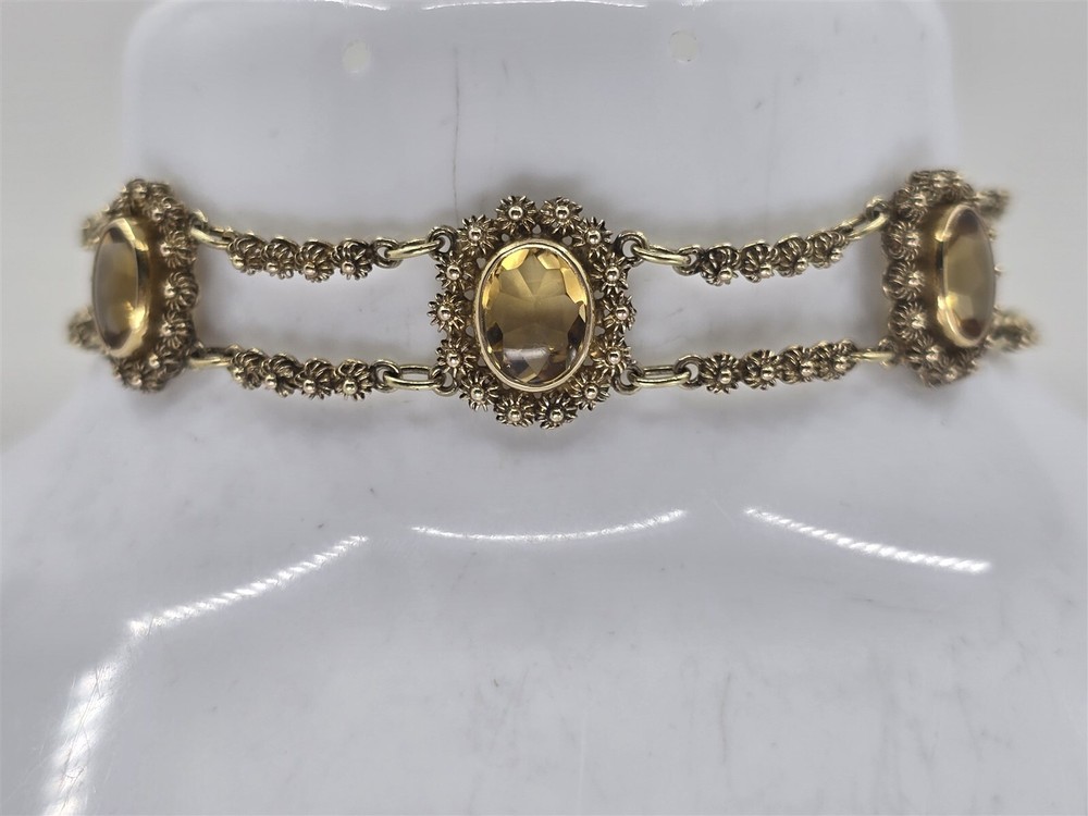 This 14k yellow gold citrine floral bangle measures 7" in wearable length and has a width of 14.7 mm. The back of the clasp is stamped 14K and features a safety chain. This has tested 13-14K Gold. Weight 17.5 G. HT2155 Item As Is. All stones not identified unless clarified above. All items are pre-owned and pre-loved. Stones may show minor nicks and abrasions or small signs of wear. Diamonds are graded using GIA standards by GIA Graduates. Diamond and gemstone weight is estimated by formula. The metal is stamped or identified by acid testing and/or XRF alloy analyzer gun. All items shipped USPS First Class, Signature Required Items over $1000 ship overnight, Signature Required Please message with any questions. We are available Monday through Saturday 10am to 6pm. Powered by SixBit's eCommerce Solution