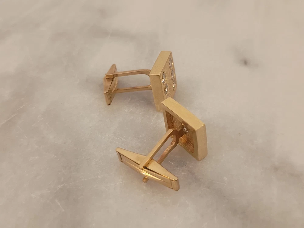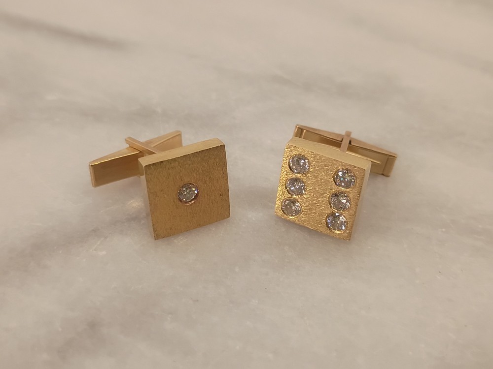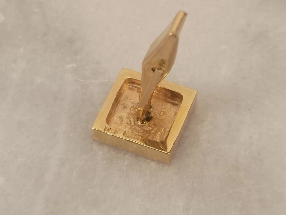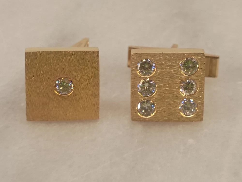 The product is a pair of vintage 14K solid yellow gold cufflinks shaped like dice, featuring a brand stamp of M&M and adorned with diamonds. These cufflinks are designed for men and are crafted with high-quality yellow gold, weighing 11.5g. The unique design and luxurious material make them a stylish and sophisticated accessory for formal occasions or to add a touch of vintage elegance to a tailored outfit. Thank you for visiting my listing today and thank you for your interest in this item! My goal is to have a pleasant transaction resulting in a satisfied customer. I hope any transaction between us leaves you with a feeling of confidence knowing you can trust me and the items I offer here. *Most if not all my listings are set to accept offers. Feel free to send an offer and I will be happy to consider it!! *Please contact me with any questions or concerns and I will be happy to help. *Always examine the photos carefully, and if in doubt, email me with any questions you may have. *Please note that condition statements are offered as a guide only. They will always be somewhat subjective and reflect our opinion, which may not necessarily agree with someone else's opinion. PLEASE READ: I aim to please and I want my buyers to have a positive transaction with me. If you have questions, concerns, or special requests related to any of my items I hope you will contact me so we can work them out to your satisfaction. I sell my items to give you a great item at a decent price while making a little profit at the same time. If you feel the item you are interested in is too pricey do not hesitate to send me a fair offer and I will consider it. My goal is to satisfy your needs and mine so both parties can benefit. SHIPPING: If you prefer a different shipping method or company please contact me and I will do all I can to make that happen. If you have concerns or requests about the packaging of your item contact me and I will do all I can to accommodate them. Shipping costs are based on location in each state or country, the costs always differ. After I have received your payment I will ship your item out within 3 business days or less excluding weekends and holidays. BEFORE PURCHASING & BIDDING: **Please see all the pictures. I do not have great photography skills but I try to get the most accurate photos I can. If you are unsure about something you see in a photo contact me so I can do what I am able to answer your concern about the item. **I cannot stress enough that if you have any questions or concerns please contact me before purchasing and bidding. Communication can solve so much. **As a customer myself, I understand the meaning of customer satisfaction and my goal is to have nothing but satisfied customers. If you are not unsatisfied with your purchase I ask that you please contact me so I can take care of your issue. My goal is for you to be 100% satisfied. INTERNATIONAL BUYERS WELCOMED - PLEASE NOTE: I welcome International buyers! Please be aware that any custom/duties/taxes that the parcel might incur once it is out of the USA are the responsibility of the buyer. Please check with your country's customs office to determine what these additional costs will be prior to bidding or buying. Please refer to the eBay Site Map for more information if needed.
