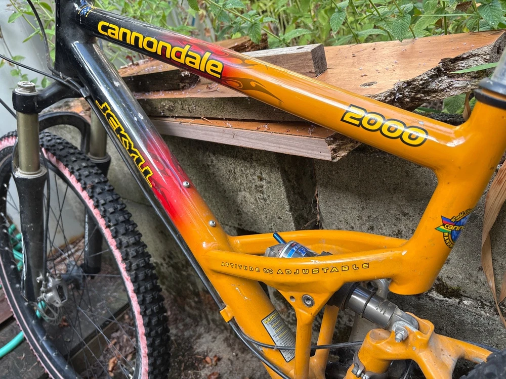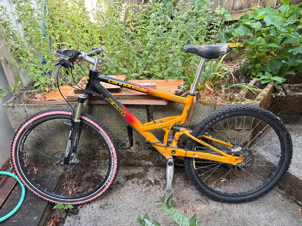 The Vintage 15.5” Cannondale JEKYLL Lefty Fork Full Suspensión Mountain Bike 26” is a classic piece of sporting goods, featuring a flat bar handlebar and 26-inch wheels perfect for off-road adventures. This mountain bike boasts a full suspension system, with both front and rear suspension, providing a smooth ride over rugged terrain. The bike is crafted from lightweight aluminum and equipped with 27-speed derailleur gears for easy and precise gear changes. With a unique color combination of yellow, red, and black, this vintage Cannondale JEKYLL model is a stylish and functional choice for any avid cyclist. Bike has been in storage for several years. One owner. Brakes need to be replaced, parts are included. Tires are original so need to be replaced. Fun project for someone with tools/time.