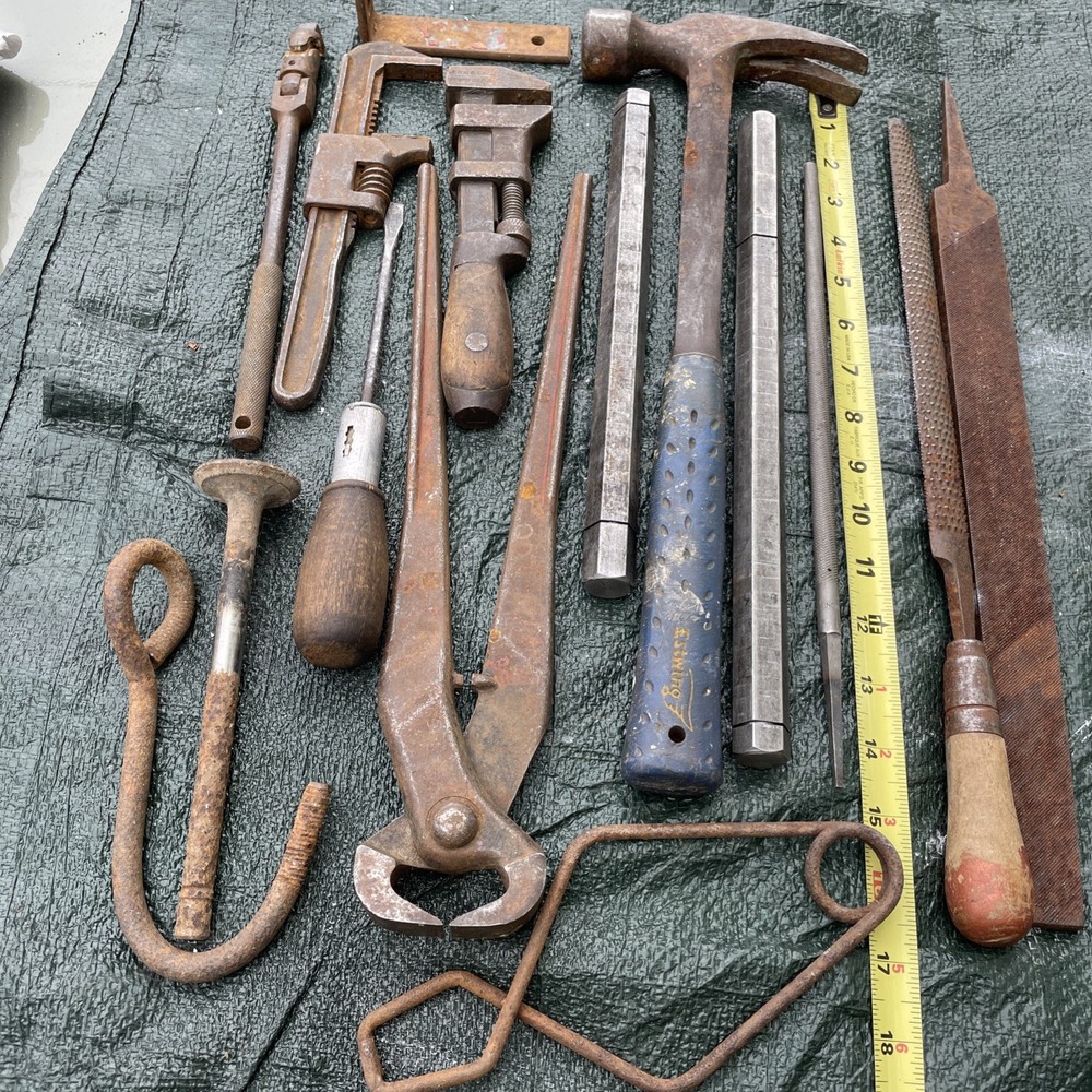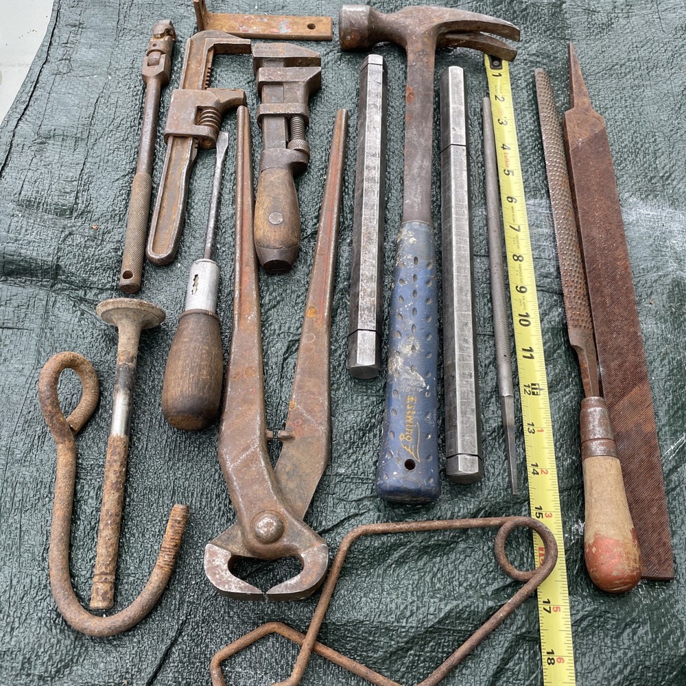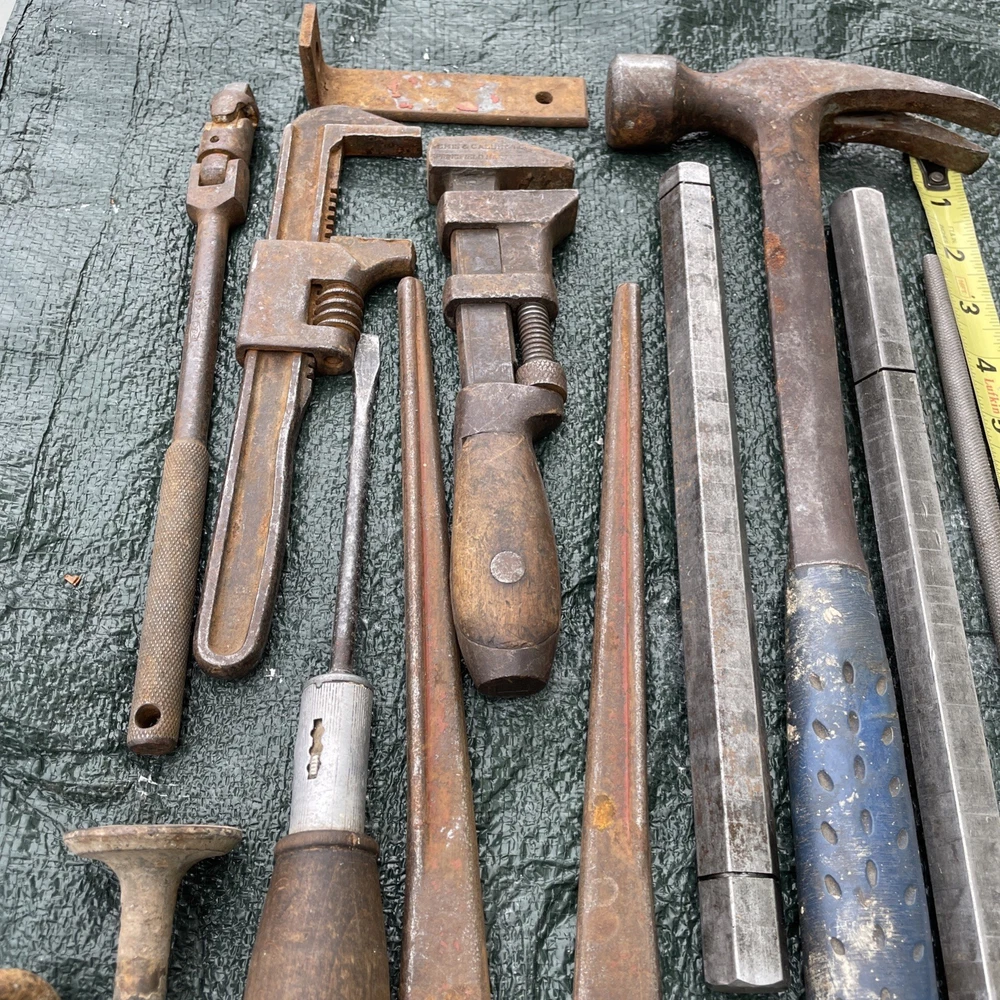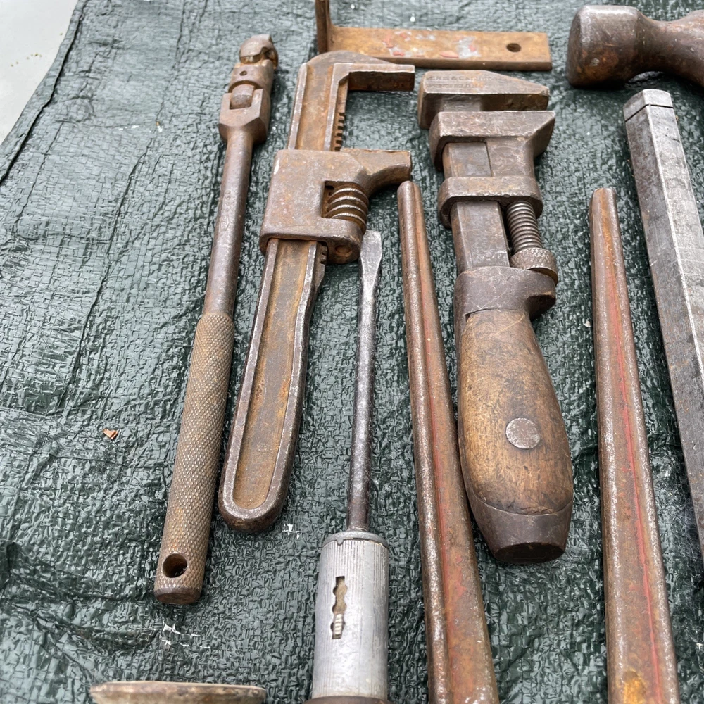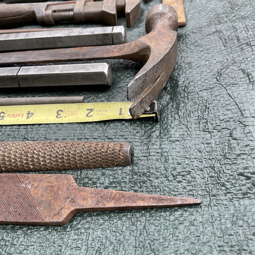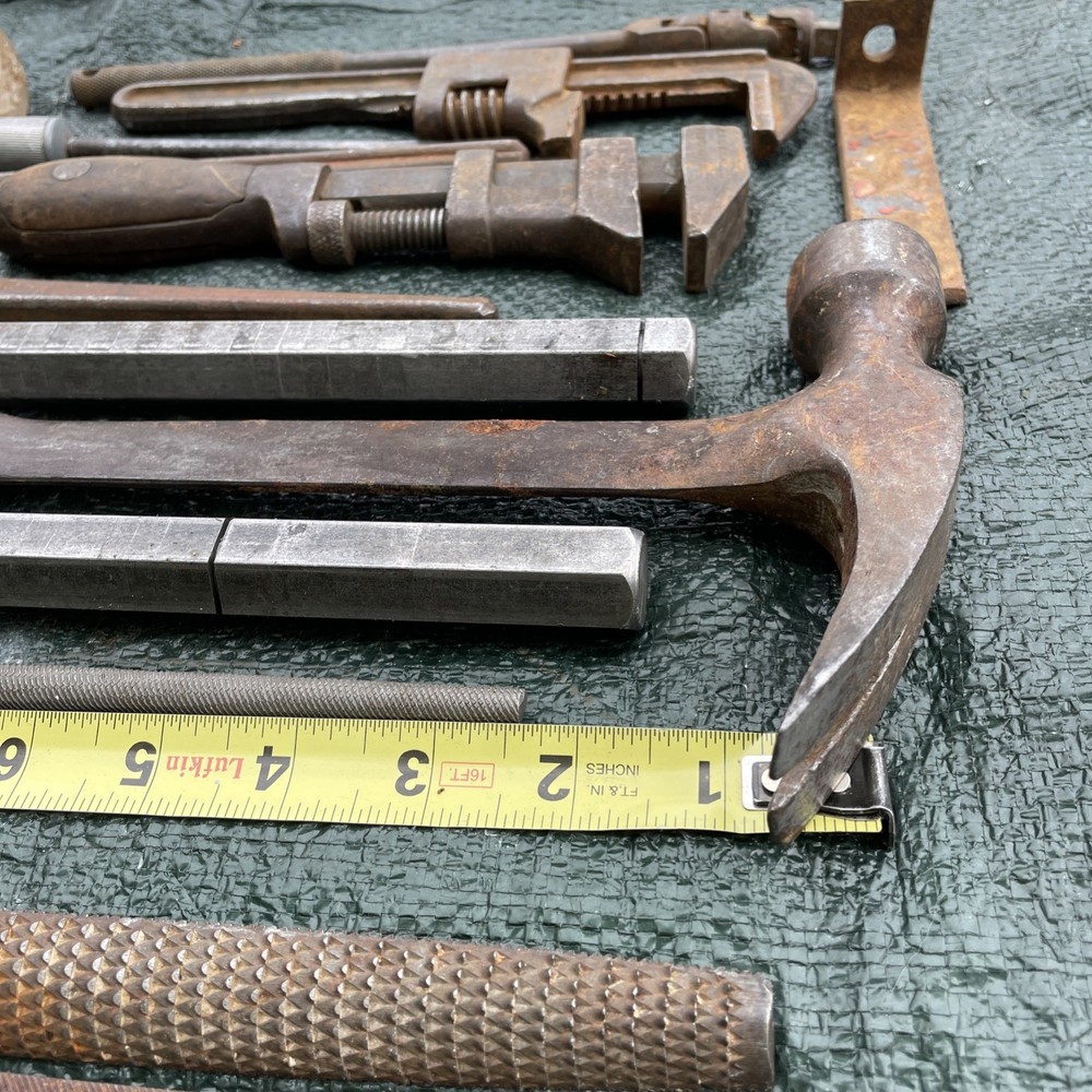 This product is a set of 15 antique 1900s adjustable wrenches, nippers, hammers, rasps, and files, along with a reversible screwdriver. These vintage tools would be a great addition to any collectibles or tools enthusiast's collection. The set includes a variety of tools that were commonly used in mechanics and woodworking during the early 1900s, offering a glimpse into the craftsmanship and techniques of the past. One wrench, Trademark brand, has a wooden handle and looks to be in excellent condition. Great old old blacksmithing tool and cutters nippers. Stamped “Champion Dearment Meadsville PA” 2 files/rasps 1 Vintage 14" Wood Rasp File Round curved Rare 1 Vintage 14” Wood Rasp Steel File Flat