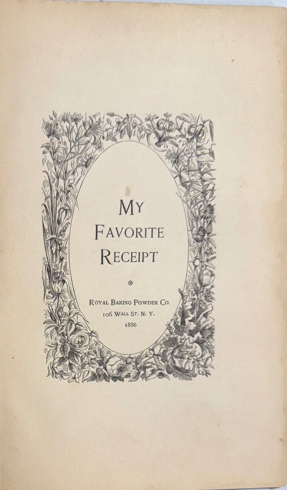 MY FAVORITE RECEIPT Royal Baking Powder Co. New York Vintage 1886 A wide variety of recipes including soups and broths, fish and shell-fish, meat, meatloaf, and stews etc, poultry and game, eggs, omelets, etc. salads and salad dressing, desserts, breads, cake, condiments, beverages, corned meats, canned vegetables, etc. Approx 6 x 9 x .5 inches 123 pages We are happy to provide additional photos and information upon request. See our other listings in store PBSales. We will discount shipping of multiple items in a single package when possible. Please ask for a combined invoice before paying for your items. 100% of the proceeds from this purchase directly fund the operations of a public/nonprofit library in Connecticut.