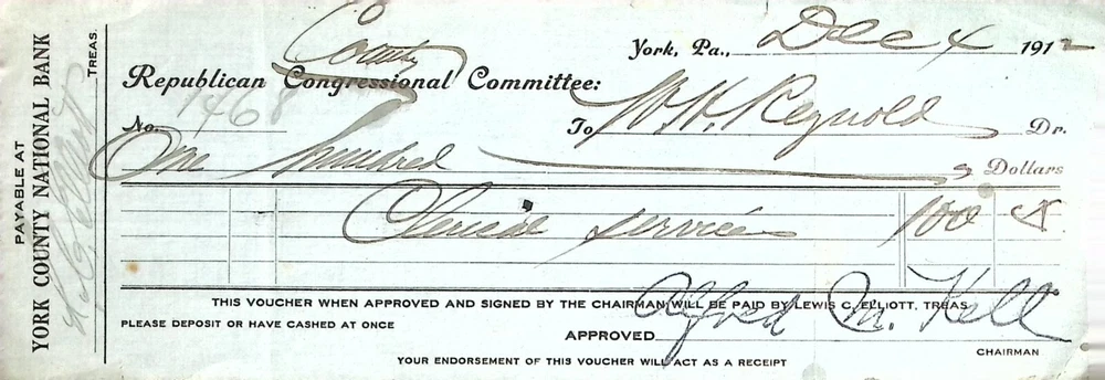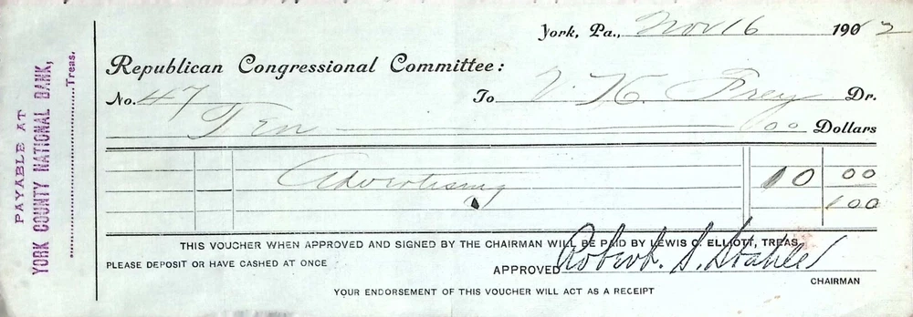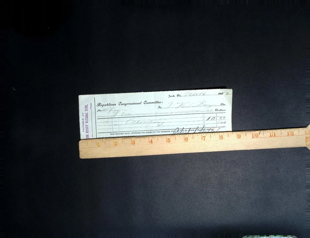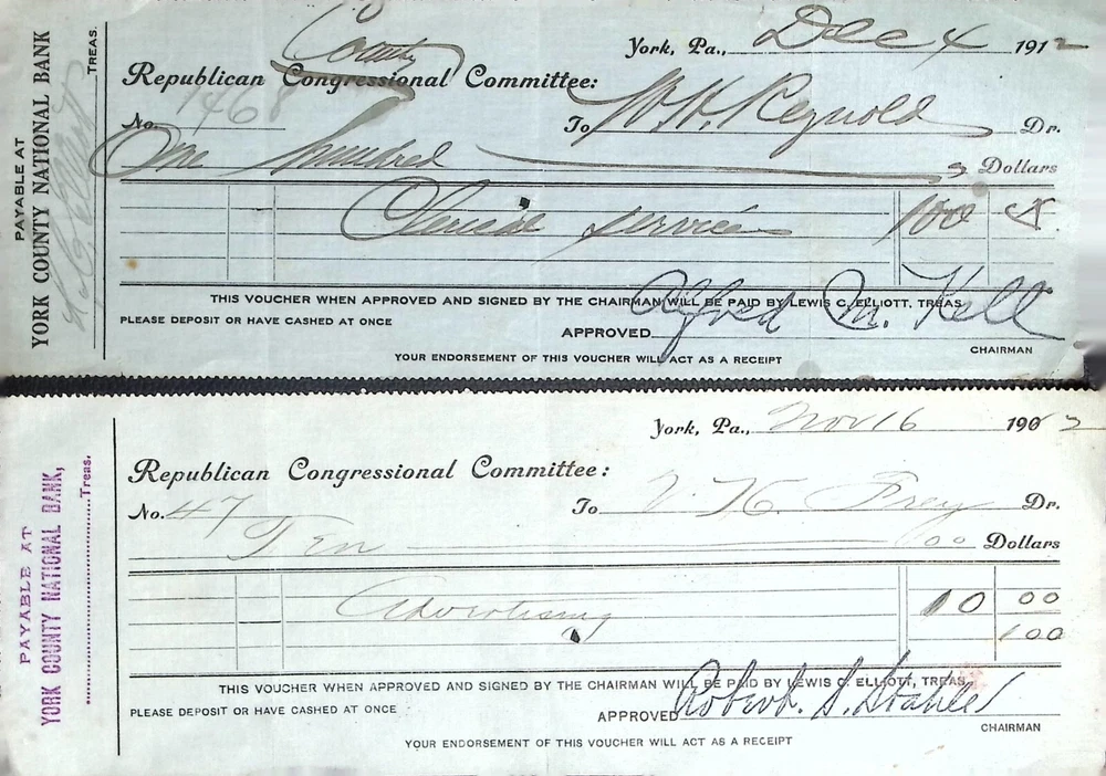 For sale is a pair of original early 1900s Republican Congressional Committee vouchers from York, Pennsylvania. These unique pieces of political ephemera offer a glimpse into historical political funding. Both vouchers are issued from the York County National Bank, dated December 1912 and November 16, 1912 respectively. P092