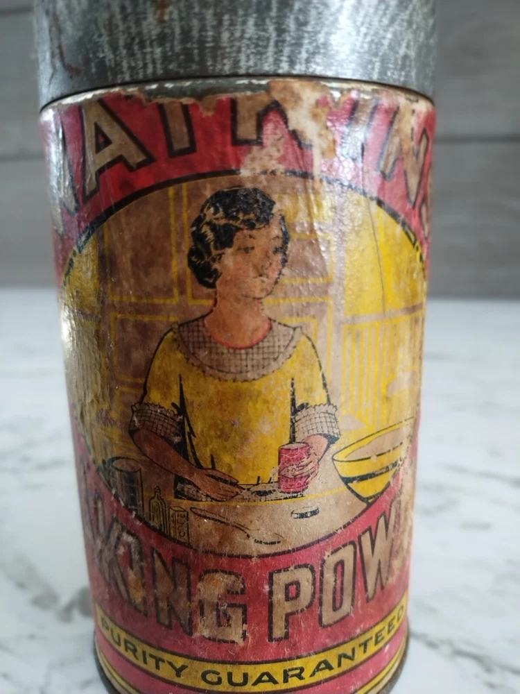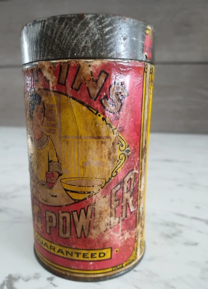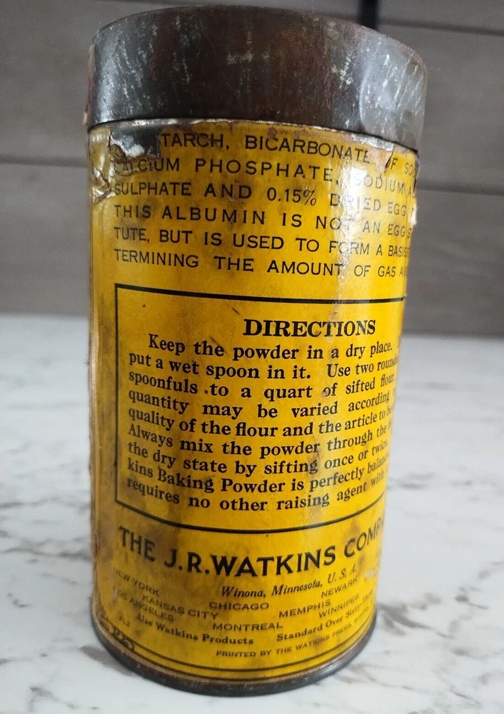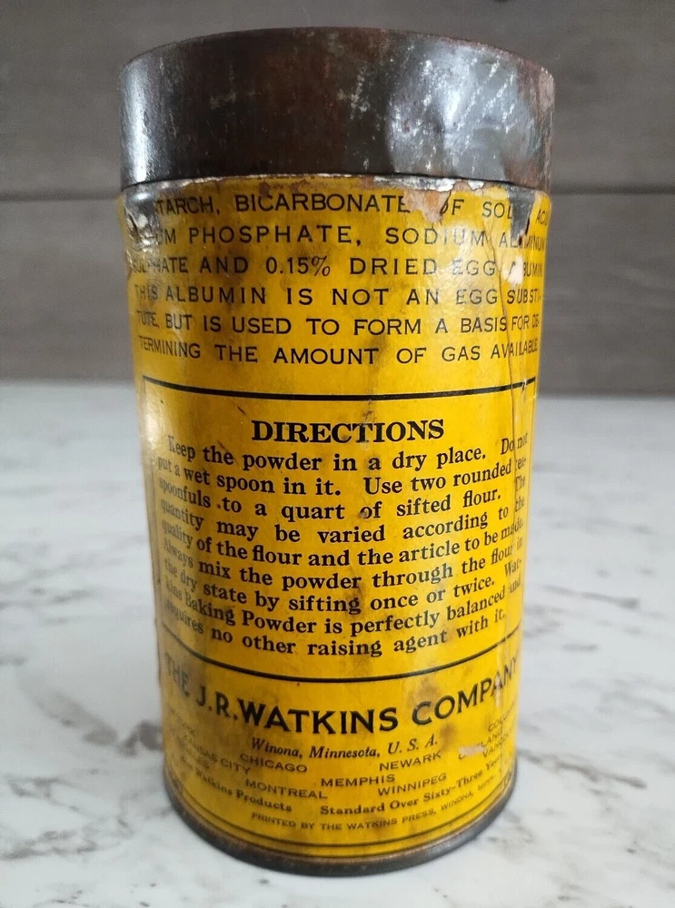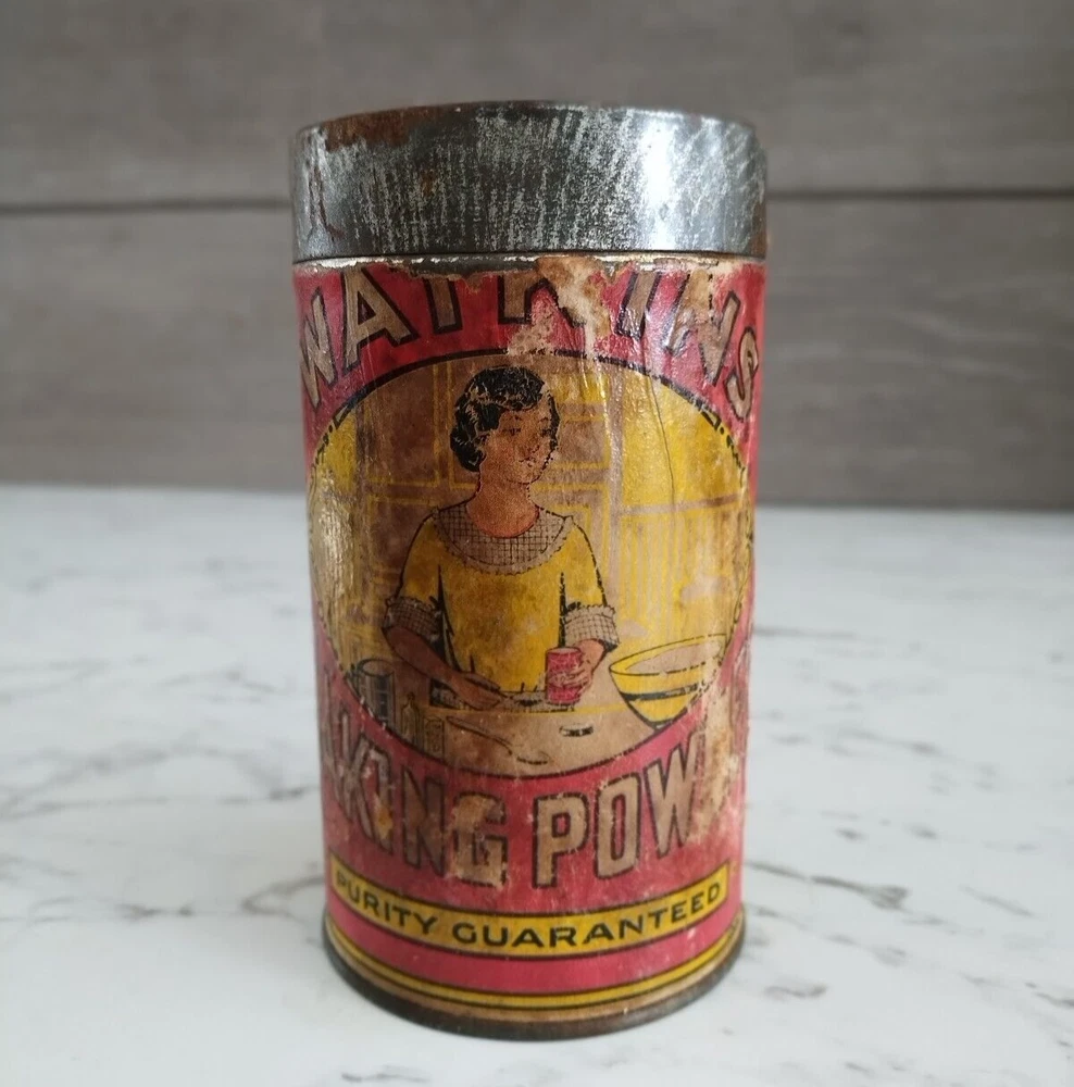 Vintage 1900s Watkins Baking Powder 1 Lb Paper Label Tin Can w/Original Lid Great Advertising Tin with Paper Label and Original Metal Lid Colors are good, label is complete, but some fading and scratching on label. Measures 5 3/4 in tall Will ship 1 - 2 days after purchase. Always willing to consider reasonable offers and if you'd like to bundle, please let me know before purchase. Feel free to ask for measurements or any questions. Smoke Free Home We use recycled shipping supplies whenever we are able. Thank you for looking.