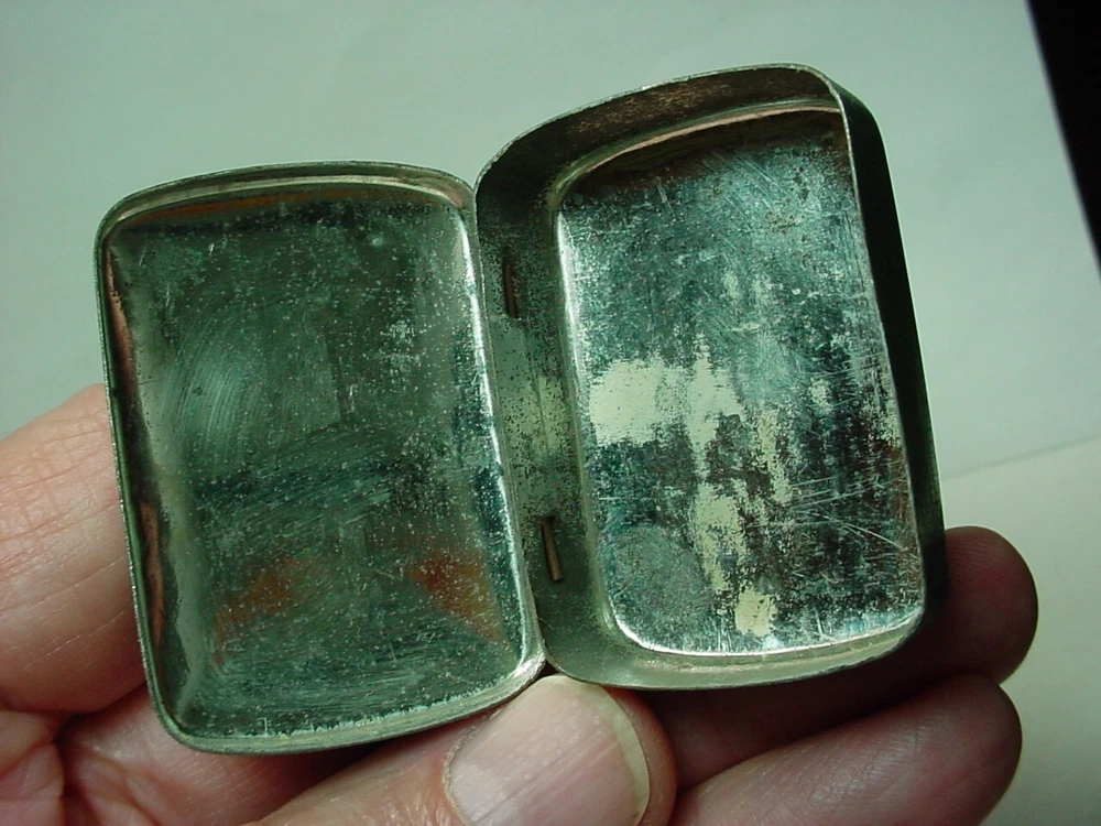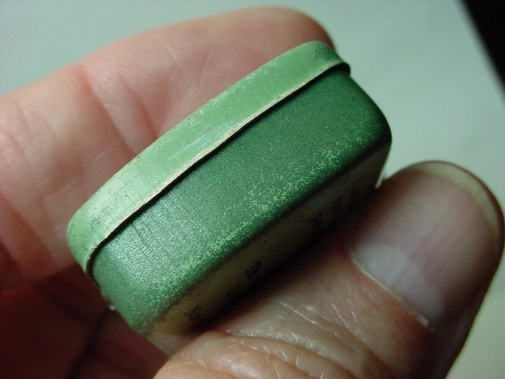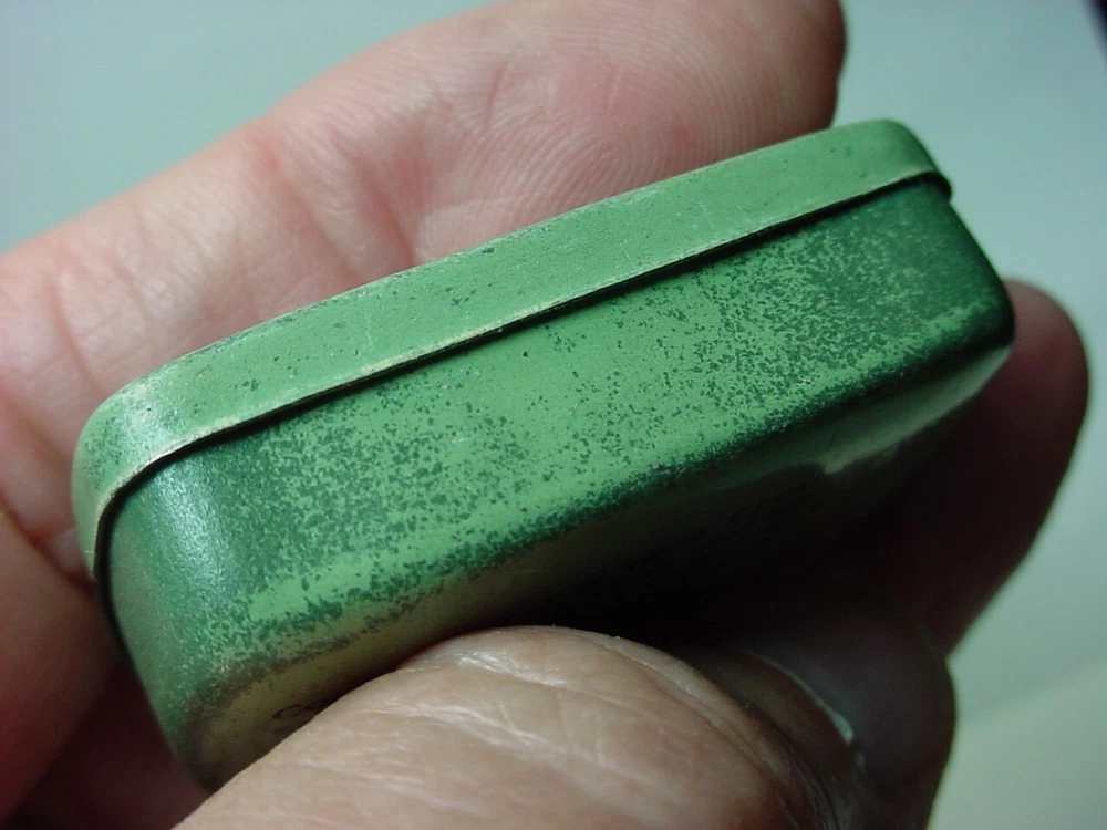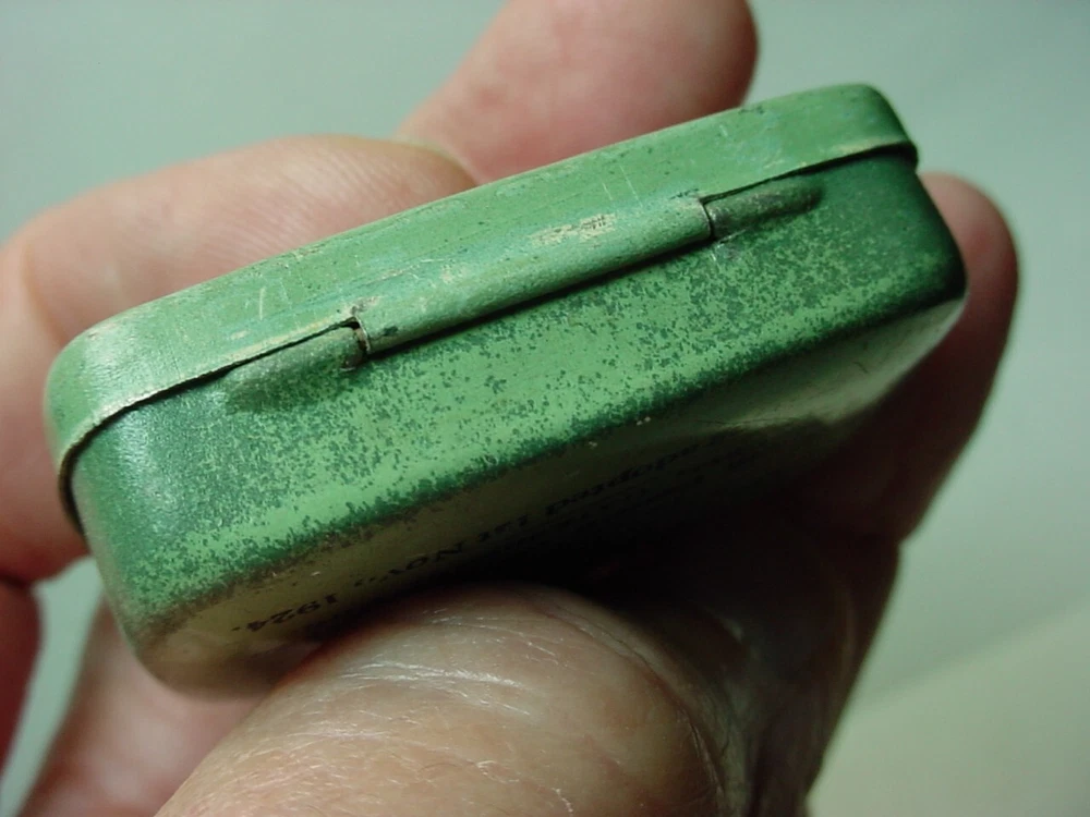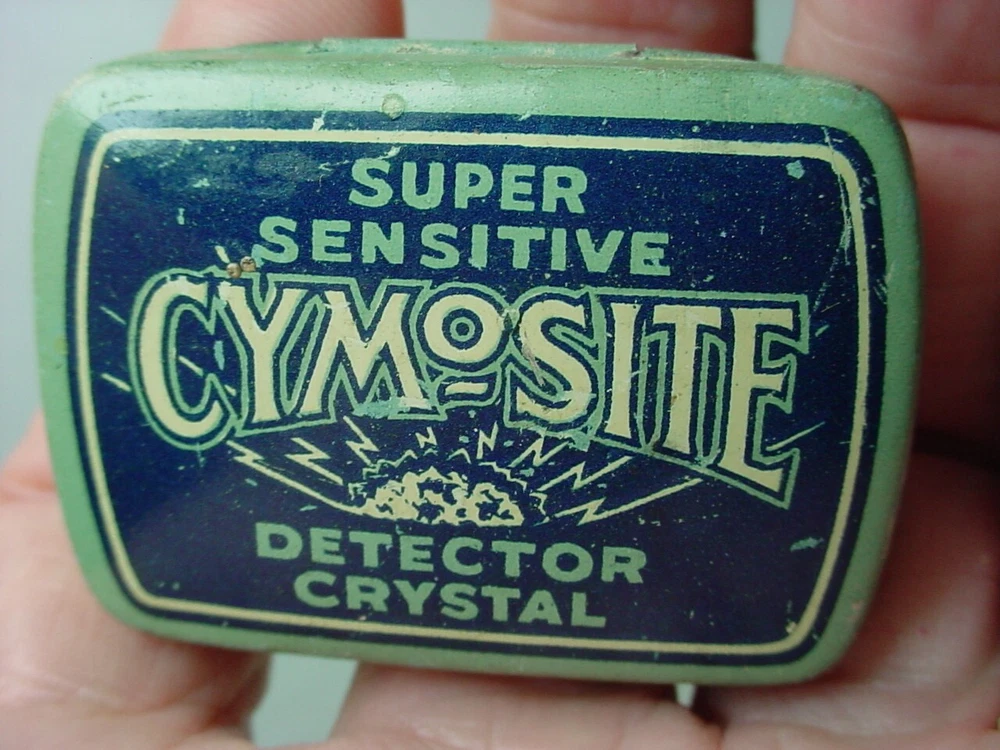 Here is an old empty CYMoSITE detector crystal tin container. It is about 1-7/8"x 1-1/8"x 5/8". It has wear.
