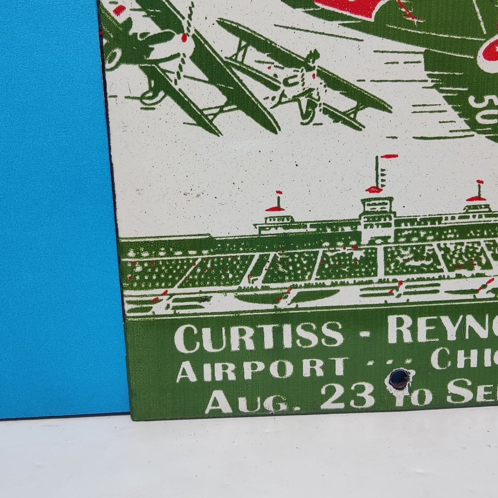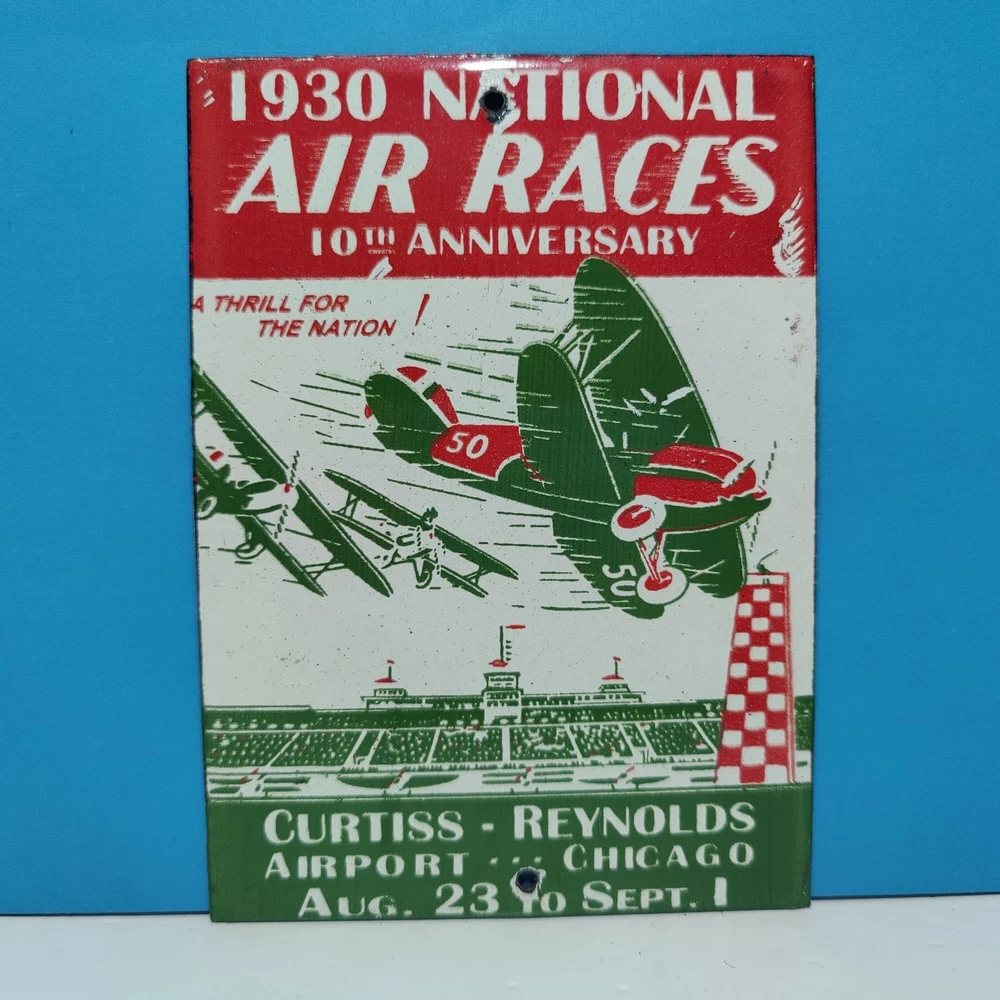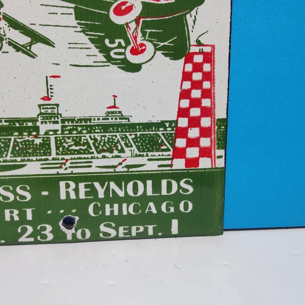 The Vintage 1930 AIR RACES Reynolds Chicago Porcelain Enamel Metal sign measures 7" x 5" inches and originates from the United States. This collectible aviation piece showcases a piece of history from the era of air racing in the 1930s, featuring the iconic AIR RACES design by Reynolds & Co. of Chicago. The porcelain enamel finish adds a touch of nostalgia and authenticity to this vintage sign, making it a desirable piece for aviation and transportation enthusiasts alike. * Kindly take a close look at all photos - they show the exact vintage sign you'll receive. What you see is truly what you get. * Carefully packed to protect the signs condition and shipped securely with USPS Ground Advantage