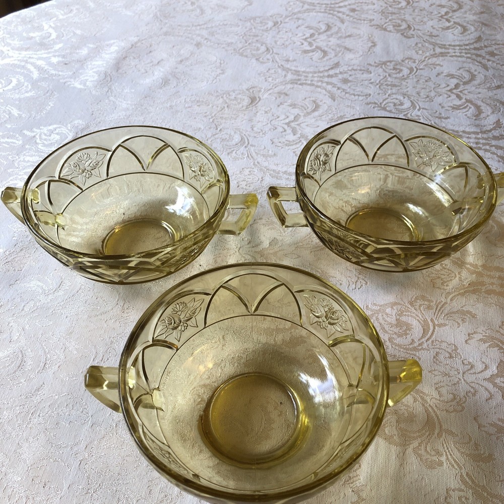 Vintage Amber Federal Glass Dutch Rose Double Handled Bowls from the 1930s. This set includes three round bowls with a diameter of 4.75 inches and a height of 2.25 inches. Made of pressed glass, each bowl features the Dutch Rose pattern and handles. Ideal for all occasions, these bowls should be hand washed. A charming addition for collectors of early 20th-century glassware. Nice vintage glassware