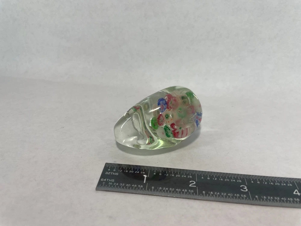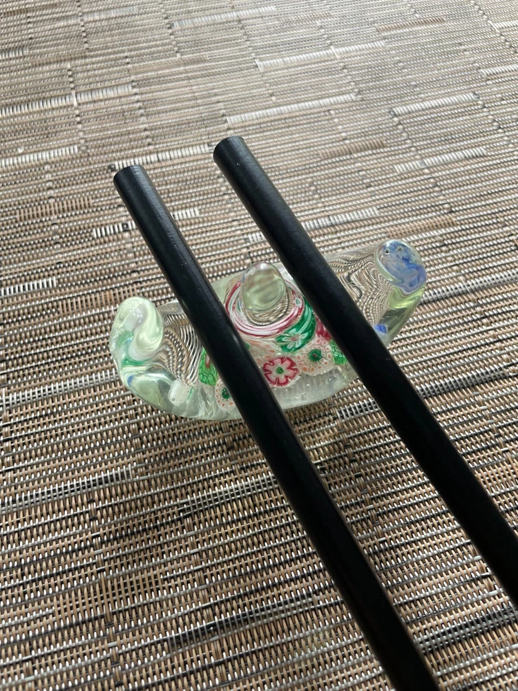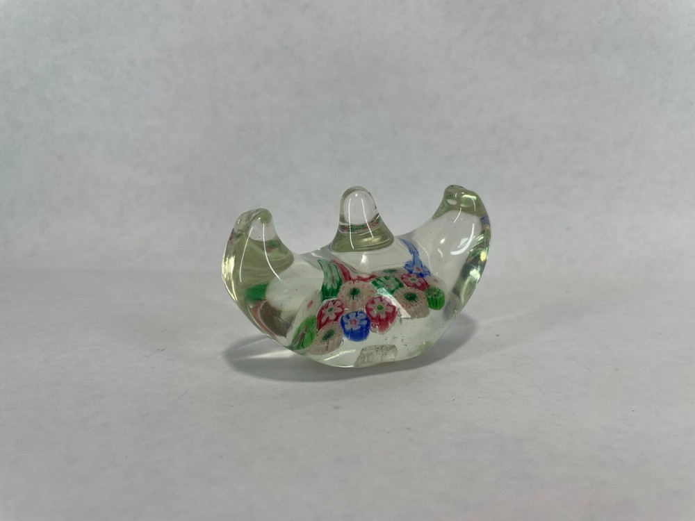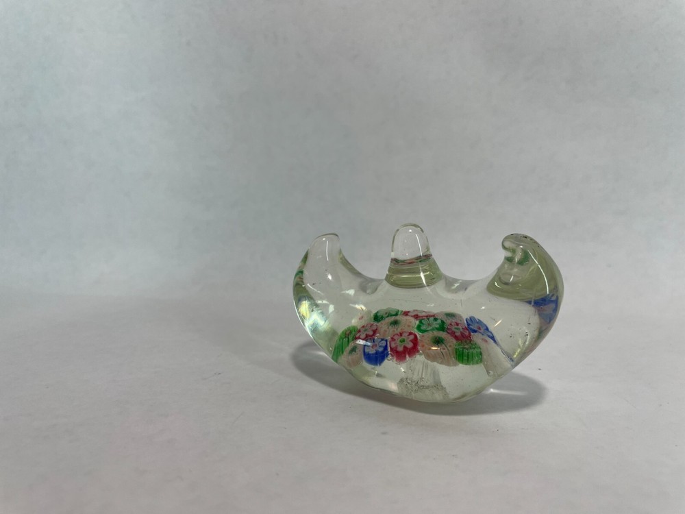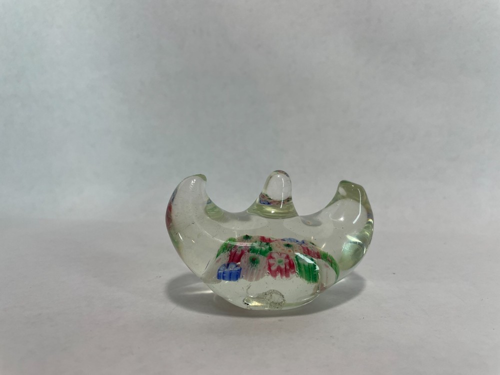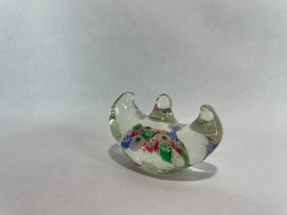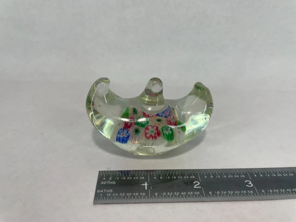 Chop Stix Holder (Chop Stix Not Included) Japanese Millefiori Vintage 1930 This vintage Japanese paperweight is a beautiful addition to any collection. With intricate details in multicolored glass, it features a chop stick holder design that is both unique and functional. Made in the 1930s, this art glass piece was crafted in Japan and has a production style that is both distinct and impressive. Perfect for collectors of paperweights or decorative glassware, this Millefiori chopstick holder is sure to impress. For Inventory - Bin #6