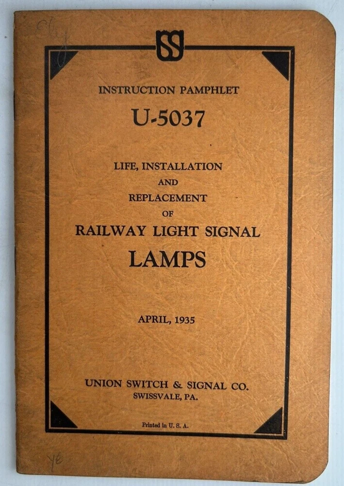 Instruction Pamphlet U-5037 Life, Installation And Replacement Of Railway Light Signal Lamps, April, 1935. Union Switch & Signal Co., Swissvale, PA. Illustrated. 32pg. Note: This item will be properly packed.