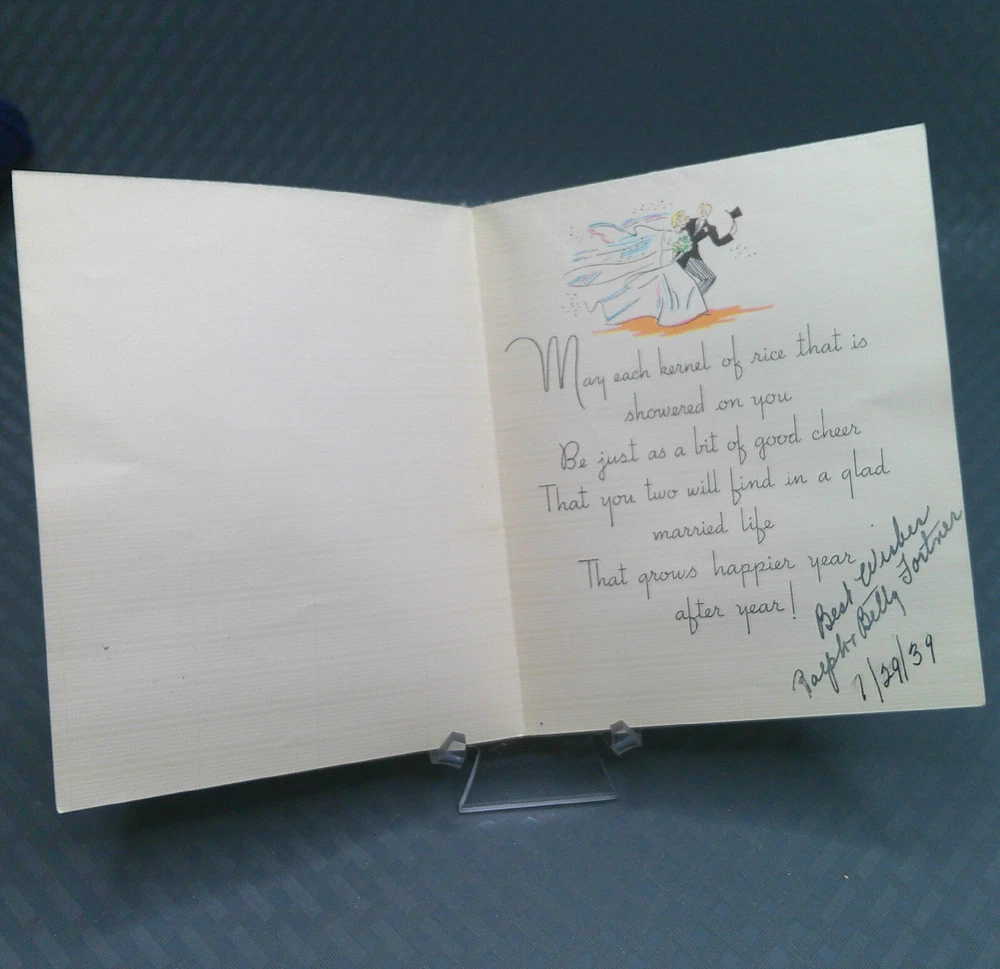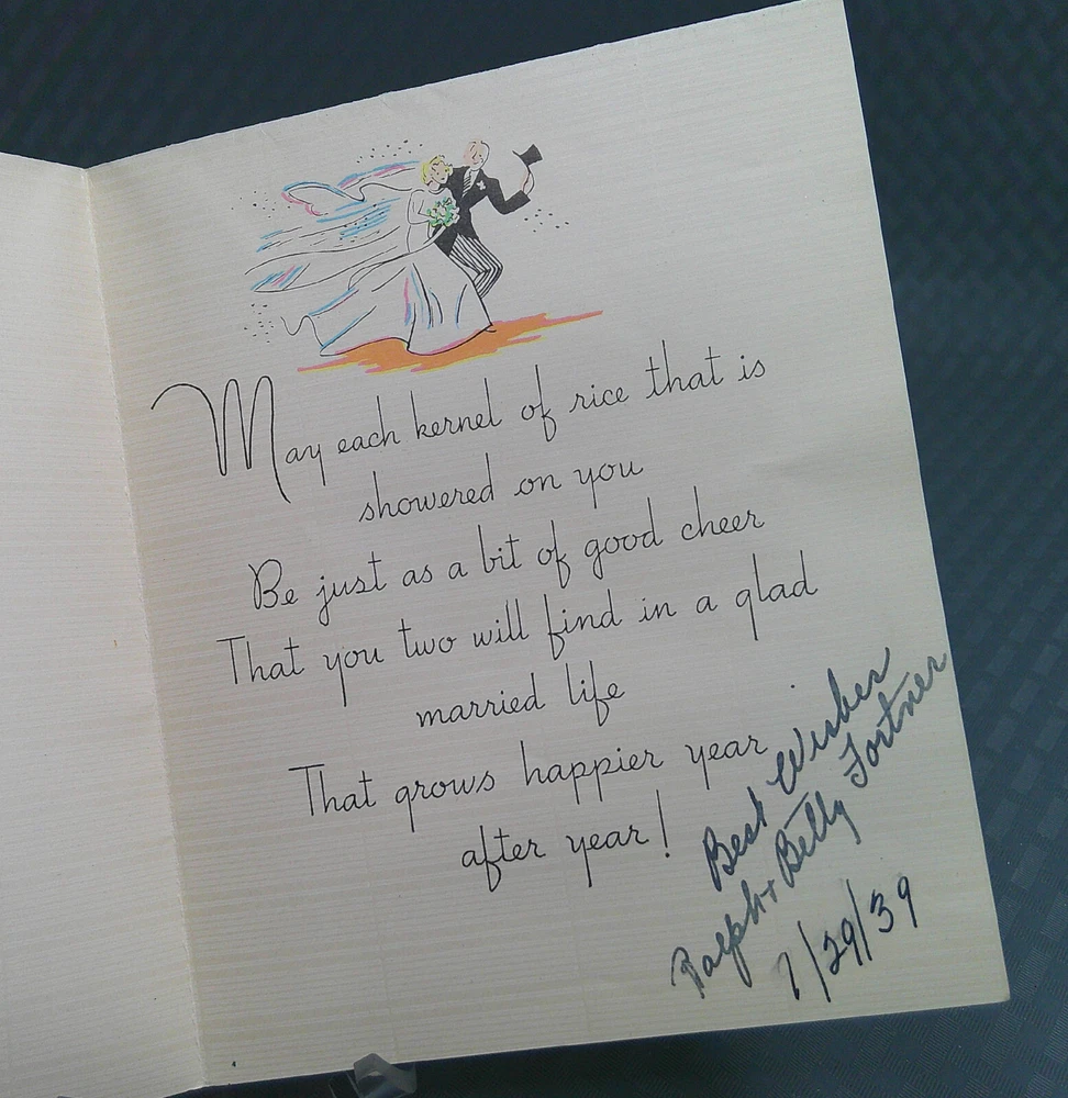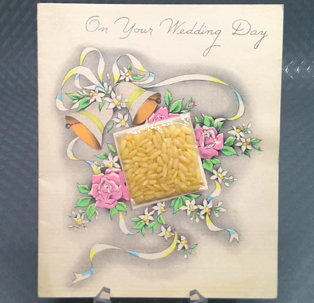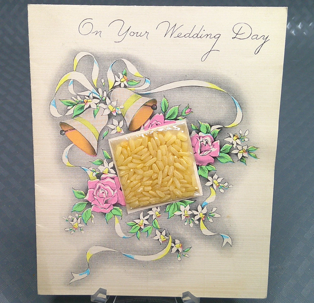 This vintage 1939 wedding day card is a beautiful piece of history. With its charming design featuring bells and flowers, and a pouch of real rice in the center, it's sure to make a great addition to any collection. The card was made in the United States and is a true vintage item from the 1930s. It's perfect for collectors of vintage greeting cards or those who appreciate unique pieces of history. This card is not handmade and is in great shape for its age. It's a must-have for anyone looking to add a touch of nostalgia to their collection.