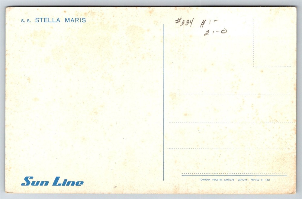 Sun Line SS Stella Maris Artist Signed Love Boat Cruise Ship C1939 Postcard G4 Thank you for visiting! This is a standard size postcard, 3.5" X 5.5". In stock, usually ships within 24 hours of your purchase. Please ask questions if you are unsure about anything. Our goal is for your complete satisfaction with the postcard and your experience. Check all my other listings in my store. RETIREDWITHBOOKS Powered by SixBit's eCommerce Solution