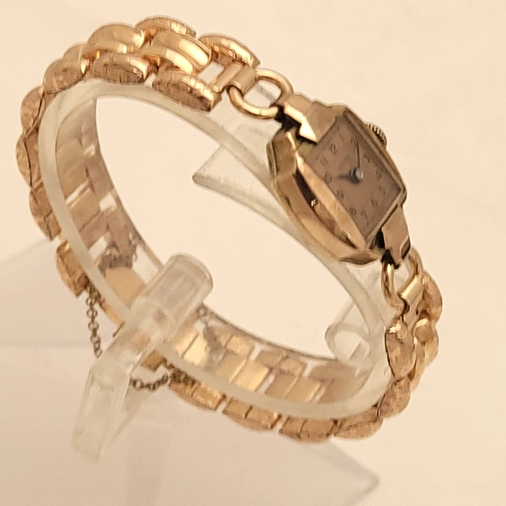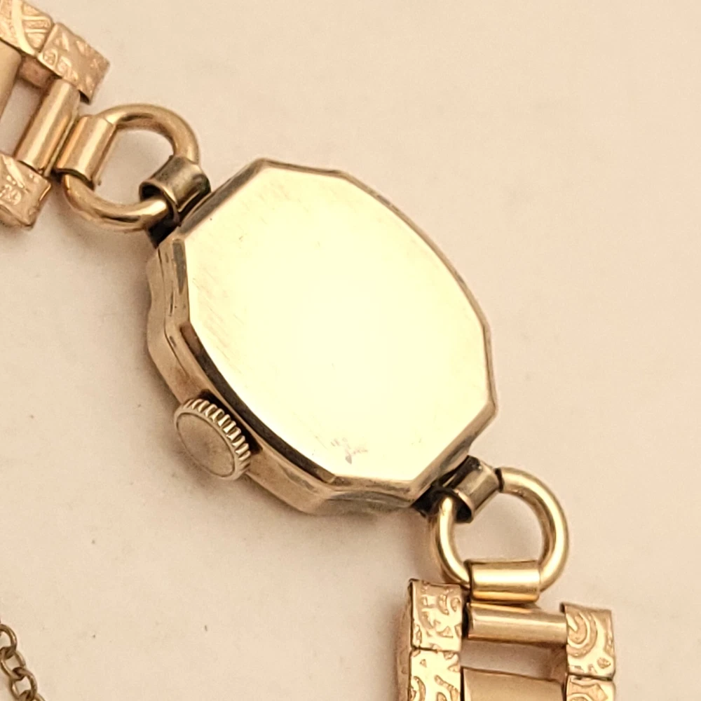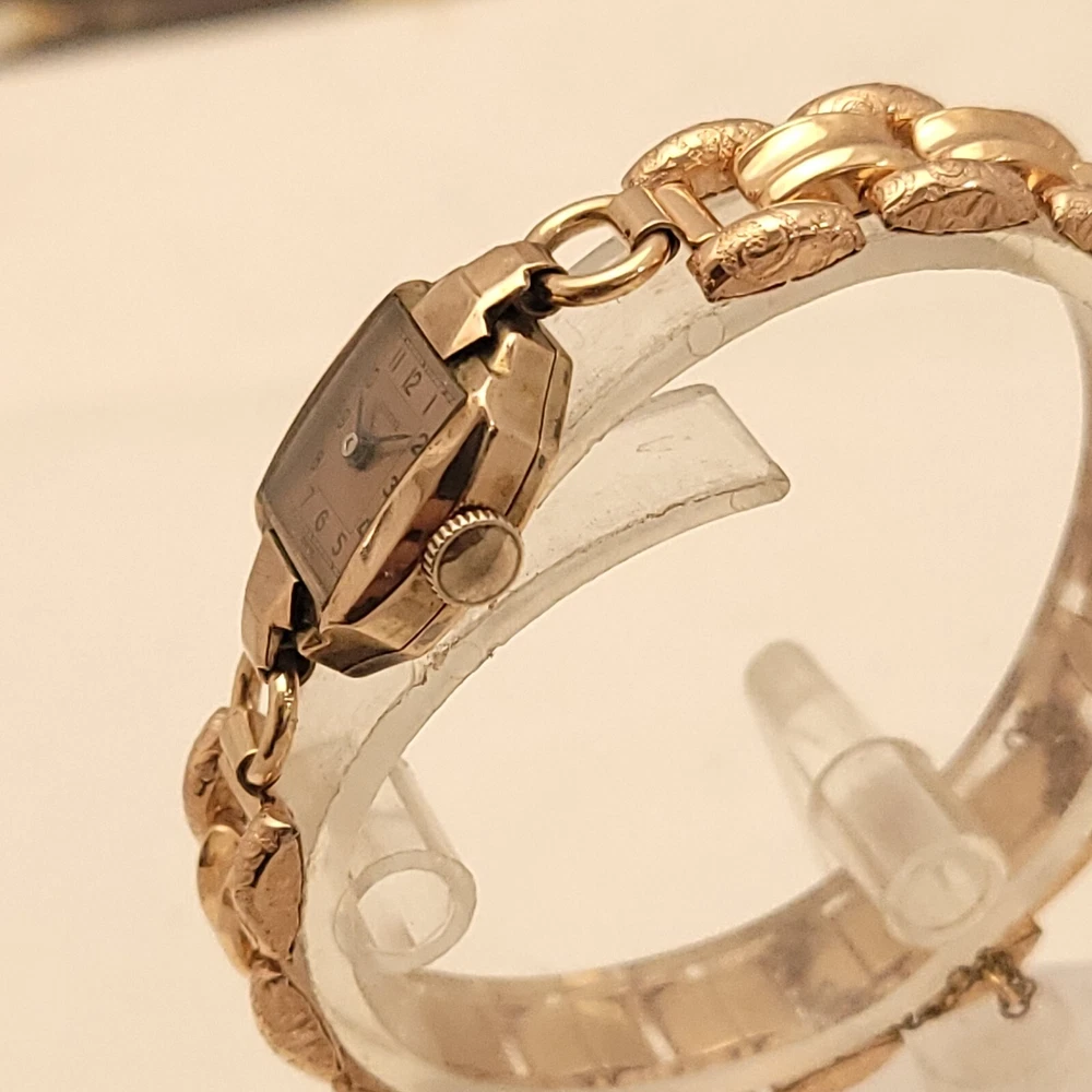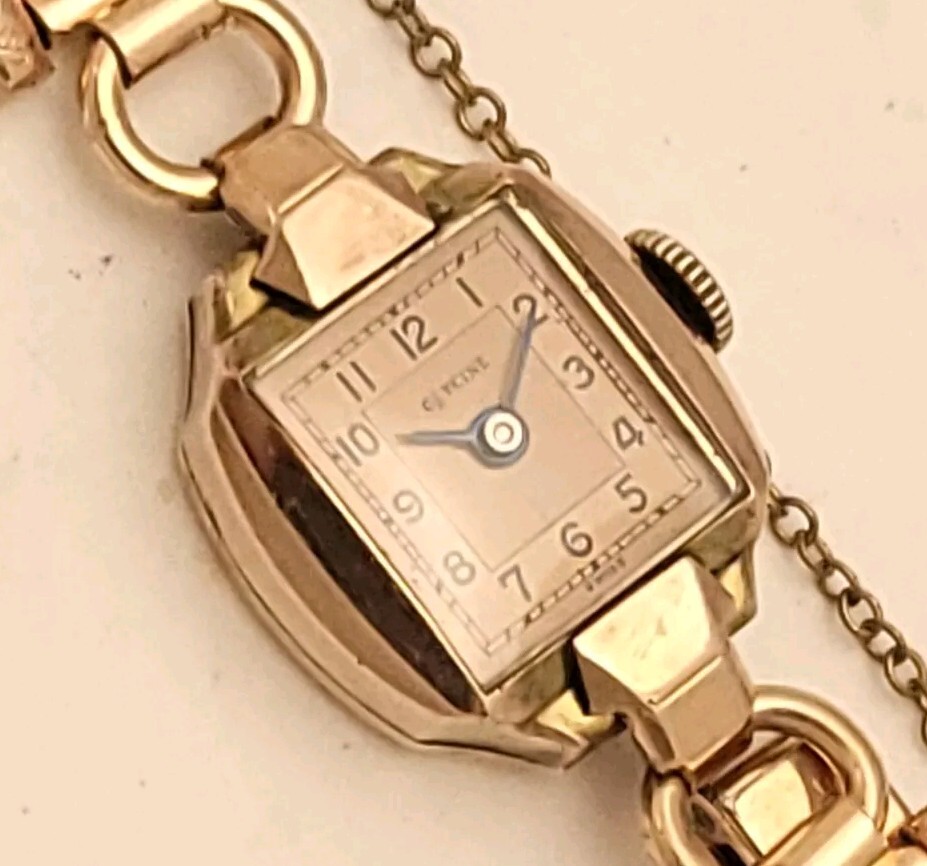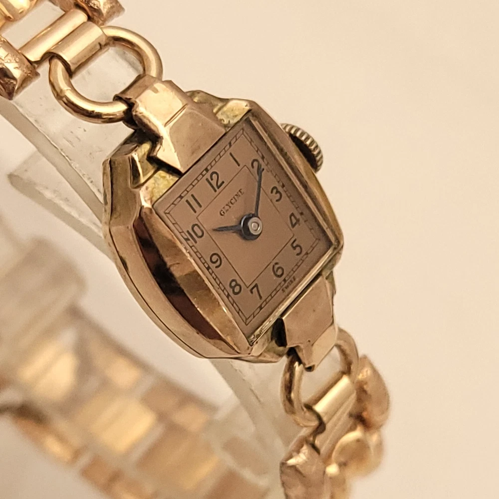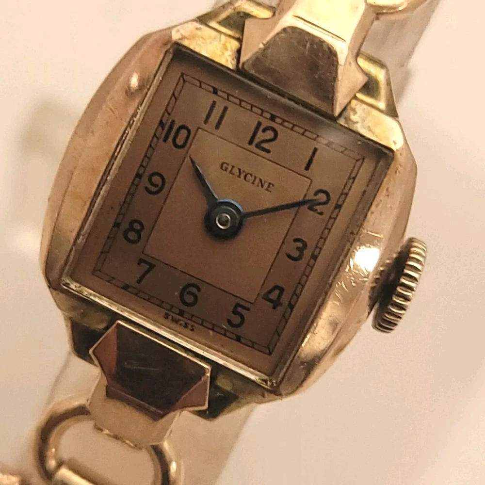 THIS IS A STUNNING 1940S HIGH GRADE SWISS LADIES COCKTAIL WATCH WITH A GORGEOUS MATCHING FACTORY ENGRAVED 1/10 12K GOLD BAND. A BEAUTY ON THE WRIST! THIS HIGH QUALITY SWISS BEAUTY IS RUNNING STRONG AND ACCURATE, WINDING SMOOTHLY AND SETTING PROPERLY, KEEPING FINE TIME. YOU'RE GOING TO LOVE TO STRAP ON THE GORGEOUS MATCHING ROSE GOLD BRACELET THAT IS FACTORY ENGRAVED. IT REFLECTS THE LIGHT WITH EVERY TWIST AND TURN OF YOUR WRIST. THIS IS A HIGH QUALITY BRACELET MADE OF 1/10 SOLID 12 KARAT GOLD. SHE WILL FIT A 6 INCH WRIST COMFORTABLY. THE DIAL IS ROSE GOLD COLOR DISPLAYING A TWO-TONE EFFECT WHEN ANGLE FROM SIDE TO SIDE. I HAD A DIFFICULT TIME GETTING A GOOD PICTURE OF THE DIAL, WHICH IS TRULY BEAUTIFUL. HER BOLD BLACK HANDS ACCURATELY DISPLAY THE PASSING TIME TO THE ARABIC BLACK HOUR NUMERALS WHICH ARE FRAMED BY A FULL TRACK OF MINUTE MARKERS. POWERING THE HANDS IS A HIGH-GRADE SWISS MADE GLYCINE 17 RED RUBY JEWELED MOVEMENT. EACH OF THE RED RUBY JEWELS ACT AS BEARINGS TO REDUCE FRICTION IMPROVING ACCURACY AND ENSURING LONGEVITY. HER MOVEMENT IS CLEAN, RUNNING STRONG AND ACCURATE. Somebody is going to be very pleased when they place the winning bid. _____________________________________ Take a few minutes and read some of the tens of thousands of positive feedback that we have received from our users here at Decowatches and our sister site Decowatchesparts and you will understand why buying a watch from us is an enjoyable and safe experience! Our shipping fee ensures that this watch is carefully packaged, has door to door tracking and comes with a three-month service warranty for your added piece of mind satisfaction and convenience! We are pleased to say that we are now shipping twice a week, either Wednesday or Thursday and Saturdays. Good luck to you all! If you enjoy collecting vintage watches as much as I do, after you place your winning bid, click on save seller next to our username. Then you can easily check back often as I will be listing a few magnificent vintage mens watches this week and every week. This week we will have a bunch of magnificent and rare watches listed.