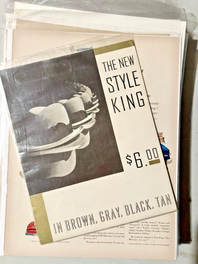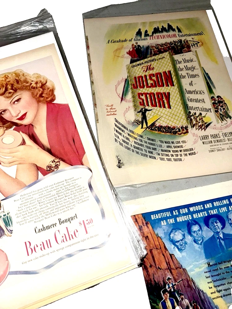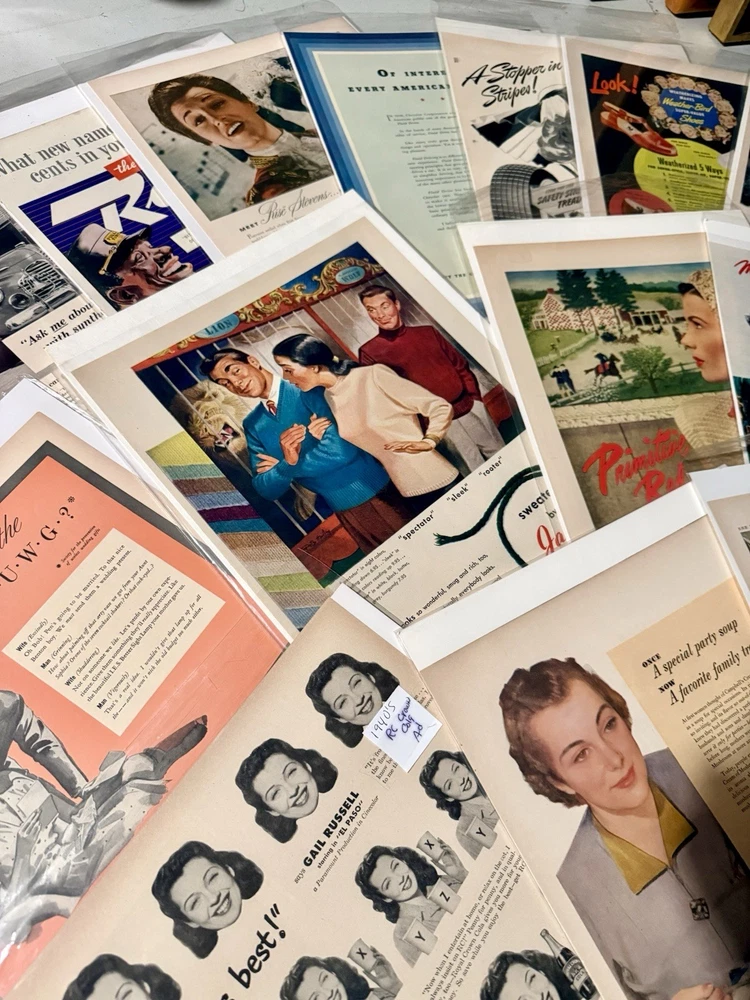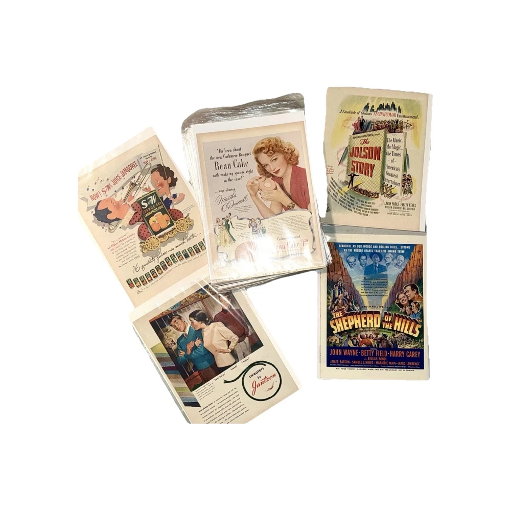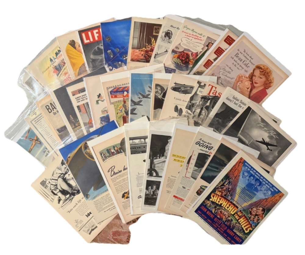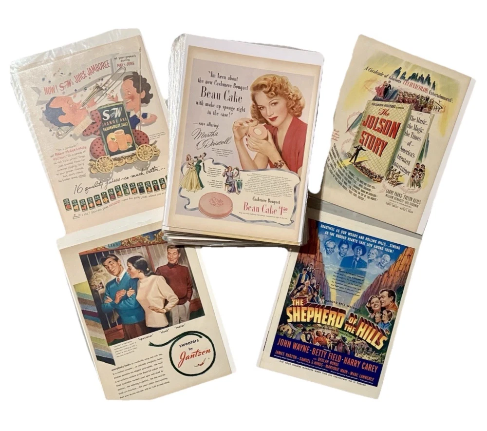 Item Identification • Type: Vintage print advertisements and graphic arts ephemera collection • Quantity: Fifty-six total pieces • Contents: Fifty-five original vintage print advertisements and one countertop printer’s sample advertisement • Format: Complete two-page spreads with printed content on both front and back (print ads) • Era: Mid 20th century • Decades Represented: 1940s–1950s • Country of Origin: United States • Advertising Subjects: Mid-century Americana, fashion, food and beverage branding, Hollywood film promotion, aviation and military imagery, automotive design, lifestyle and consumer culture • Printer’s Sample: Wheelwright Ionic Blank paper stock sample by Henry Lindenmeyr & Sons • Sample Specifications: 10-ply white paper, 22 x 28 size, 133-screen halftone • Ink & Press (Sample): Sigmund Ullman Essyew Walnut ink, Sleight’s Gold Ink, printed on a Universal Press • Original/Reproduction: Original vintage pieces, not reproductions • Storage: Individually sleeved for protection • Vintage Status: Vintage originals ITEM DESCRIPTION This estate-curated collection presents a visually rich archive of mid-century American advertising and print culture, spanning the 1940s and 1950s. The fifty-five print advertisements are complete two-page spreads with printed content on both front and back, offering a fuller and more immersive presentation than the single-page pulls commonly found on the market. Subjects range from iconic food and beverage branding and fashion illustration to Hollywood film promotion, aviation, military imagery, automotive design, and domestic Americana, capturing the optimism, design language, and consumer energy of the era. The inclusion of a vintage countertop printer’s sample advertisement adds depth and credibility to the collection, providing insight into professional paper stock, ink usage, and halftone printing techniques used during the period. Together, the pieces form a cohesive and highly displayable archive suited for framing, interior décor, studio reference, graphic design inspiration, or serious ephemera collecting. All advertisements are original vintage examples and are individually sleeved to preserve condition and presentation. FAST SHIPPING WITH EXTRA CARE • Every order is video recorded during packing and unpacking to ensure authenticity • Tamper-proof seals applied where applicable for added buyer protection • Eco-conscious shipping with recycled materials when possible • Estate Curated items, including high-end collector pieces to everyday essentials • Extensive selection of action figures and collectible toys, from pristine original packaging to vintage and antique finds • Visit our eBay preferred vendor store, Hampton to Hampton: https://www.ebay.com/str/hamptontohampton