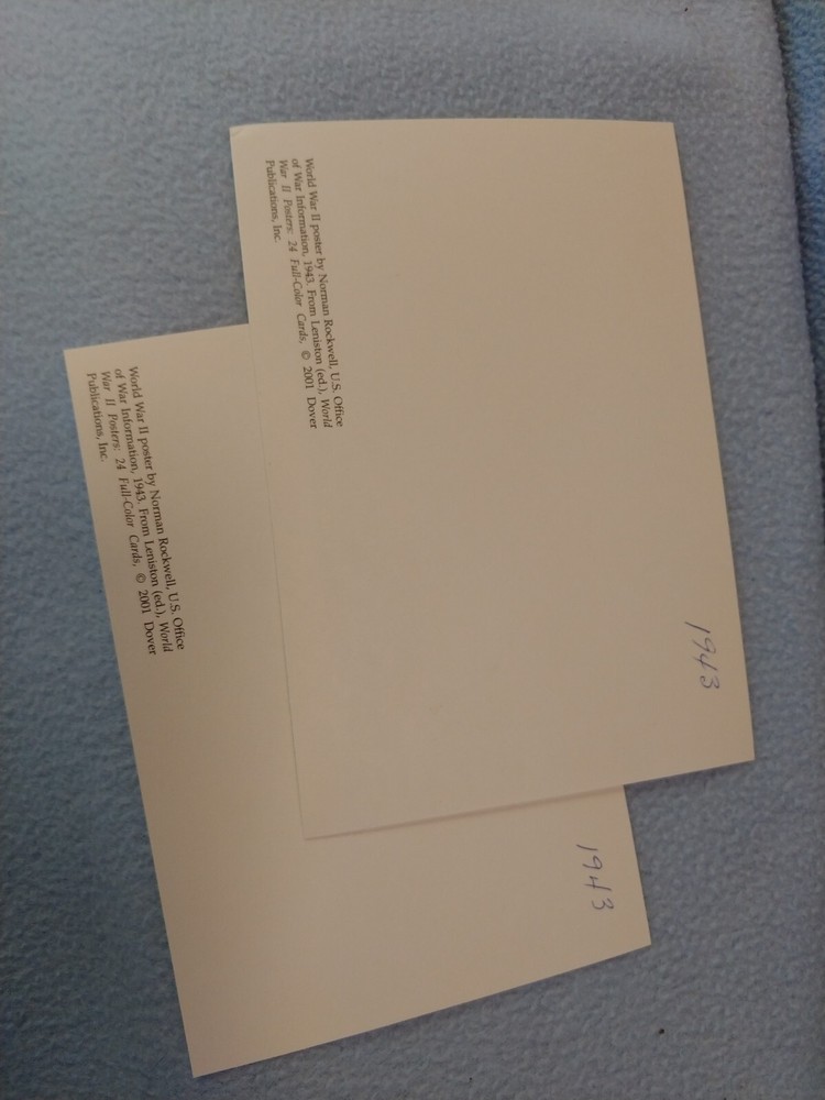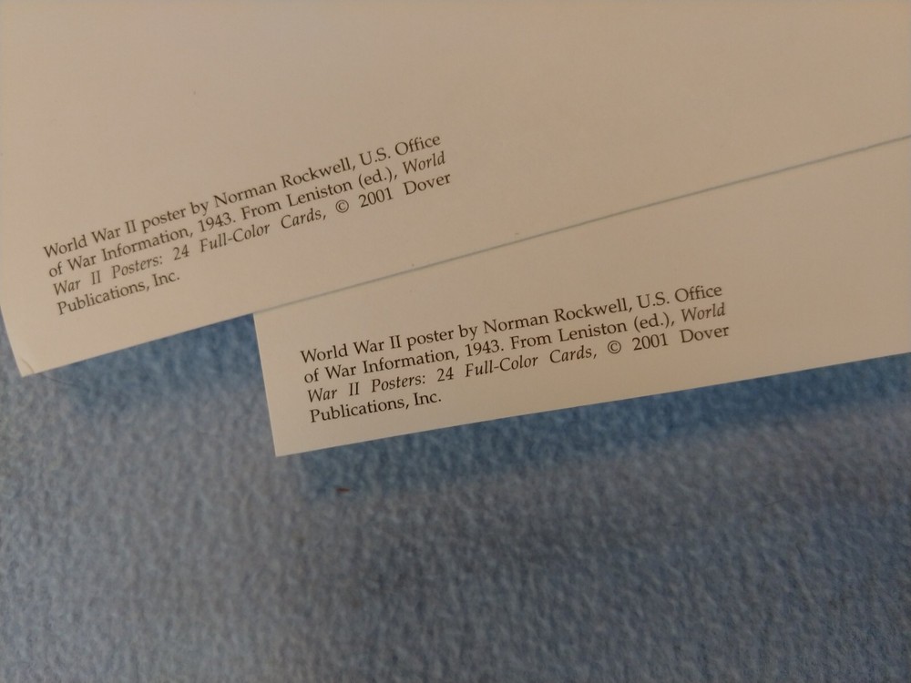 City: Norman Material: Paper Postage Condition: Unposted Occasion: WWll Year Manufactured: 2001 Number of Items in Set: 2 Time Period Manufactured: 2000-2009 Subject: World War ll Country/Region of Manufacture: United States gtin13: Does not apply Type: Printed (Lithograph) Size: Continental (6 x 4 in) UPC: Does not apply Artist: Norman Rockwell Brand/Publisher: Dover Publications