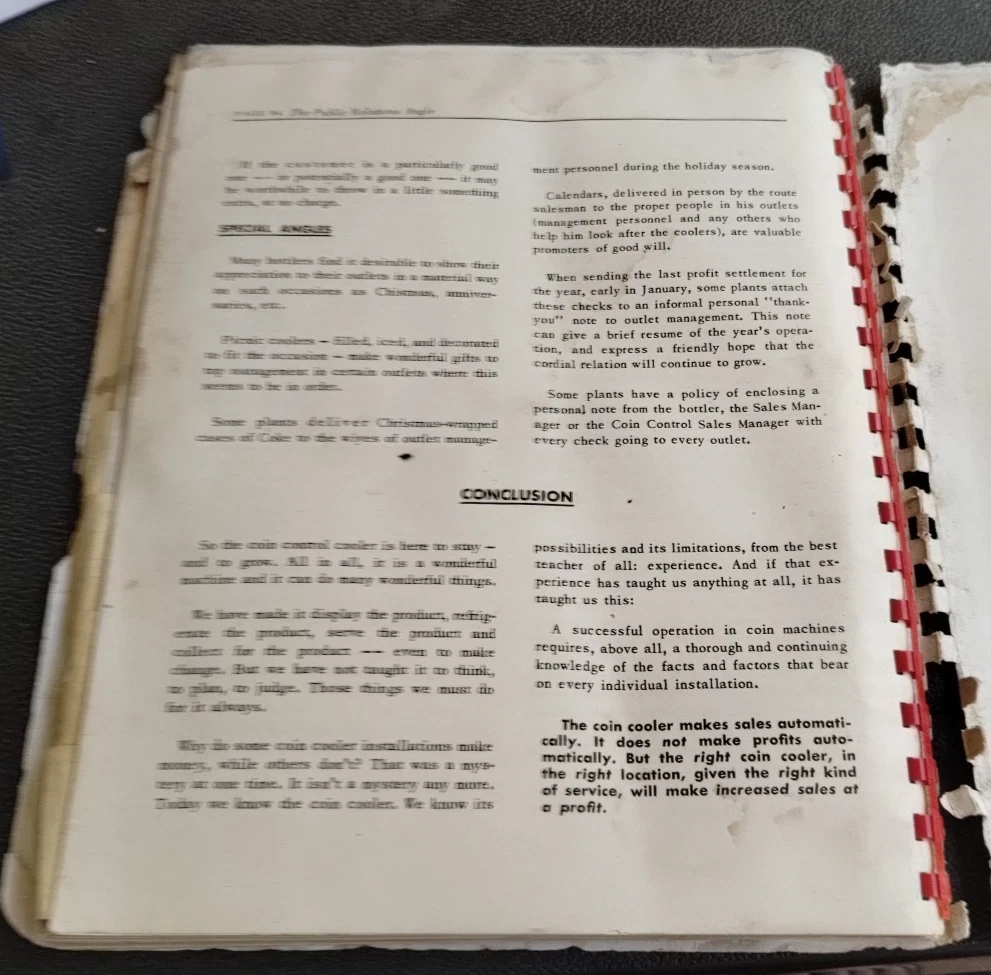 Coca-Cola 1949 Coin Cooler Manual Salesman Training Vintage Sales Department The front and back cover are a little rough but the pages are fine. Interesting read. Training on placing and selling coin coolers. Satisfaction guaranteed. 30-day return policy. We are a pet free and smoke free home. The photos are an important part of the description, please look at them closely before buying or bidding. If you have questions, please ask BEFORE you buy or bid. I am an honest, straight forward person. If there is a problem with your purchase, for any reason, please contact me before leaving feedback, and give me an opportunity to remedy the situation. I want us both to be happy with the transaction. Thanks. If you purchase MULTIPLE ITEMS that go out in the same shipment, I will automatically refund you the shipping difference when I box your items up. There is nothing for you to do. Terms, Policies, & About Me: Thanks for checking out my listing and welcome to my eBay store. My name is Chuck Holmes. I live here in sunny Homosassa, Florida with my amazing wife, Rachel. I want you to have a pleasant eBay shopping experience. I stand behind everything I sell. My goal is to have HAPPY, REPEAT, LONG-TERM customers. Feel free to shop around my store. We add new items almost every day, so check back often! Shipping: I ship items Monday through Saturday. Most items ship within 1 business day and all items ship within 2 business days. Items are packaged securely and come with a tracking number. Expensive items are insured and come with signature confirmation. I do combine shipping to save you money when possible. If you plan on buying multiple items, or have already done so, please wait for a combined invoice before paying. If you already purchased multiple items and they go out in the same box, I will automatically refund you after I box the item up. Listings: I do my best to provide accurate descriptions. I have no desire to mislead anyone. Please take a close look at the photos. They are an important part of the description. If you see an error in one of my listings, please message me and let me know so I can fix it. Returns: All items come with a 30-day, no questions asked, money back guarantee (unless otherwise stated in the listing). Please know upfront, I do not do partial refunds. In the event you want to return an item, you can open a return in eBay, print a label, and ship it back to me. When I receive the item back from you, I will refund you your original purchase price. Feedback: I leave feedback several times per week, after people pay for their item. I would appreciate if you left me positive feedback when you receive your item. If for some reason there is an issue with your purchase, please contact me prior to leaving a neutral or negative feedback, so we can sort it out. I would appreciate that. About Me: I love selling jewelry, coins, photos, sports cards, unusual items, watches, fishing lures, and other vintage, collectible items. I've been a reseller for 20+ years. When I'm not listing stuff for sale on eBay, my hobbies include reading, writing, watching funny movies, fishing, and treasure hunting with my wife. Thanks for stopping by. Have a fantastic day! Be sure to check out my other items, too.