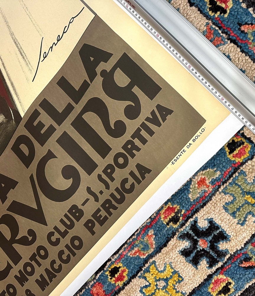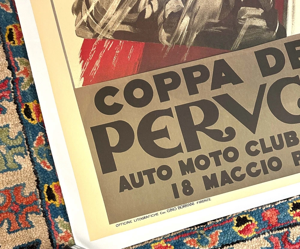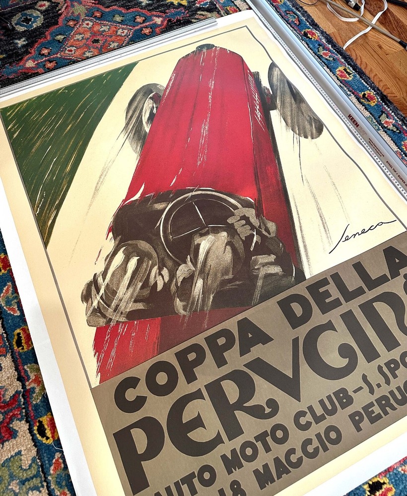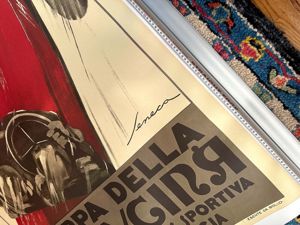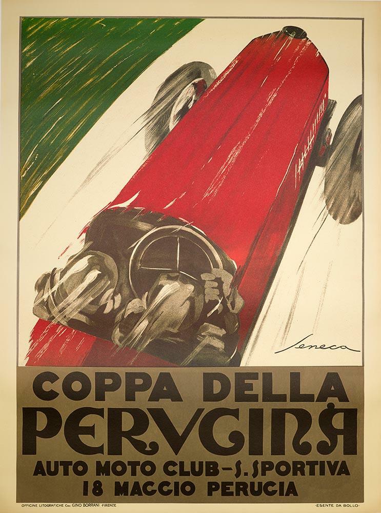 PosterFrance - Poster Classics LLC With locations in France and the USA, selling vintage French and Italian posters for over 30+ years COPPA DELLA PERUGINA BY FEDERICO SENECA 1950 Title Coppa Della Perugina Artist Federico Seneca Date 1924/1950 Printer Gino Borrani, Florence Size 39 x 55 inches Print Type offset Lithograph Condiiton Excellent on linen Comments The poster was originally created in the 1920's for the editions of the Coppa Della Perugina race. The race was put on by the Auto Moto Club and Sport of Perugia The Futurist designs were well ahead of their time. Image made famous by Seneca in 1920 this was made in the 1950's by the original printers to celebrate important posters done in earlier years and given out as gifts About us: Poster France LLC and Poster Classics SRL have been selling vintage posters for the last 30+ years. We've just relocated from the French Alpes to Cape Cod and Sarasota. What started out as a collecting hobby in 1980's quickly became a large collection and then a wholesale, then a retail business. Vintage travel posters, Theatre posters, anything that is Vintage poster we are interested. We are Specialists in French and Italian Poster Art. We have acted as experts in Antique posters for the Financial Times of London, Wall Street Journal, Forbes Magazine, Daily Express, Antiques Roadshow and Museums and private collections and more. Enjoy your visit to our online sales and if you have any questions please feel free to write us