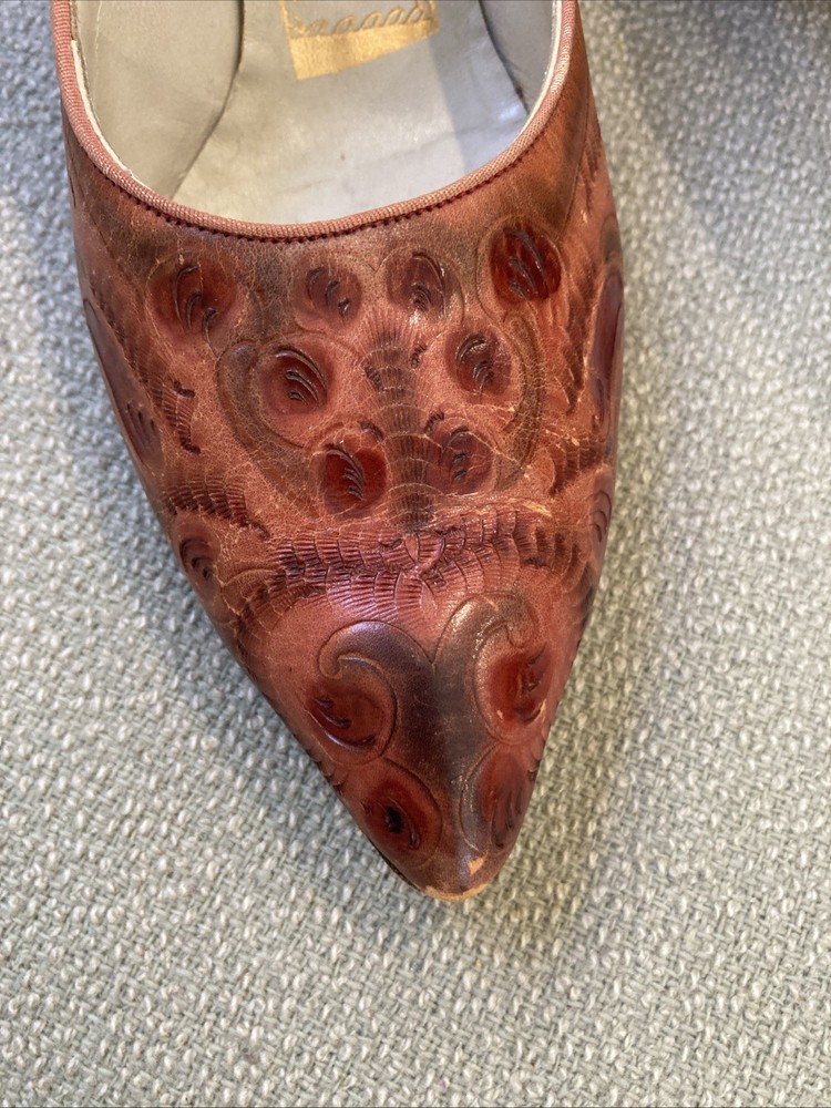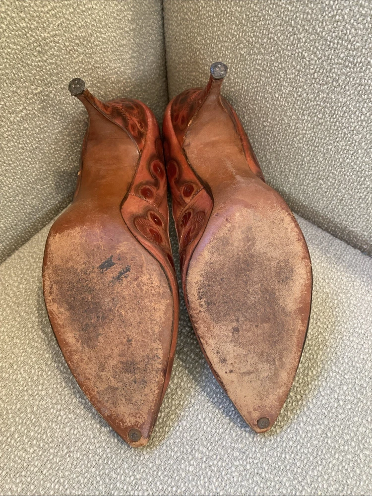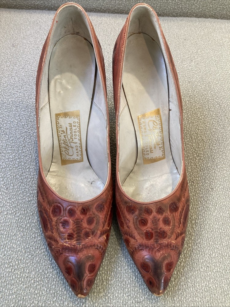 Fabulous vintage mid-century hand tooled leather high heels made by “Clifton’s” Princess in a warm brown with burgundy highlights. In good condition with small scuffs at the tip of the toes and on the right heel. Perfect for parties and costumes!
