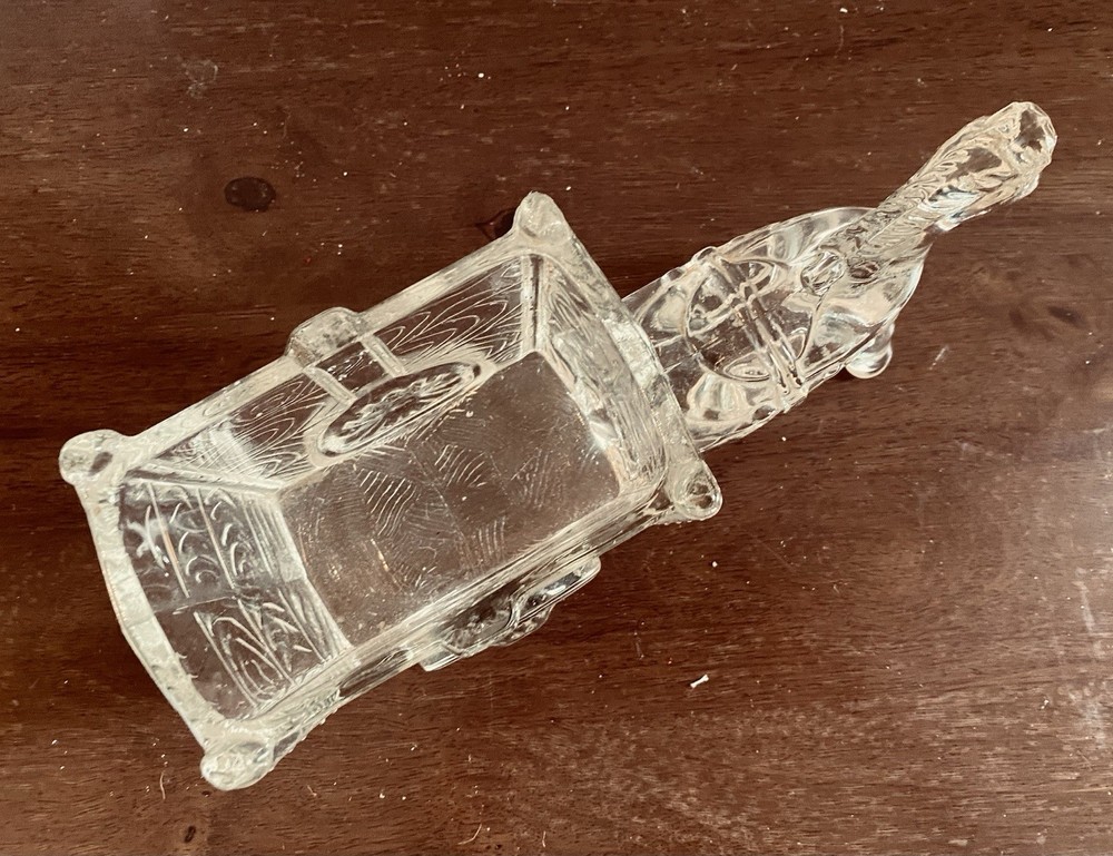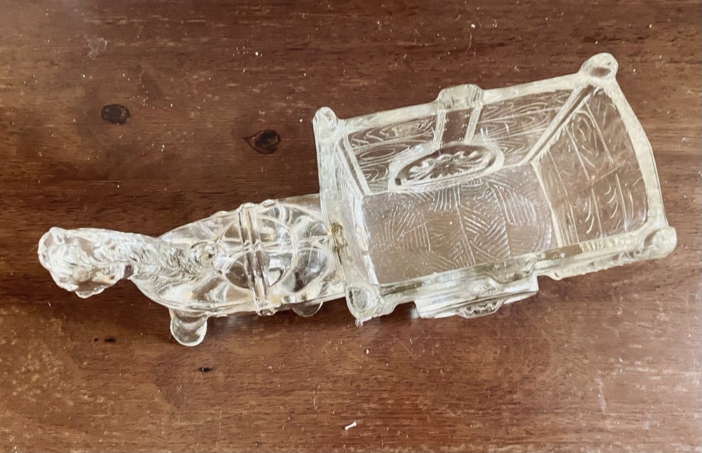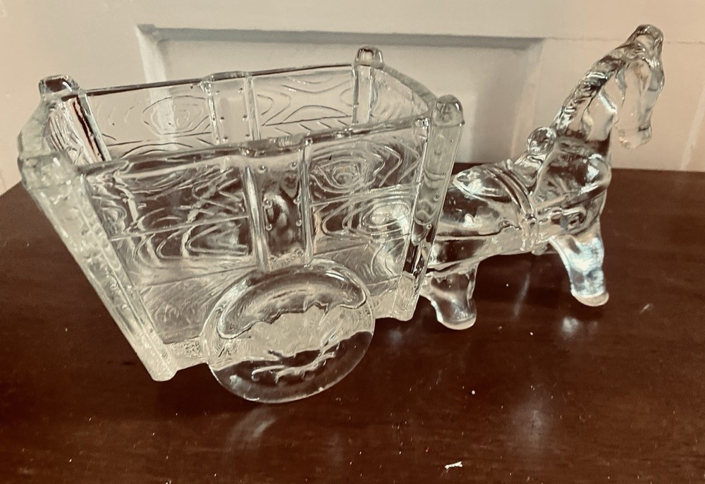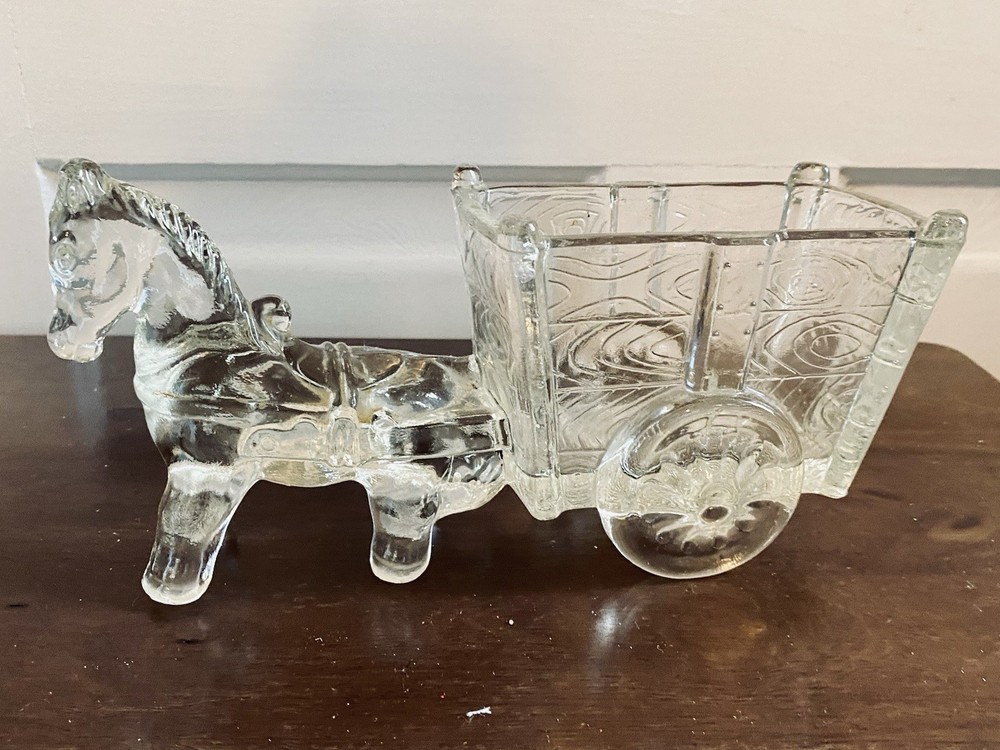 This vintage Jeannette crystal horse and cart serves as a unique MCM candy dish or catchall, with and a sturdy design measuring almost 10 inches in length and 3 inches in width. A charming addition to your vintage crystal collection, this unique piece captures the essence of mid 20th-century aesthetics. Weighing 2.25 lbs, this figurine is a beautifully crafted collectible that adds a touch of nostalgia to your home.
