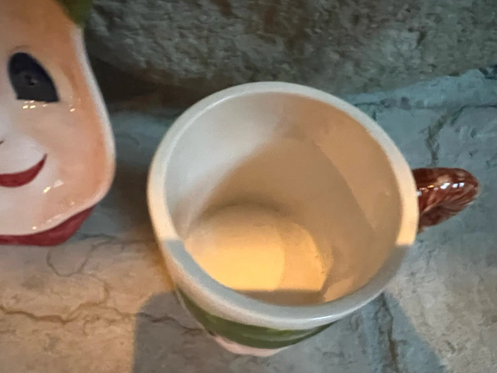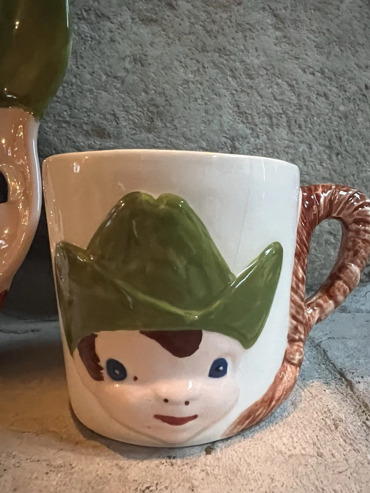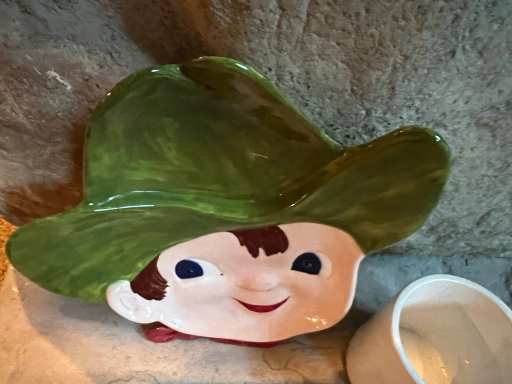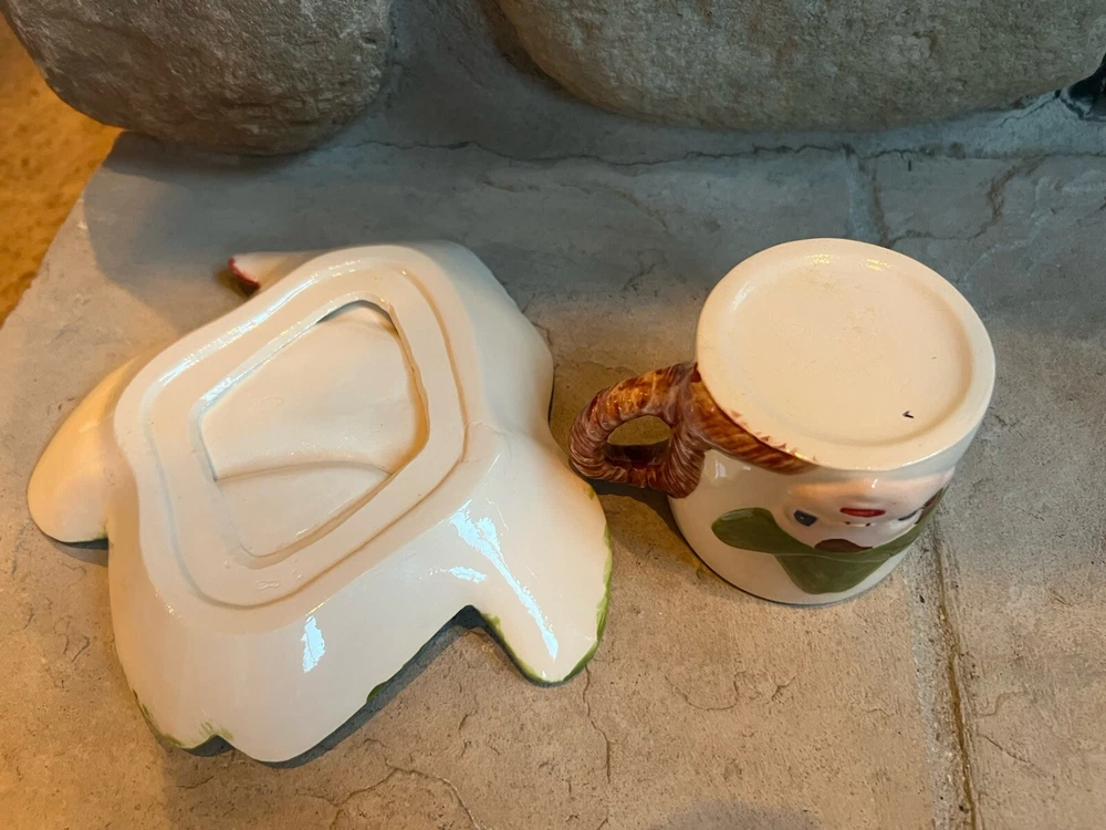 This is a vintage 1950s cup and saucer set featuring an Elf Cowboy design, hand-painted on ceramic pottery. The set includes a cup and a saucer in multicolor hues. The production technique used is pottery, with a painted backstamp indicating the origin and authenticity. This charming and unique set would make a delightful addition to any collection of decorative cookware or dinnerware from the mid-20th century.