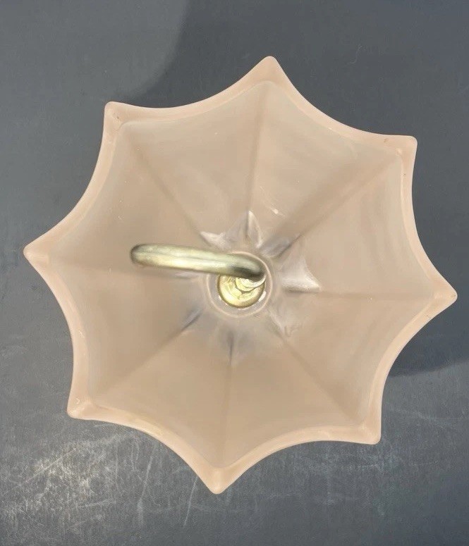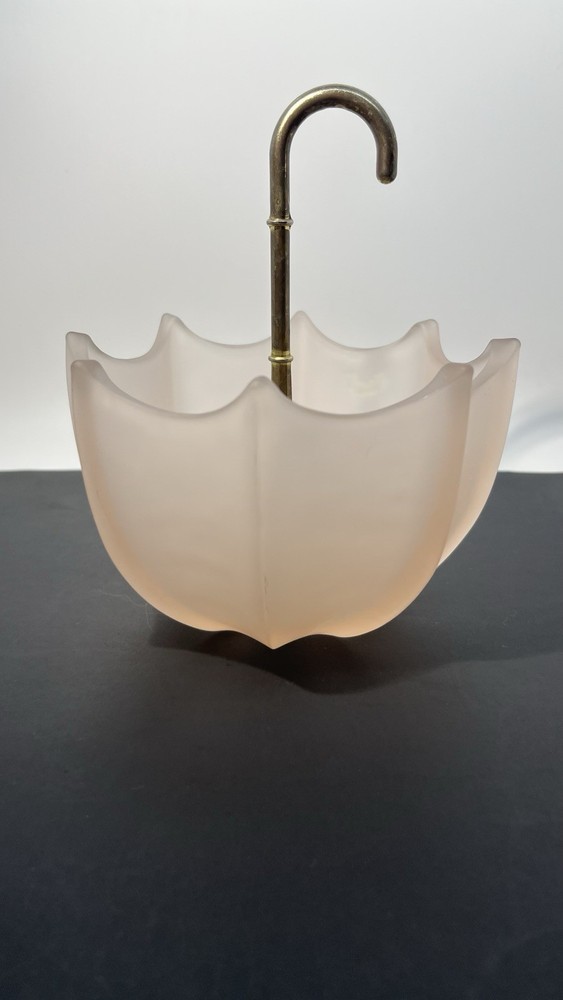 Height 6.5”, diameter 5.5” Add a touch of vintage charm to your home decor with this beautiful Fenton pink frosted satin glass umbrella trinket dish. The dish features a unique umbrella shape, making it a perfect addition to your art collection. The decorative handle allows for easy movement, while the solid pattern and satin finish provide a classic, elegant look. This one-of-a-kind figurine was produced in the 1950s in the United States and is a testament to the quality of art glass from that era.