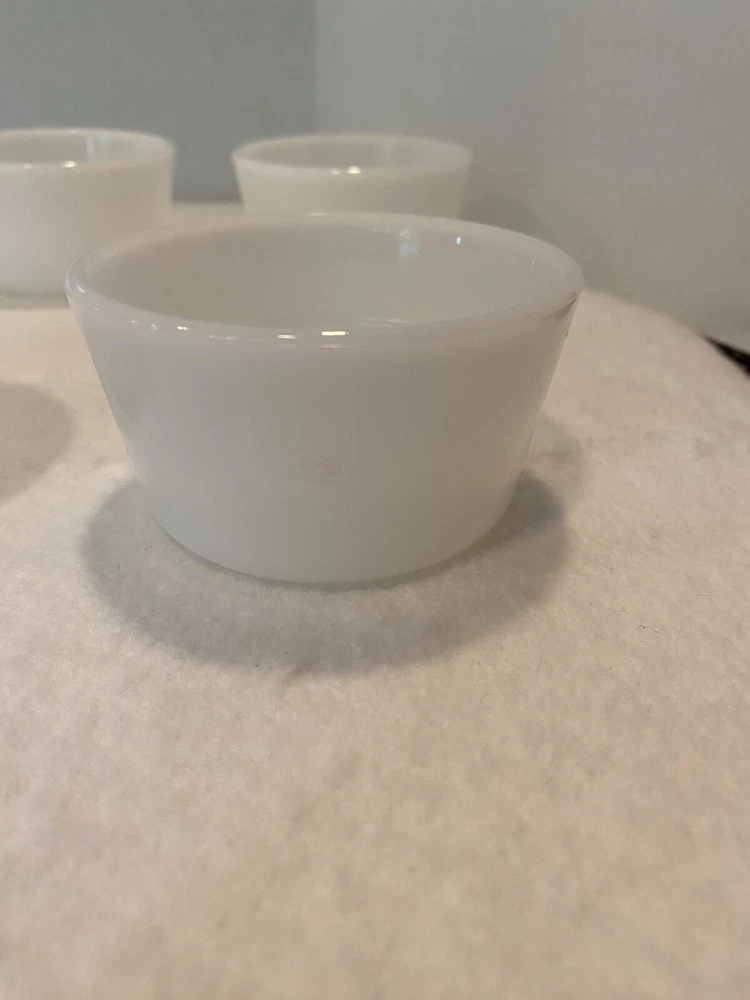 Set Of 4 Vintage 1950s Glasbake Milk Glass Custard Cups Bowls Ramekins EUC There are a couple small marks on the bowls, but no chips or cracks. Bowls are in excellent preowned, vintage condition. Please see pictures for full description. Set #1