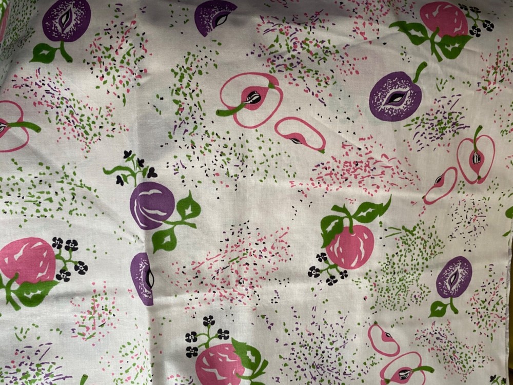 Vintage MCM 1950’s fruit - apples plums & pink cherries, design on white background cotton fabric. Pink purple green design 2 yards plus 10”, 34” wide Fabric may have dust marks where folded due to age and storage. Fabric has been stored in a trunk for decades so it has a slight old fabric smell. Smoke free home Any questions please email me before purchasing Please read entire description and examine all pictures before purchasing this vintage item.