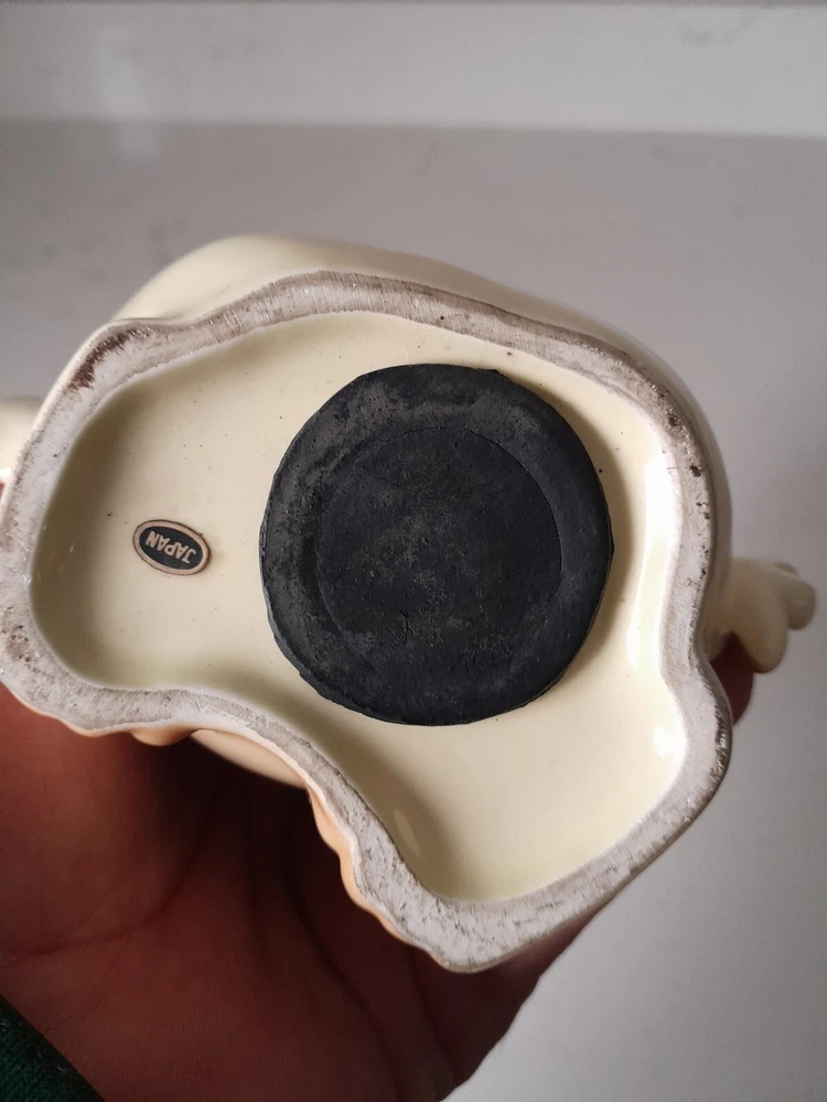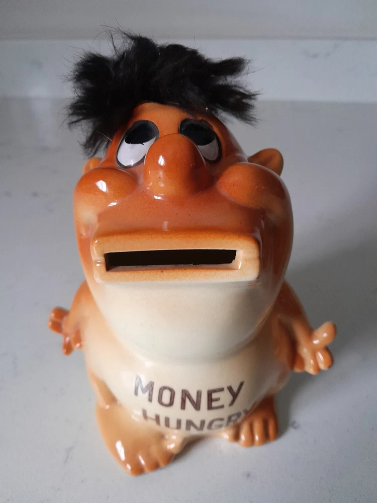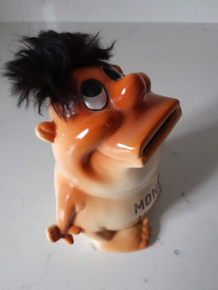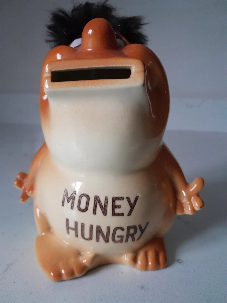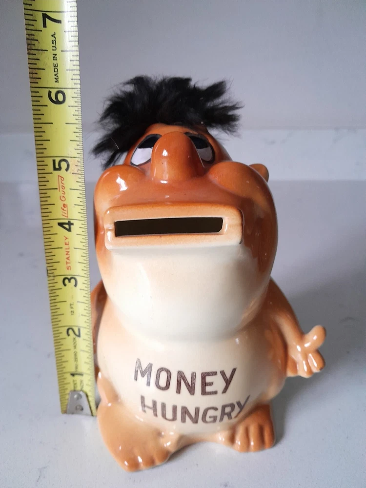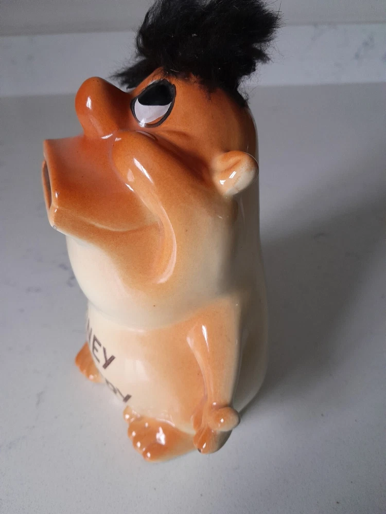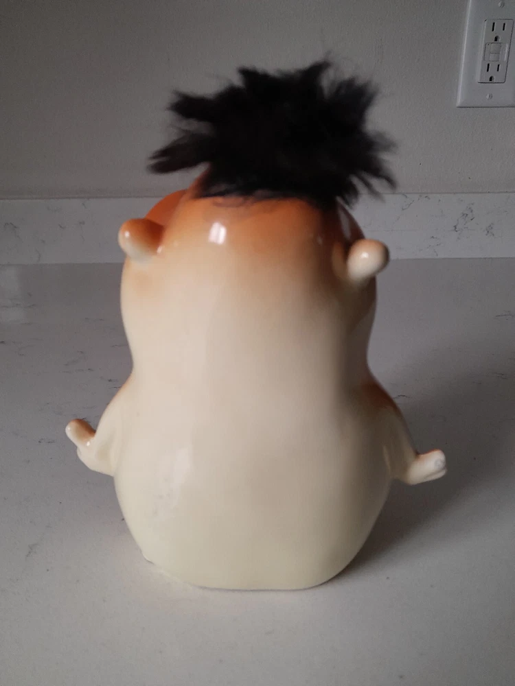 This vintage 1950's Kreiss money hungry figurine bank is made of ceramic and was manufactured in Japan. The orange color adds to its kitschy memorabilia charm, making it a unique and collectible item. The bank features an animal-shaped design, adding a whimsical touch to any collection.