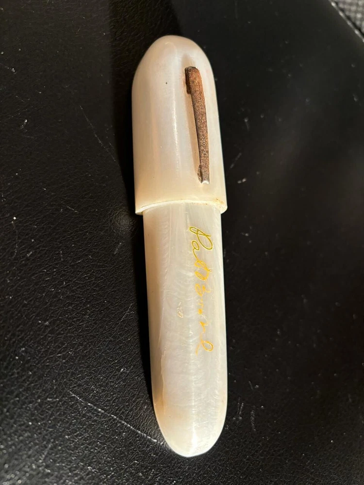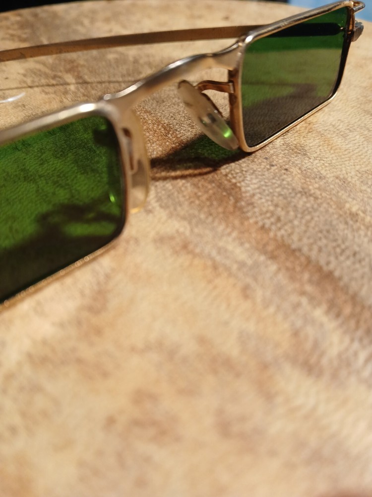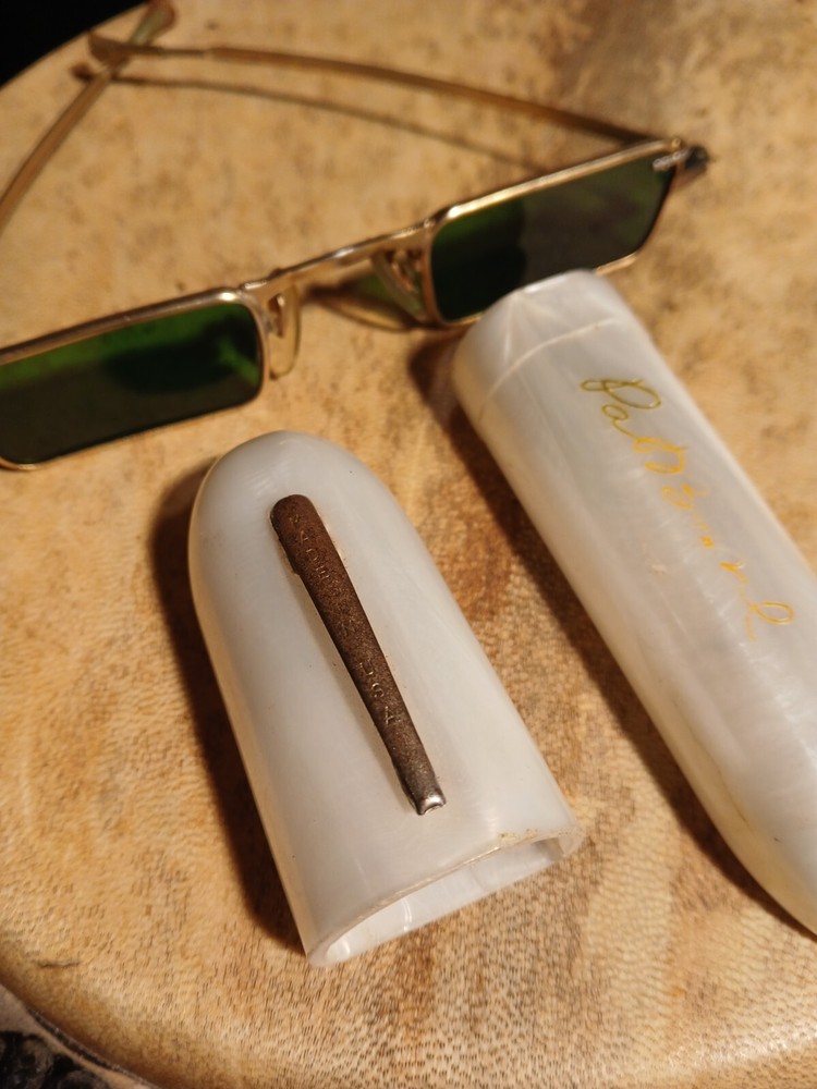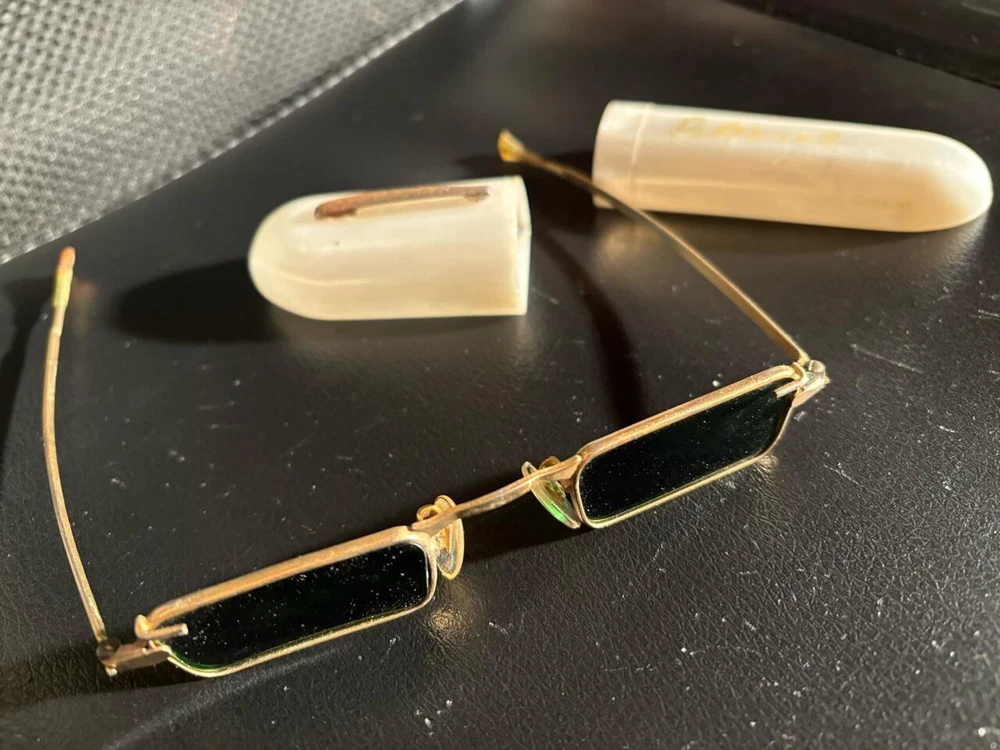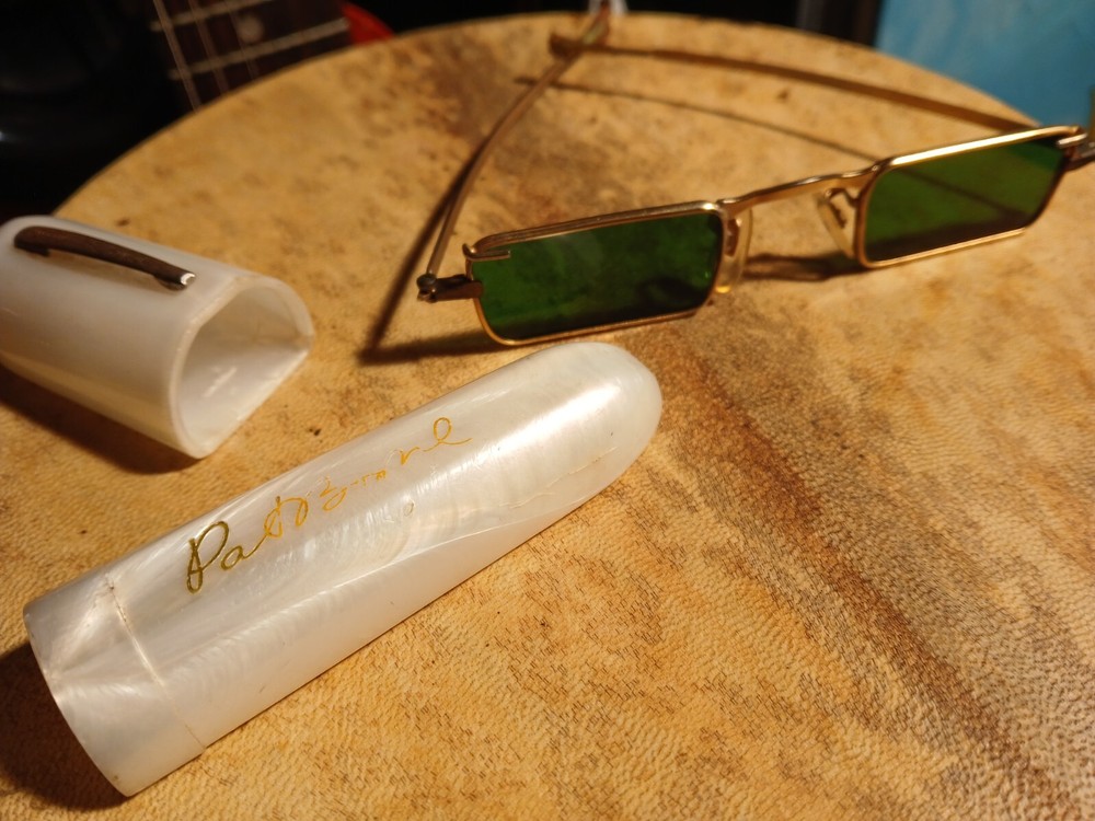 Picked up way back in the day, Antiqueing with my Grandma Ruby and Dad This set here is a definite, true pair of Made In The U.S.A., not a remake, Pat Boone Green Lens Folding Sunglasses! This set is accommodated and fit with their original nose and ear pads. Sports a Mother of Pearl Case and made to fit within your sports coats' pen shaped pocket. The attachable style visor these glasses can rock can easily be found online. I've only found actual, not remakes, Circa 60 1950's online in other places twice. One set for $4500, another set marked down to $2500. This set can truly make any actual collector or enthusiasts' dreams come true! You can never lose with a Lennon!
