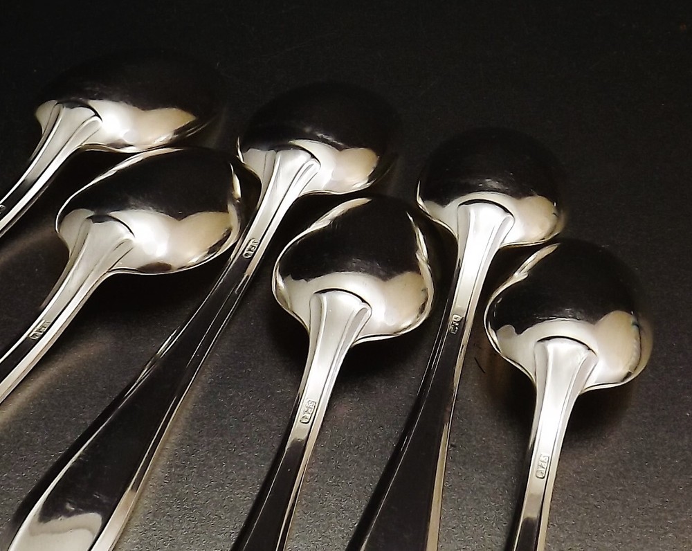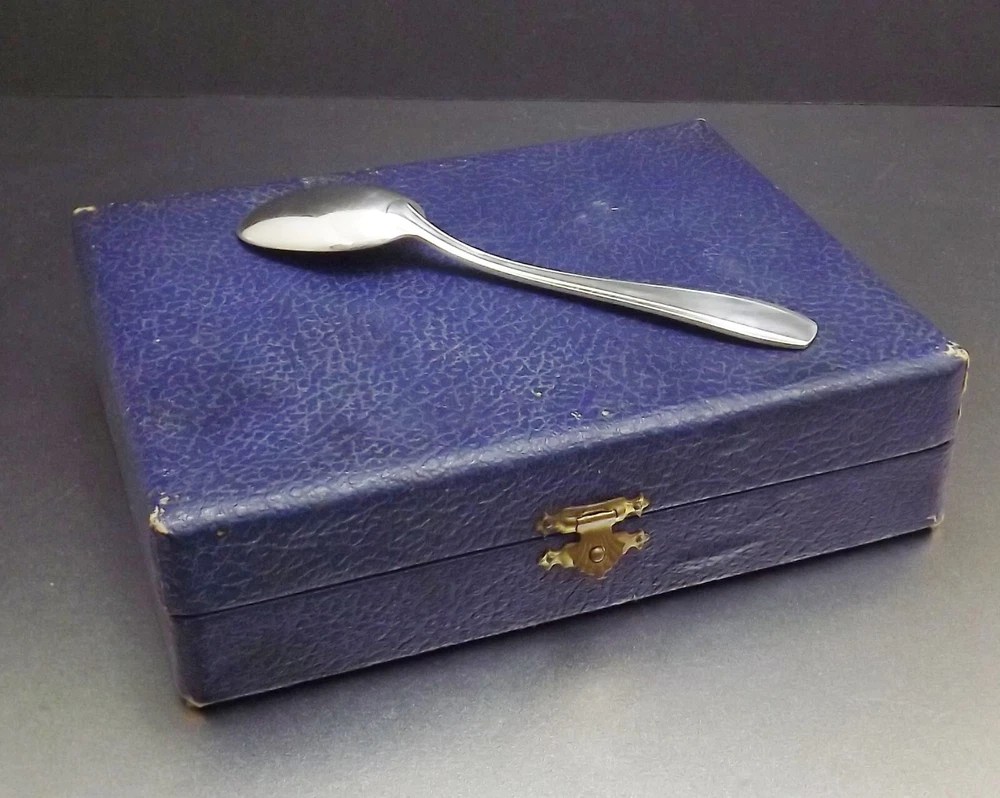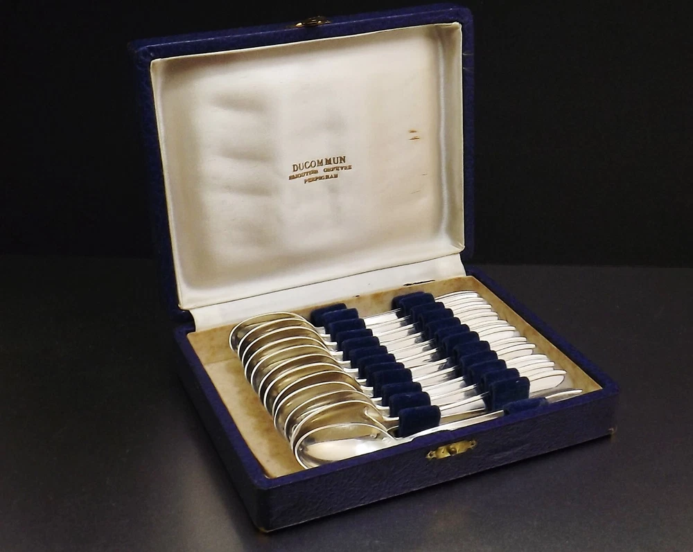Cuillères à café Art Déco. *** 12 pièce en métal argenté . *** Orfèvrerie SFAM Chambly . *** Epoque années 1950 . *** Dimensions : longueur cuillères 140mm. Poids : la cuillère 30 grammes, l'ensemble en coffret 554 grammes. Description : Coffret de douze cuillères à café Art Déco en métal argenté. Orfèvrerie SFAM Chambly, modèle. Poinçons et marquages : Poinçon d'orfèvre avec deux mains enlacées. Poinçon de métal support de l'argenture "Métal alliage blanc". Mention du grammage d'argenture "18Gr". Etat : Parfait état, très proche du neuf, coffret en bon état (voir photos).
