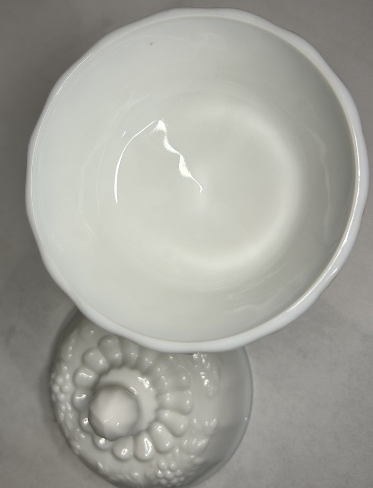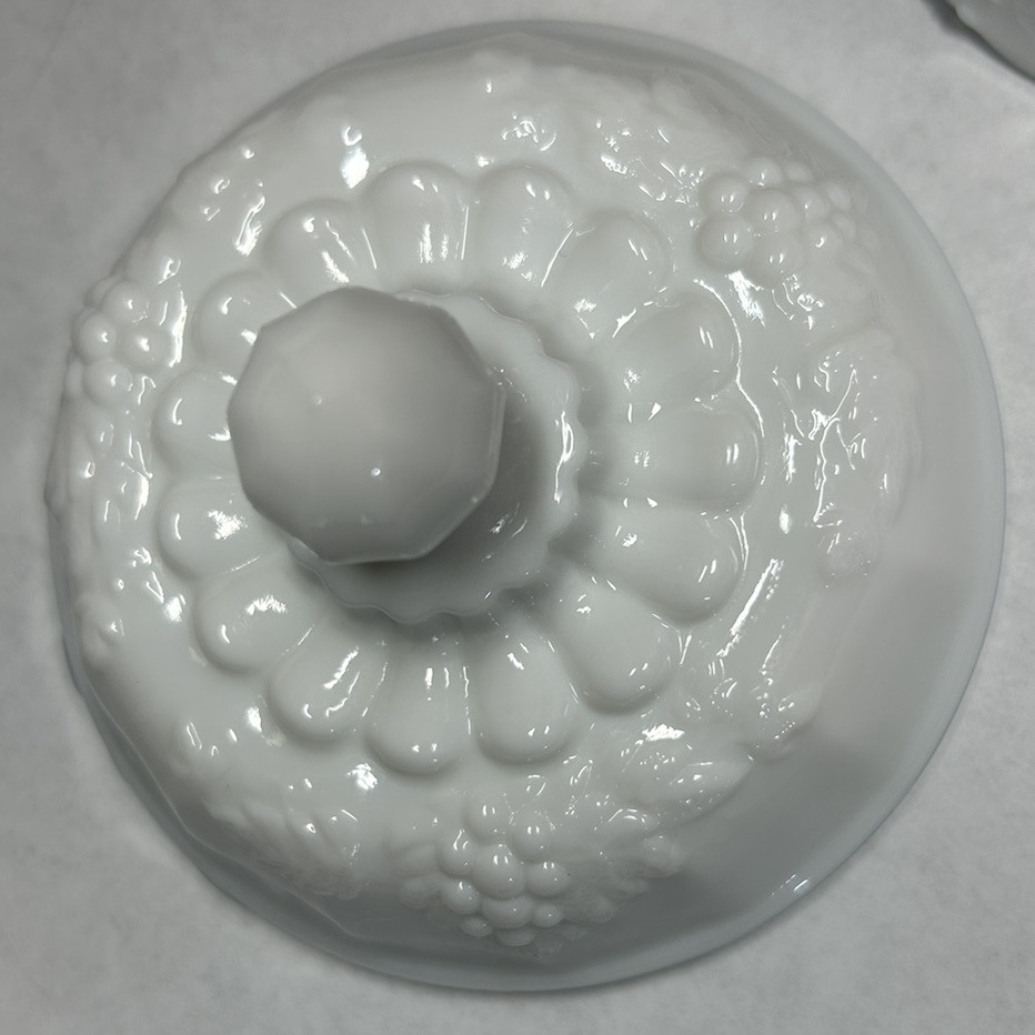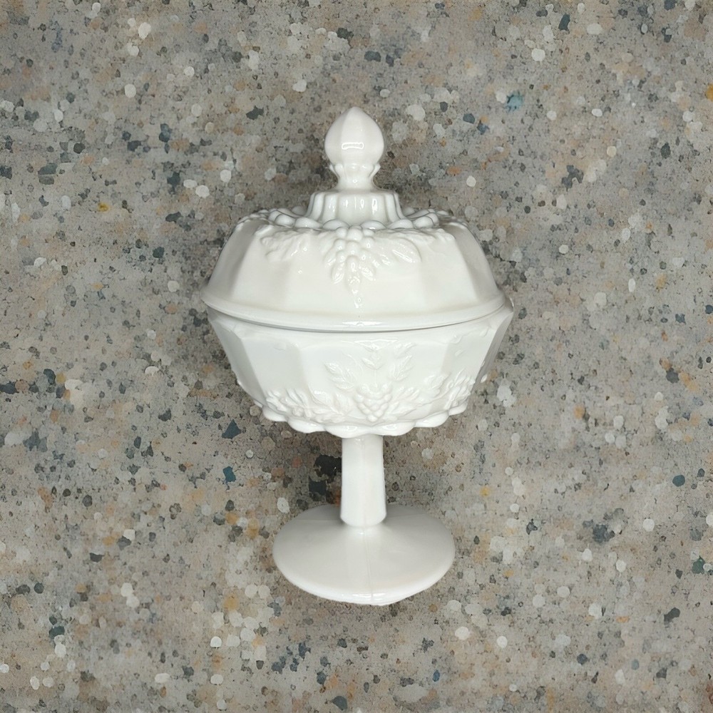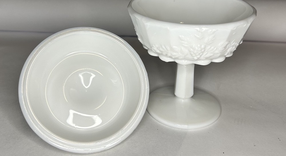 Antique:NoCountry/Region of Manufacture:United StatesBrand:WestmorelandItem Height:7 inType:Candy DishOrigin:Jeannette, PennsylvaniaNumber of Items in Set:2MPN:does not applyStyle:Mid-Century ModernVintage:YesTheme:grapesPackaging:UnboxedModel:Grape PedestalMaterial:Glass, Milk GlassProduction Technique:Fused GlassItem Weight:1 pound, 10 ouncesItem Diameter:4 1/2 inFeatures:Decorative, Lid IncludedHandmade:NoProduct Line:Paneled GrapeProduction Style:Milk GlassBackstamp:Impessed on the inside of the lidColor:WhiteOriginal/Licensed Reproduction:OriginalYear Manufactured:1950Time Period Manufactured:1950-1959Manufacturer Warranty:NonePattern:Paneled GrapeShape:RoundNumber of Compartments:1Care Instructions:Hand Wash OnlyFinish:Glossy
