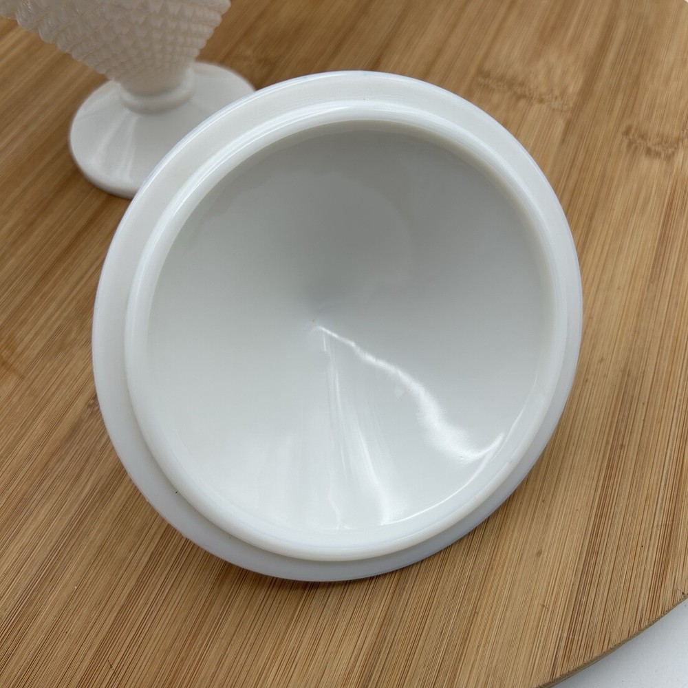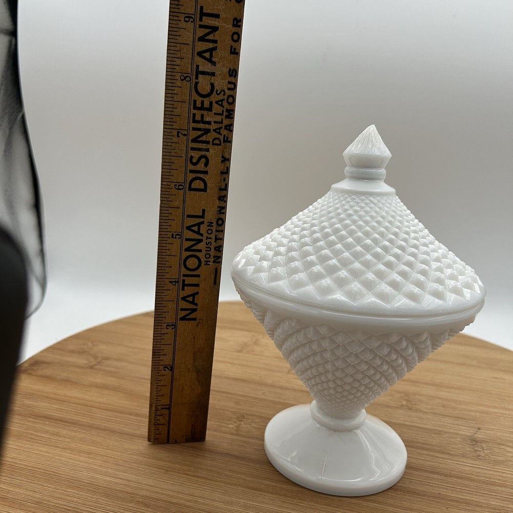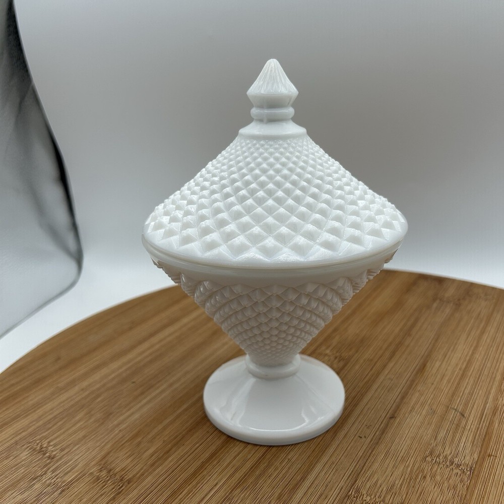 This vintage candy dish from Westmoreland is a timeless piece that will add elegance to any home. The dish features a beautiful English Hobnail pattern on white milk glass, making it a perfect display item for any room. It was manufactured in the 1950s and has a production style that is sure to impress. The dish is made of glass and is perfect for serving candy, desserts, or even as a decorative piece. Its brand, Westmoreland, is known for producing high-quality glassware with intricate patterns. This candy dish is a must-have for any collector or home decor enthusiast.