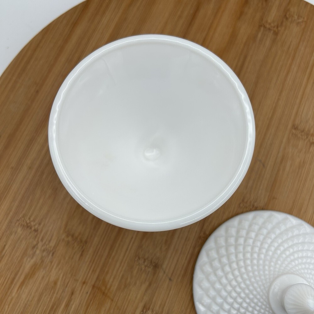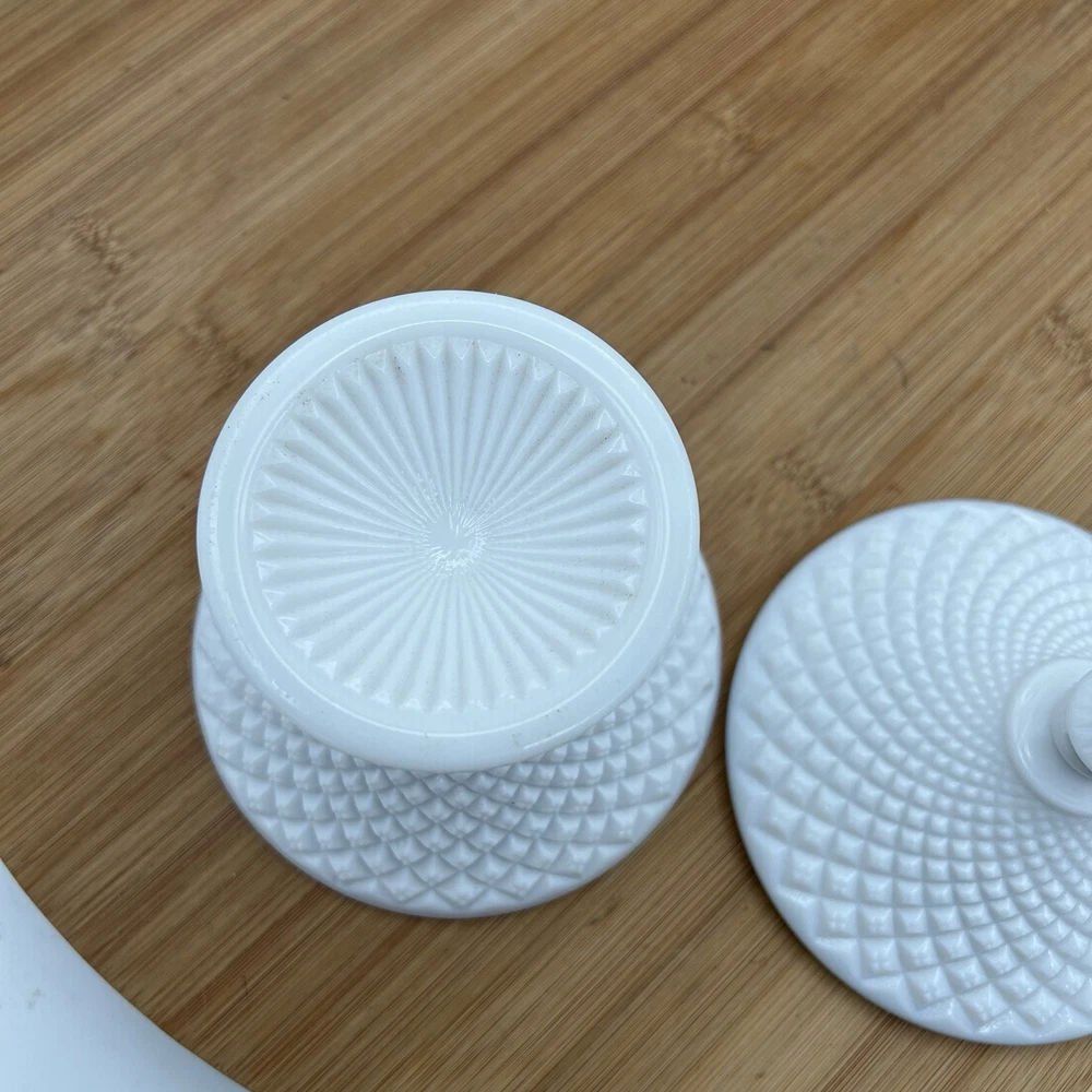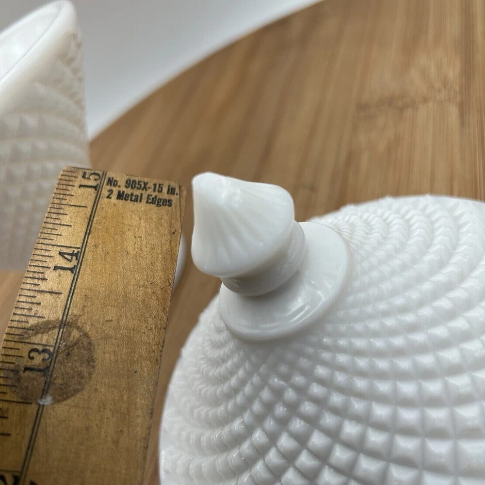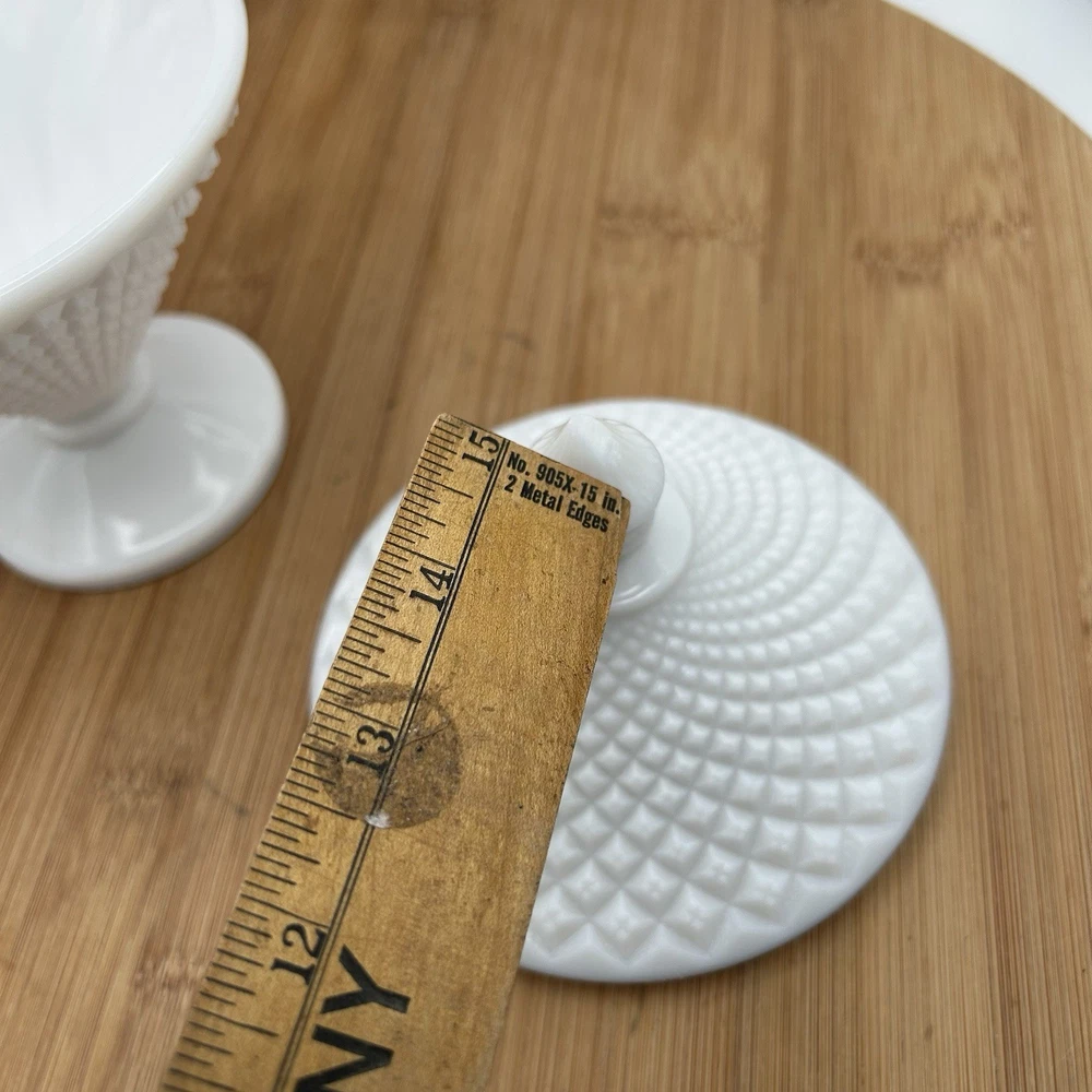 This vintage candy dish from Westmoreland is a timeless piece that will add elegance to any home. The dish features a beautiful English Hobnail pattern on white milk glass, making it a perfect display item for any room. It was manufactured in the 1950s and has a production style that is sure to impress. The dish is made of glass and is perfect for serving candy, desserts, or even as a decorative piece. Its brand, Westmoreland, is known for producing high-quality glassware with intricate patterns. This candy dish is a must-have for any collector or home decor enthusiast.