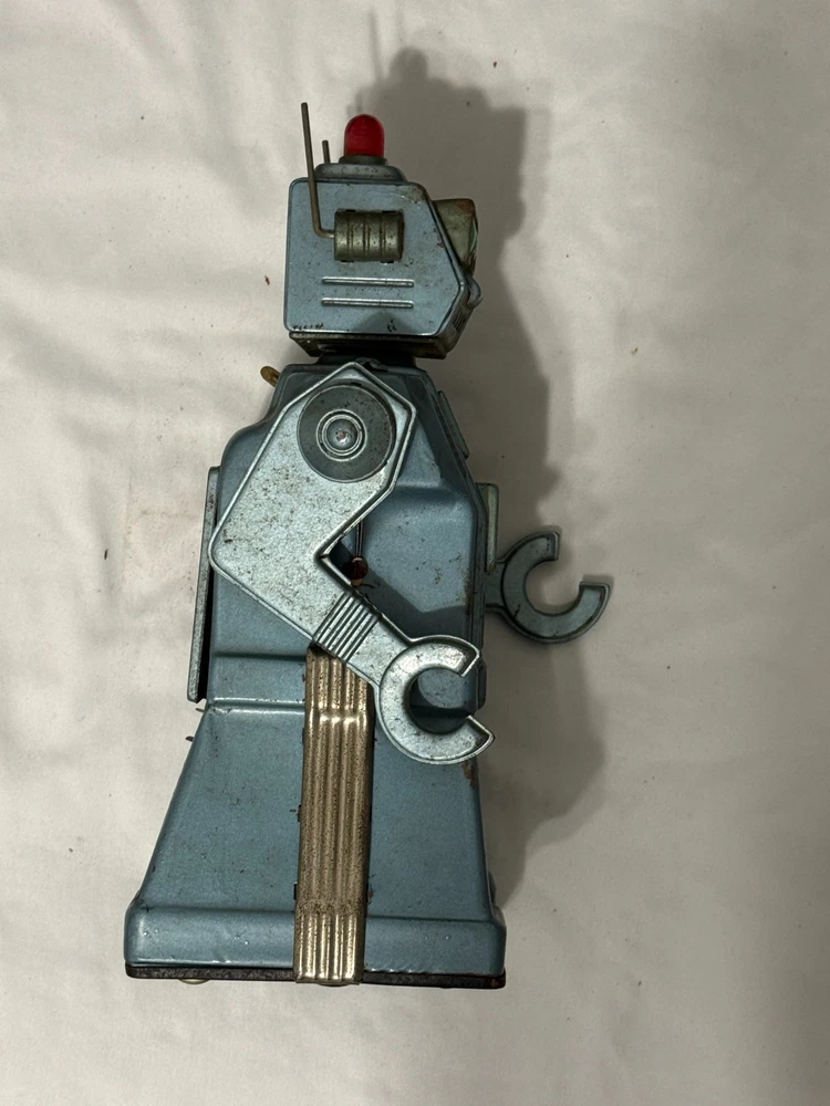 Offered for sale is an authentic vintage Japanese tin robot manufactured by Yonezawa in the 1950s , a highly collectible piece from the golden era of Japanese mechanical toys. This robot features classic mid-century design with lithographed control panel details, green eye lenses, red dome head light, and articulated arms including a claw-style hand. A strong example of early post-war Japanese tin toy production. Key Details: Brand: Yonezawa Origin: Japan Period: 1950s Material: Lithographed tin Markings: “Made in Japan” visible on chest Mechanism: Battery-operated (not tested) Condition: Untested – no battery test has been performed, functionality unknown Shows age-related wear , including surface scratches, oxidation, and minor paint loss Structurally solid with good display presence Original components appear intact Important Note: This item is sold as-is , as a collectible display piece. Due to its age, no guarantee is made regarding operation. Why This Piece Matters: Yonezawa robots from this era are increasingly scarce and highly sought after by advanced collectors of Japanese tin toys. The design, proportions, and surviving original parts make this a strong candidate for both display and restoration. Shipping & Handling: Carefully packed to ensure safe delivery International shipping available