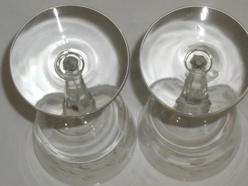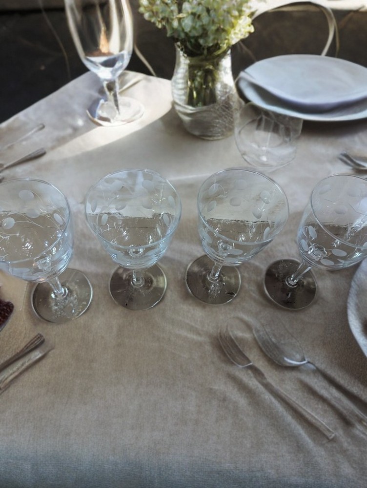 Elevate your table setting with this set of four Libbey Carlton Dots water goblets. The clear gray design adds a touch of elegance to any occasion, whether it's a formal dinner or a casual lunch. The round shape and two-piece set make them perfect for everyday use. These vintage original glasses were made in the USA in 1955 and are in excellent condition. The goblets are signed and have a unique pattern of dots that make them stand out from other drinkware. They are made of high-quality glass and are perfect for all occasions. This set is a must-have for any collector or those who appreciate the beauty of vintage glassware.